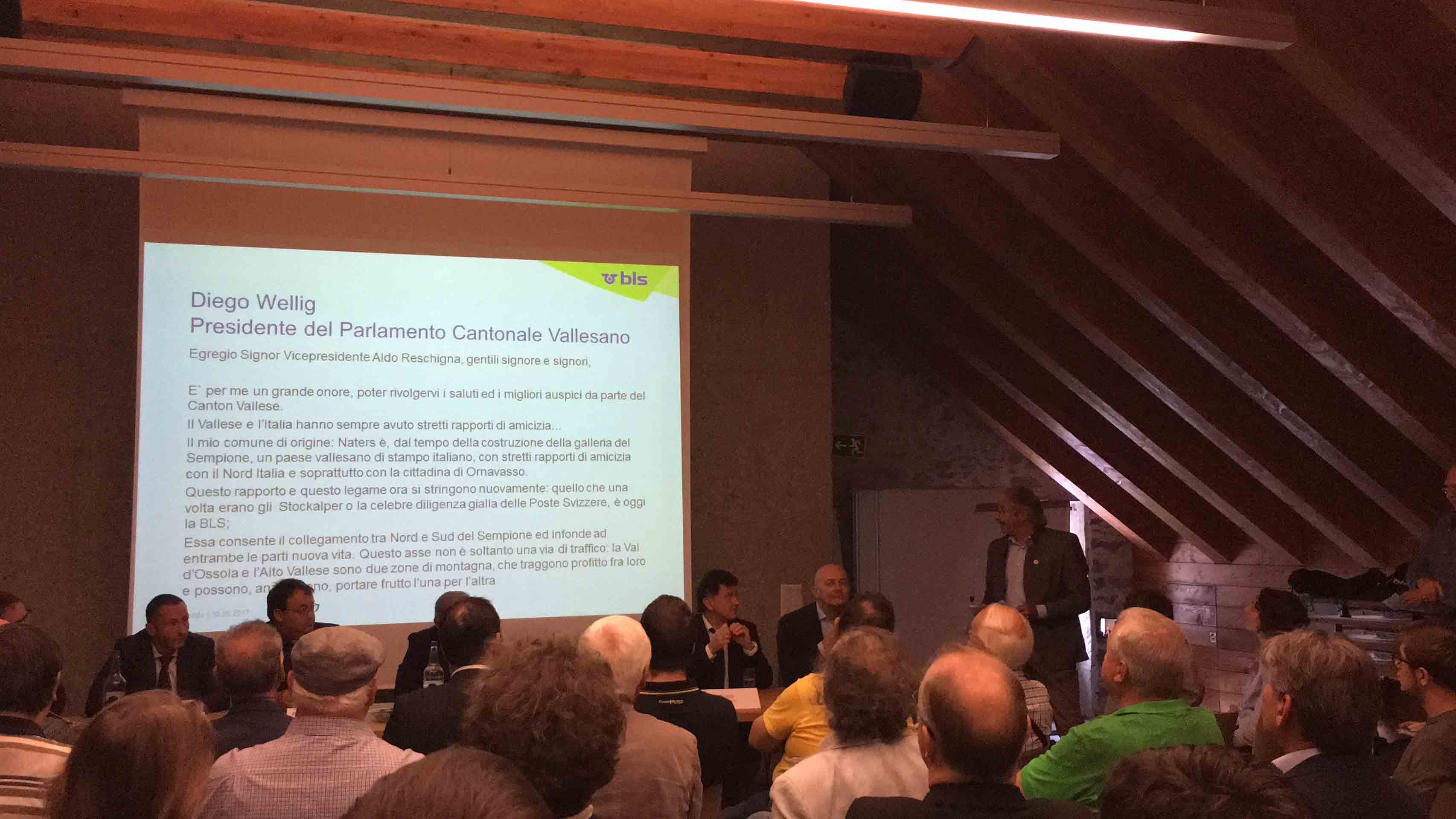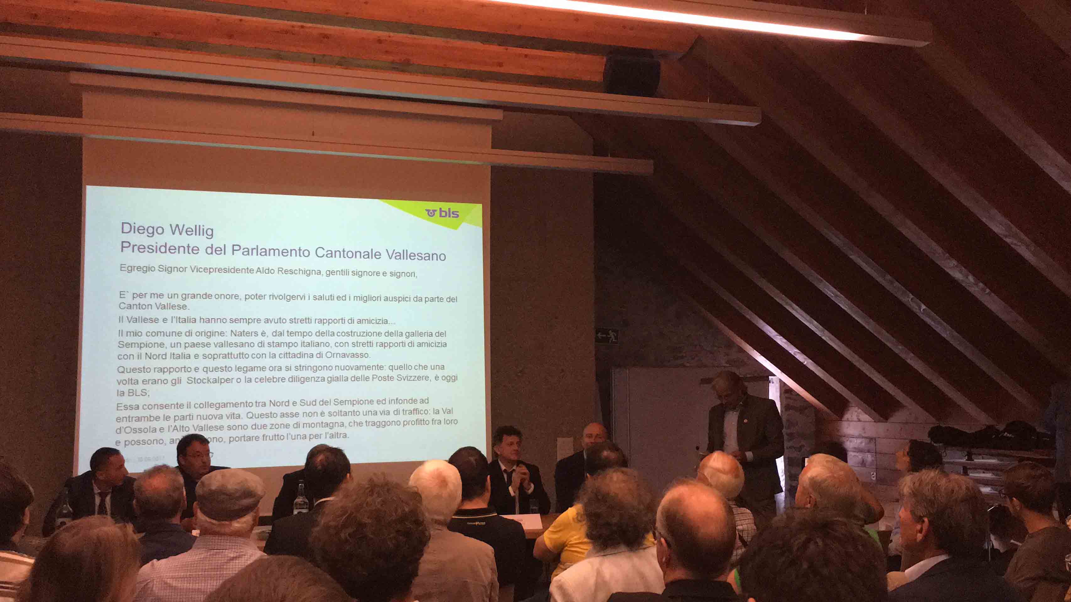 GONDO-30-06-2017- Nella splendida torre di Stockalper a Gondo, alla presenza delle autorità svizzere ed italiane, si è celebrato questa mattina l'importante obbiettivo di Bls, le ferrovie svizzere del Trenino Verde delle Alpi, che dal prossimo fine settimana viaggeranno tra Briga e Domodossola con cadenzamento biorario. "Puntiamo a rafforzare i legami tra i due paesi - ha spiegato il vicepresidente della regione Piemonte Aldo Reschigna, - un unione più stretta di queste zone di montagna le rende più forti e può portare con sé un forte sviluppo economico. Il progetto BLS era nato come un progetto destinato ai frontalieri, ma col tempo si è trasformato in un progetto utilissimo anche allo sviluppo turistico". Diego Willig, presidente del Grande Consiglio del Cantone: “Sarà un vantaggio sia per il traffico pendolare che per quello turistico. Per fare un passo avanti nel turismo però non basta il collegamento di treni che funziona, occorre di più, ad esempio sentieri migliori dalle due parti del Sempione e soprattutto un proseguimento del sentiero Stockalper fino a Domodossola, e perché no, attraverso la Valle Vigezzo fino a Locarno, a Stresa oppure Arona. Solo quando si riconoscerà che siamo un unica regione potremo crescere insieme. Cosa può desiderare di più un turista che avere da un lato le amenità dello stile di vita italiano e con un viaggio di soli 30 minuti trovarsi nel cuore delle Alpi sul più lungo ghiacciaio d'Europa? Questo ha potenziale, questo ha futuro!”