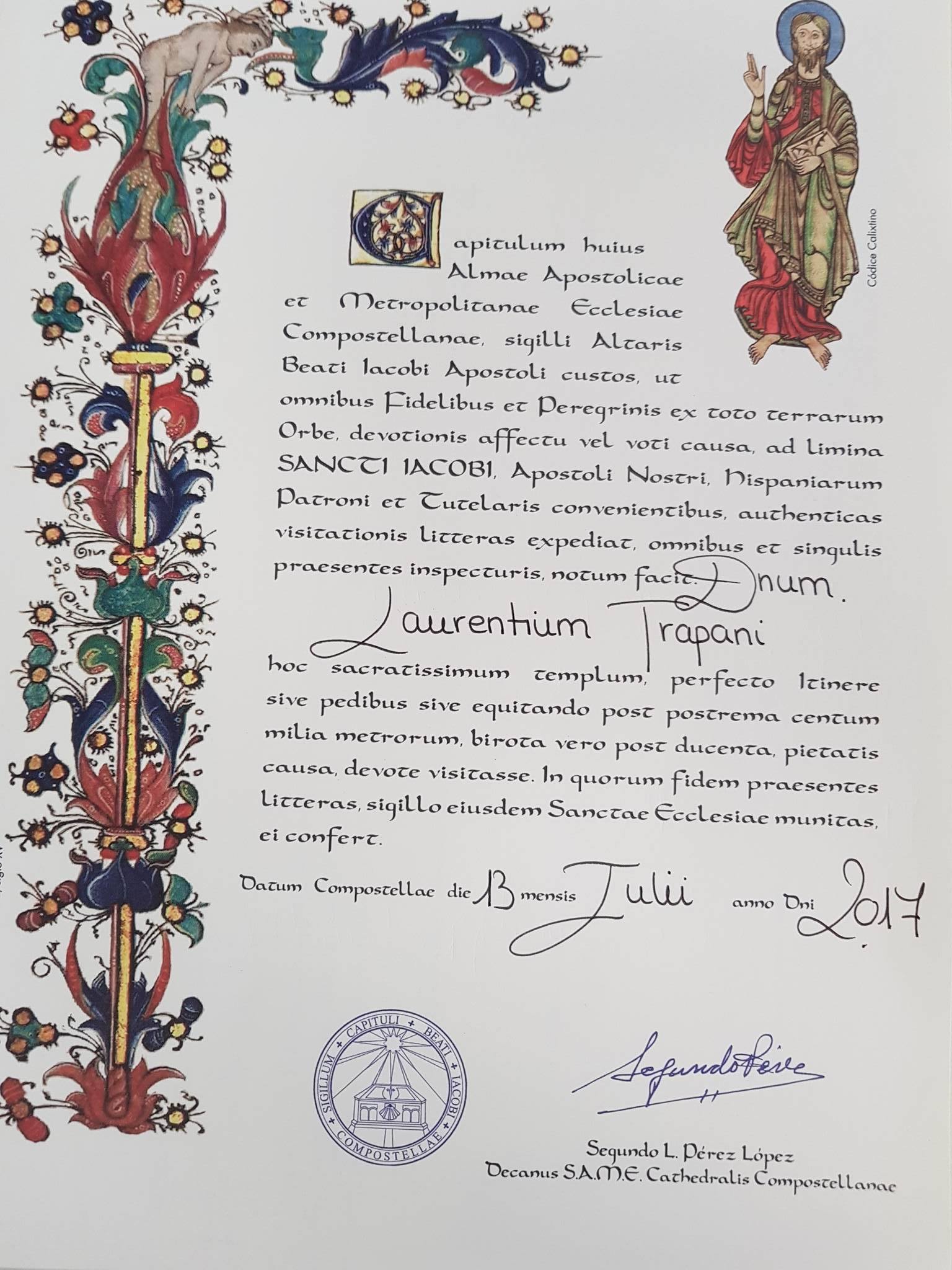 SANTIAGO-14-07-2017- Sono arrivati finalmente a Santiago di Compostela i 27 pellegrini domesi. Gli ultimi 347 km da Reliegos alla meta a piedi. Tappa faticosissima... in notturna! Partiti alle 23 di mercoledì 12 da Arzua per non dover affrontare di giorno il caldo spagnolo sono arrivati giovedì 13 luglio mattina alle 8. Ieri quindi i primi riti del pellegrino: l'abbraccio al santo e la richiesta di preghiere, e la richiesta della Compostela. Il primo emozionante e suggestivo: si salgono i gradini all'altare maggiore in cattedrale e si abbraccia fisicamente la statua di San Giacomo. A lui si bisbigliano le proprie intime richieste. Il secondo presso l'ufficio di accoglienza dei pellegrini per l'apposizione dell'ultimo timbro e la consegna dell'attestato ufficiale. Dice Lorenzo Trapani di 13 anni "Mi é piaciuto molto camminare in solitudine e pensare. La fatica diventa quasi un'emozione quando ci si avvicina alla meta!" e Gabriele Carbone, 13 anni: "la fatica maggiore è stata la tappa da Villar ad Astorga per il caldo e perché le gambe iniziavano a cedere".