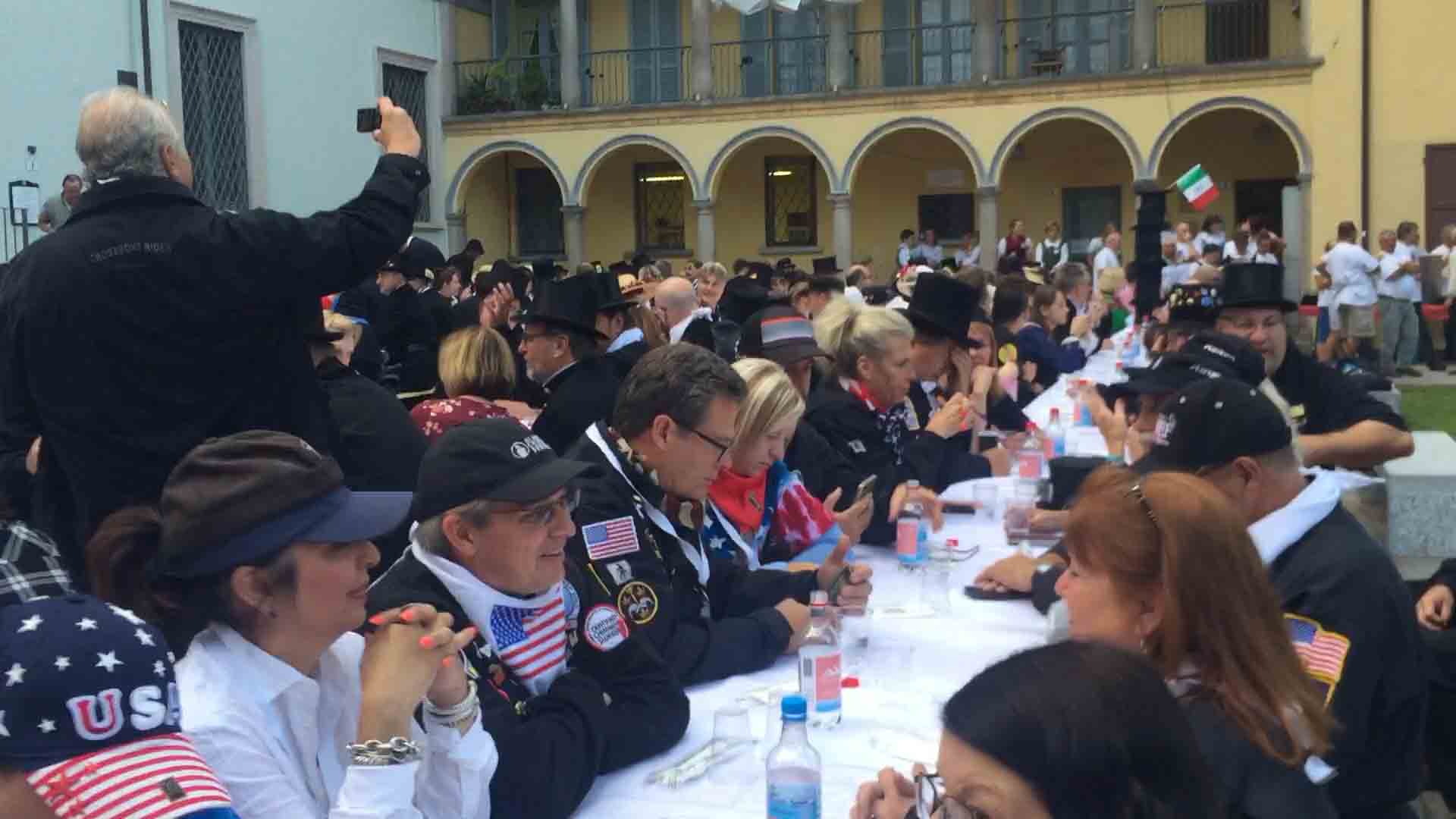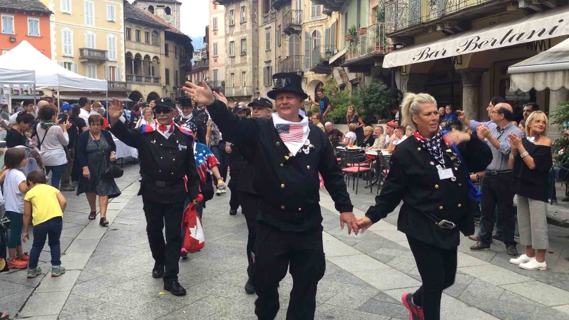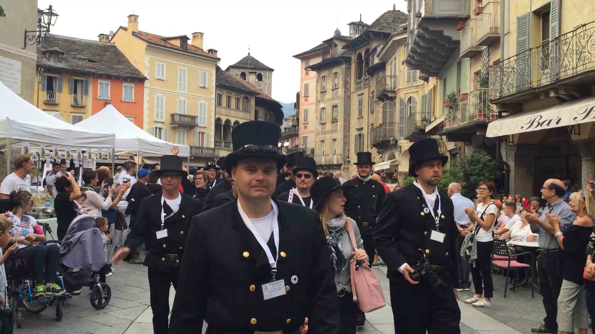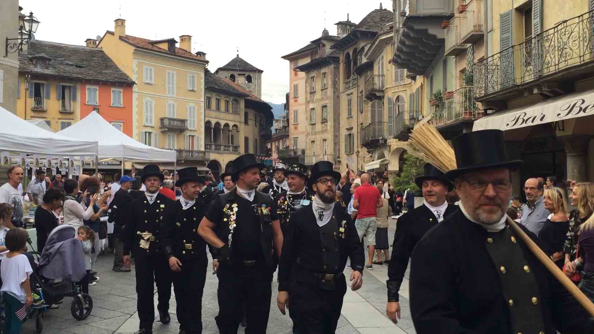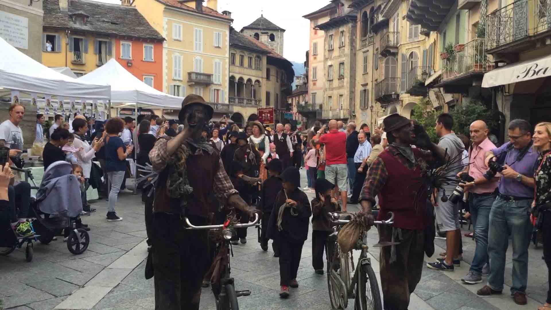 di festa, ma ancora carichi della consueta allegria, gli spazzacamini provenienti da tutto il mondo che hanno partecipato al raduno vigezzino di domenica hanno sfilato lunedì sera per le vie domesi, accolti da una Domodossola incuriosita e scesa in piazza per il contemporaneo evento di Tastem Insema. Gli spazzacamini, giunti con il trenino della Vigezzina, si sono radunati in piazza stazione ed hanno sfilato per la città salutando la folla e regalando caramelle ai bambini, marciando insieme al Civico Corpo Musicale ed alla Corte di Mattarella del Comitato Polenta e Sciurii. Dopo avere attraversato tra due ali di folla Piazza Mercato è stata l'ora della cena, con le cinque lunghe tavolate approntate dalla Pro Domo e dalle altre associazioni che collaboravano all'evento in piazza Rovereto. Gli uomini in nero, al consueto grido "Spazzacaminooo!", e sempre disponibili per una foto, hanno approfittato poi della festa in piazza, unendosi alle degustazioni, specie quelle di vino e birra.