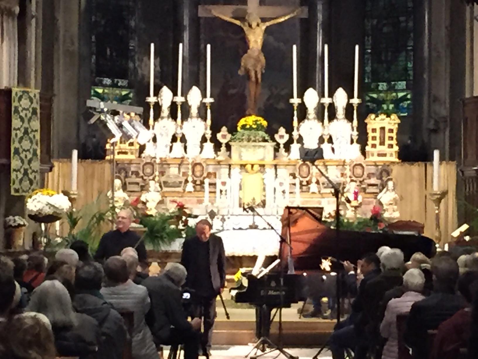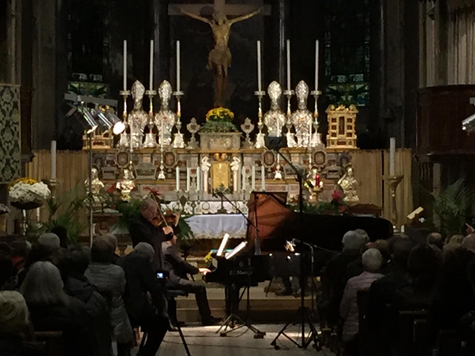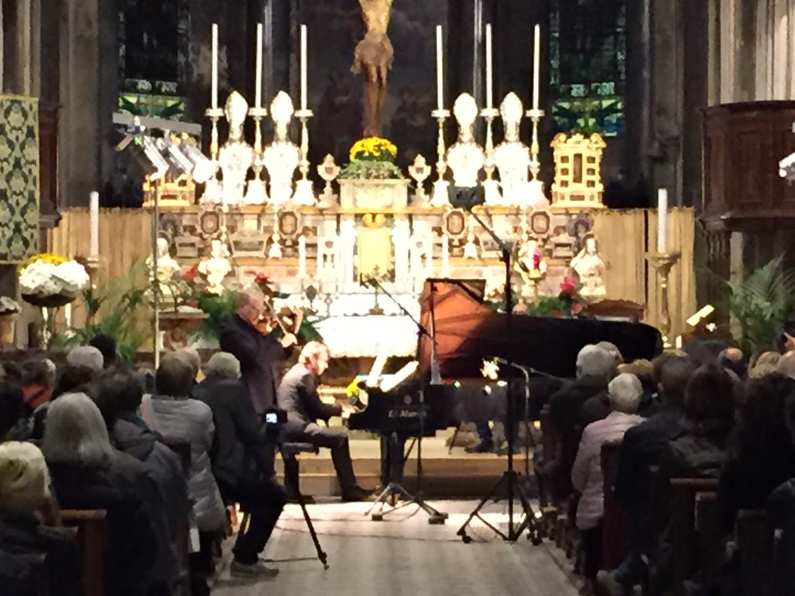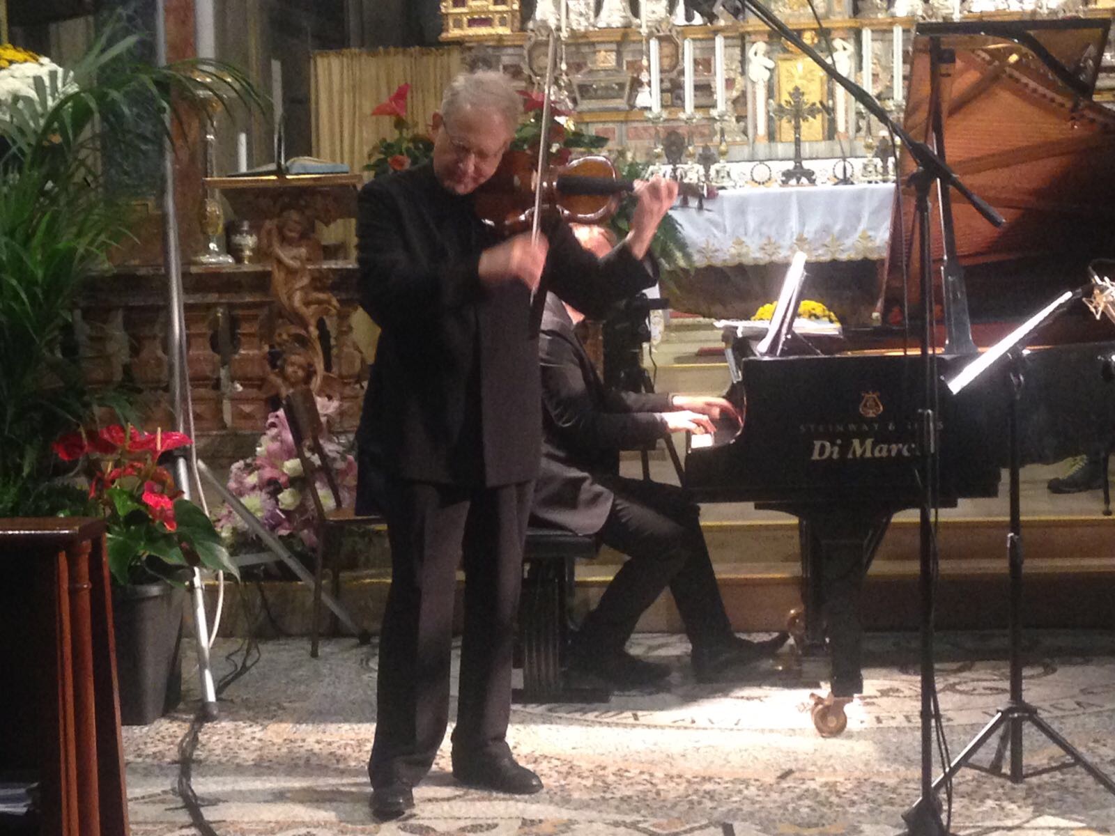 anche nelle navate laterali e le cappelle aperte, la chiesa Collegiata domese sabato sera per un evento di rilievo internazionale, ovvero il concerto proposto dall'Associazione Mario Ruminelli per festeggiare la nascita della Fondazione Paola Angela Ruminelli presieduta da Antonio Pagani. La serata ha visto insieme due musicisti famosi: Shlomo Mintz uno dei più grandi violinisti contemporanei che ha calcato come solista e come direttore il palcoscenico dei più celebri teatri del mondo, e Roberto Prosseda, famoso interprete del pianoforte romantico, in particolare di Chopin e di Mendelssohn, che ha raccolto riconoscimenti in tutto il mondo. Il concerto è stato introdotto dal neo presidente dell'associazione Massimo Gianoglio: “I due artisti – ha spiegato Gianoglio - da tempo avevano manifestato il desiderio di esibirsi insieme e l’occasione si è presentata proprio con il concerto inaugurale della Fondazione Ruminelli”. Prosseda ha raccontato di essere andato in Perù per preparare il concerto in quanto Mintz era impegnato Sud America in tournée. I due musicisti hanno incantato per due ore il numeroso pubblico con i pezzi di Felix Mendelssohn, Sonata MWV Q 12, in fa minore e Sonata MWV Q 26, in fa maggiore e di Cesar Franck, Sonata in la maggiore. Come brano conclusivo è stato eseguito un pezzo scritto da Shlomo Mintz, Sonata in do maggiore. L’Associazione Culturale “Mario Ruminelli” è stata fondata nel 2015 per volontà della professoressa Paola Angela Ruminelli, residente a Genova, morta nel 2016, discendente da una famiglia di musicisti fortemente legata a Domodossola. Giulio Ruminelli, nonno di Paola, era di Torre del Lago, amico di Giacomo Puccini, trasferitosi da giovane a Domodossola dove fu per decenni direttore del Civico Corpo Musicale, organista della Collegiata e creatore di una Scuola di Pianoforte nella sua casa in via Galletti. Suo figlio Mario, padre di Paola, divenne un insigne violinista, insegnando al Conservatorio di Brescia, dove nacque Paola, fino al trasferimento a Genova dove divenne primo violino al Teatro Carlo Felice. Paola è vissuta a Domodossola nel periodo bellico, frequentandovi le scuole elementari. L’Associazione si propone quindi di organizzare eventi in città e per lo più gratuiti, per aderire e rispettare la volontà della fondatrice e finanziatrice.