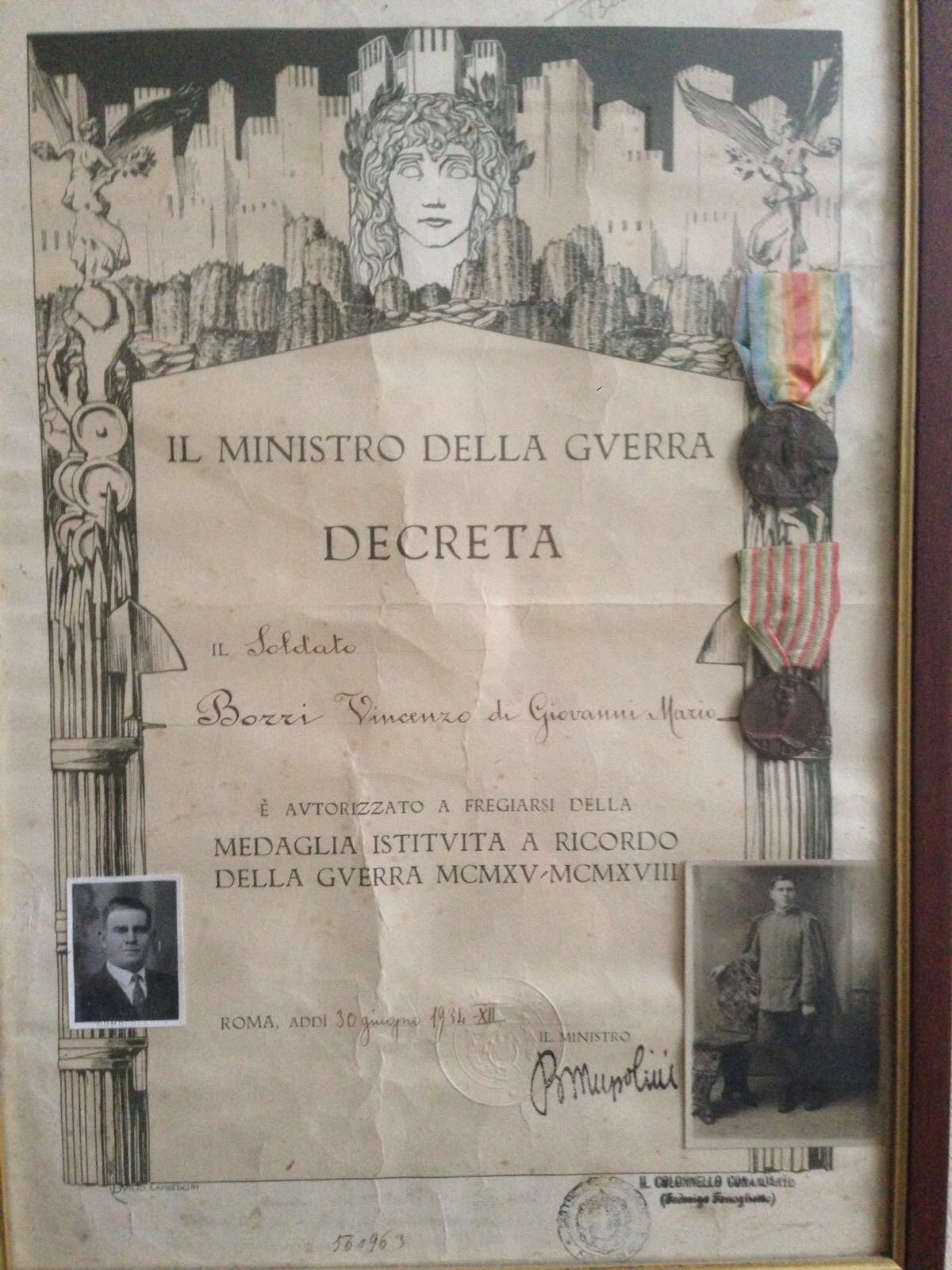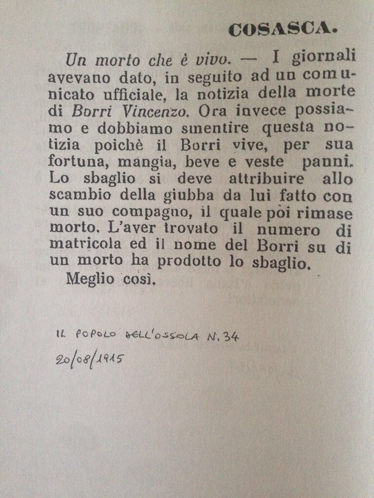 dalla prima guerra mondiale, e cento anni dalla battaglia di Caporetto. Stampa e televisioie stanno dando ampio spazio a celebrazioni, ricostruzioni. La mia attenzione ieri 4 novembre giornata delle Forze armate e dell'Unità nazionale si è soffermata su un oggetto appartenuto a mio nonno che ha combattuto al fronte. Si tratta di bracciale come si usa dire di Trench art (o arte di trincea) uno stile in voga tra i soldati che nelle varie guerre “ammazzavano il tempo” realizzando oggetti con gli avanzi di artiglieria. Spesso con data e luogo. Sul bracciale, che ho da poco ritrovato in una vecchia scatola, è inciso il nome di mio nonno Borri Vincenzo e ricordo delle Topette. Il bracciale voleva quindi ricordare il Passo delle Topette teatro di battaglia nella prima guerra mondiale. Non ho conosciuto mio nonno che è sopravvissuto alla Grande guerra, morì l'anno prima che io nascessi. I miei genitori e mia nonna mi dissero che non amava ricordare quegli anni quindi le storie di amicizia, di morte, di sofferenza e di straordinario coraggio le posso solo immaginare guardando i cimeli, le medaglie le foto e un curioso trafiletto di un giornale locale che nel 1915 si occupò di mio nonno. L'articolo fu pubblicato da “ Il Popolo dell'Ossola” il 20 agosto 1915 e ne sono venuta a conoscenza qualche anno fa grazie all'opera di raccolta di articoli di vecchi giornali curata da Umberto De Petri. Eccolo : “Un morto che è vivo- I giornali avevano dato in seguito ad un comunicato ufficiale, la notizia della morte di Borri Vincenzo. Ora invece possiamo e dobbiamo smentire questa notizia poiché il Borri vive, per sua fortuna, mangia, beve e veste panni. Lo scambio si deve attribuire allo scambio della giubba da lui fatto con un suo compagno, il quale poi rimase morto. L'aver trovato il numero di matricola e il nome del Borri su di un morto ha prodotto lo sbaglio. Meglio così”. Comunque sia che si tratti di una foto di un cimelio o anche solo di un racconto ascoltato tutto è utile per non dimenticare i nostri nonni o bisnonni che hanno combattuto nella speranza di poter garantire a noi tutti un futuro migliore.