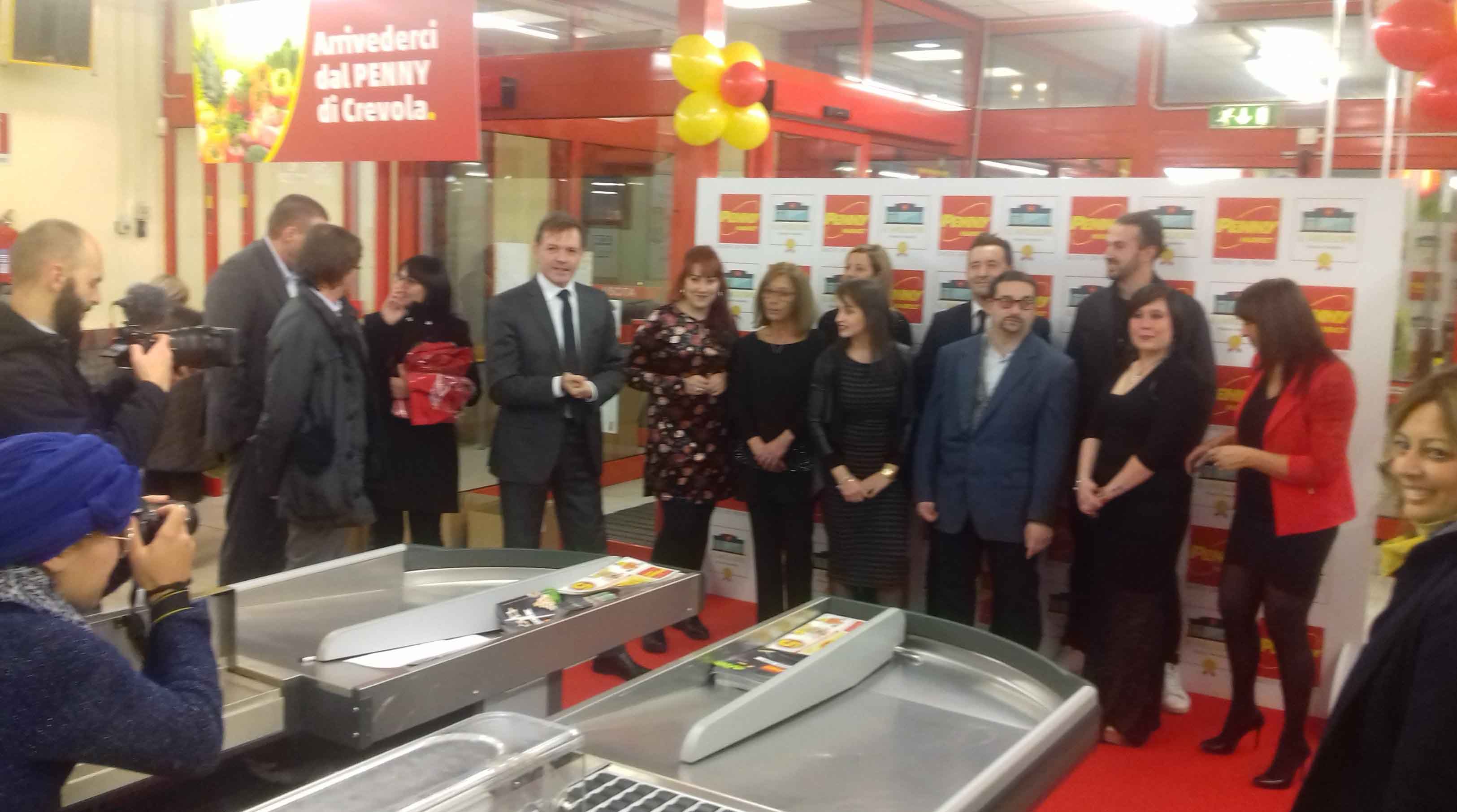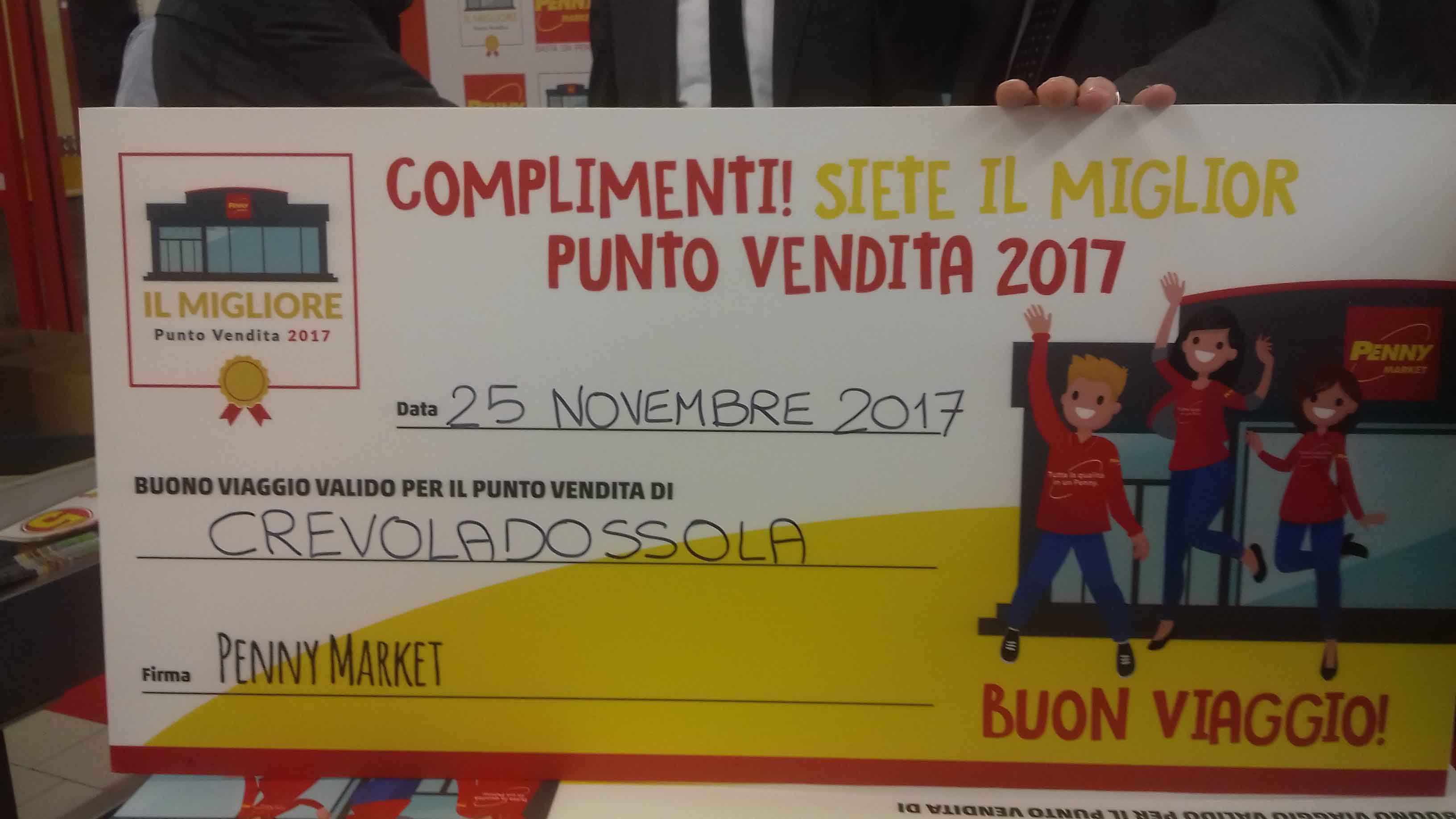 DOMODOSSOLA- 26-11-2017- Il Penny Market di Crevoladossola è il miglior punto vendita in Italia della nota catena commerciale tedesca. La premiazione ha avuto luogo sabato 25 novembre alle 17,30 alla presenza di tutto il personale, dei due responsabili del supermercato, Davide e Maria Teresa, del responsabile di zona per il Verbano e l'Ossola e del responsabile risorse umane di Penny Market Italia. L'evento è stato trasmesso in diretta da Penny Fm, l'emittente radiofonica interna della catena, a livello nazionale. Ai dipendenti come premio è stato assegnato un viaggio di due giorni a Vienna, con visita alla sede di Penny Fm, oltre a una nuova maglia con il logo Penny Team Il migliore punto vendita 2017, da indossare sul luogo di lavoro. La catena Penny Market è arrivata in Italia nel 1994 aprendo il primo supermercato a Cremona; nella seconda metà degli anni 90 ha aperto i punti vendita di Domodossola, Crevoladossola e Villadossola.