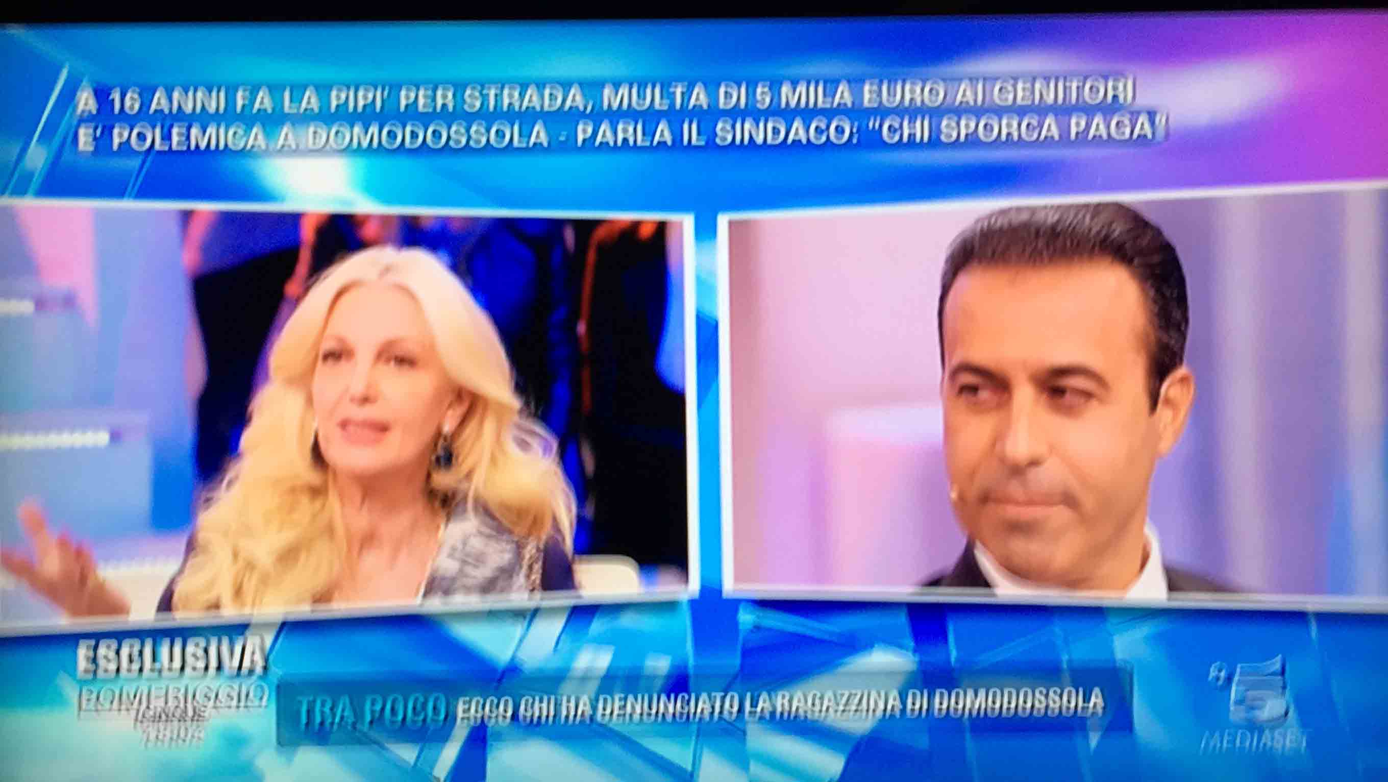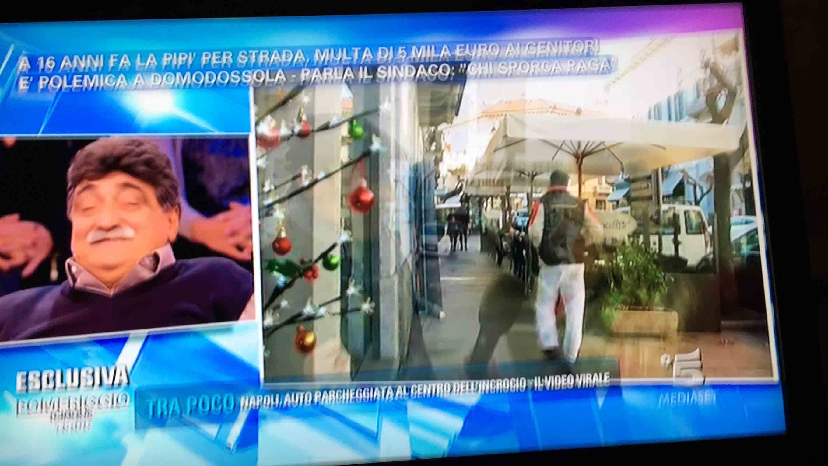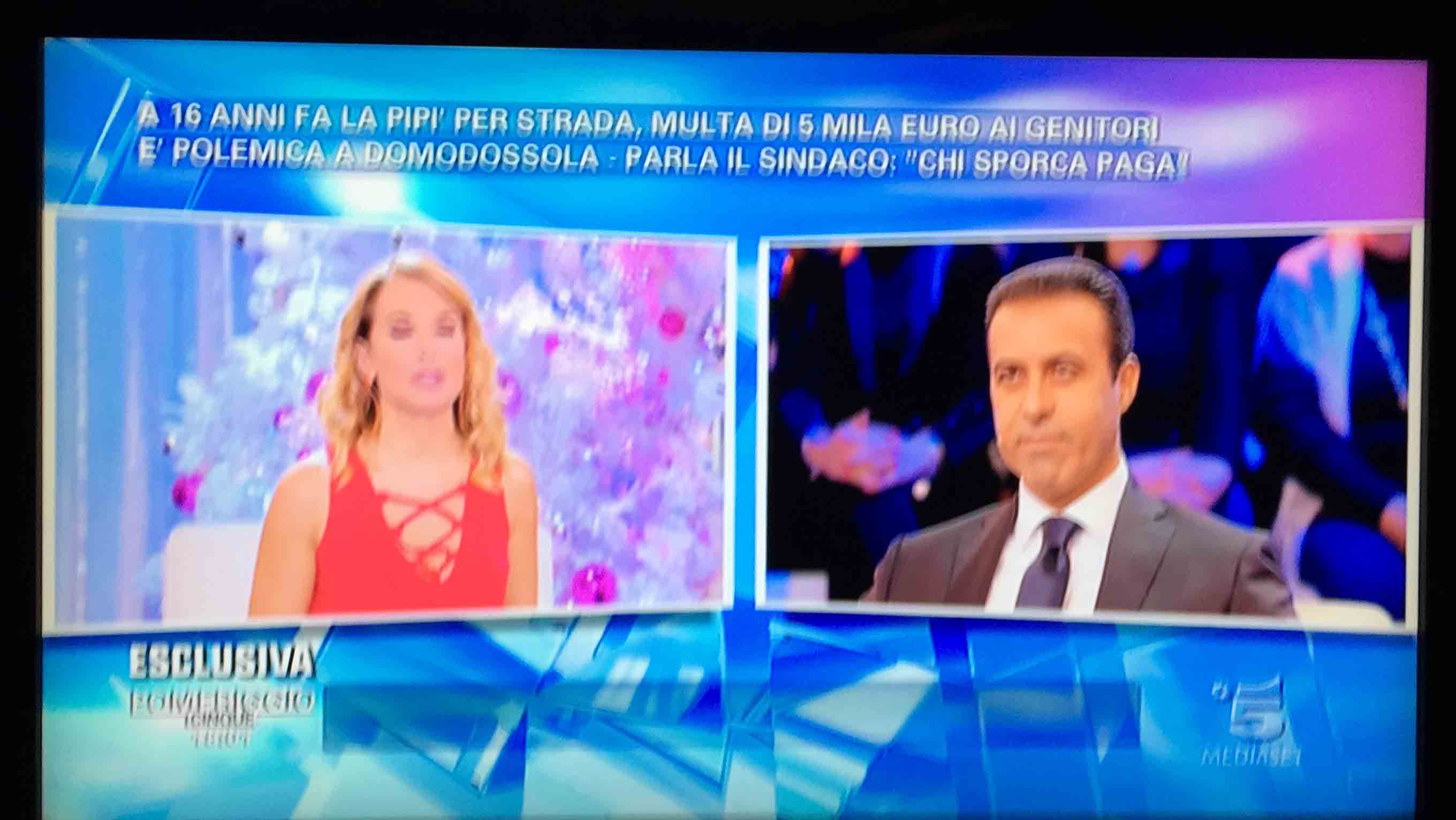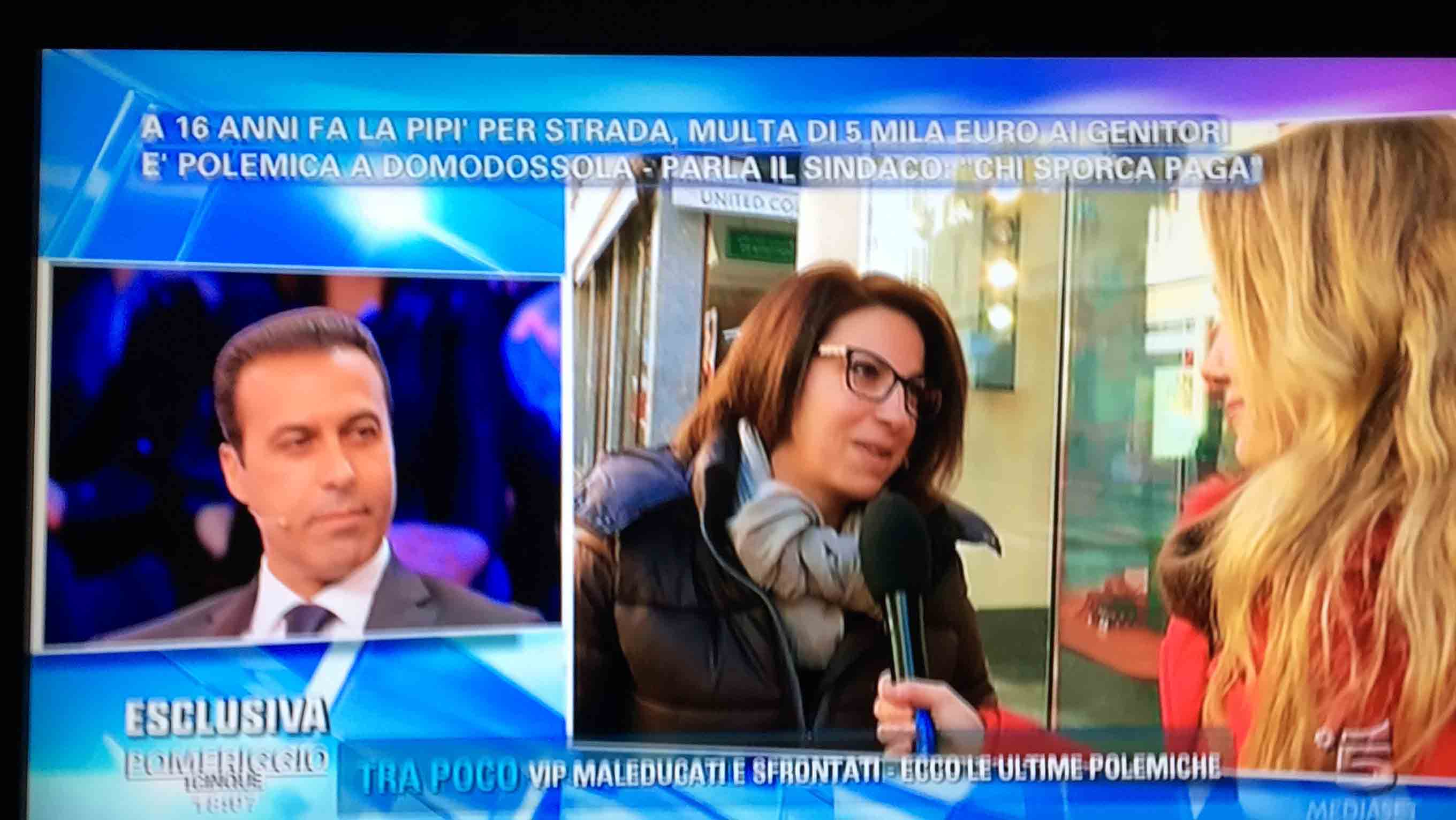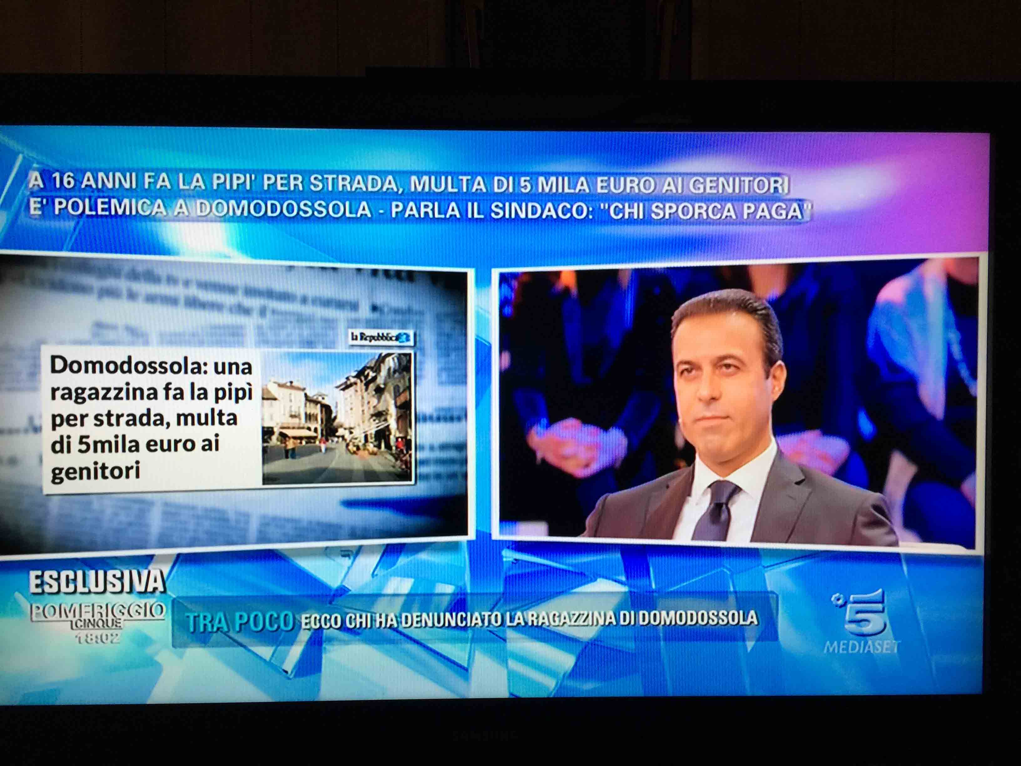 per il sindaco domese Lucio Pizzi, invitato da Barbara D'urso a Pomeriggio 5, popolare trasmissione sulla rete ammiraglia Mediaset, per parlare della multa di 5 mila euro inflitta ai genitori di una ragazzina sedicenne che ha fatto pipì in piazza Mercato. I giornalisti di Canale 5 hanno intervistato un barista di piazza Mercato, che ha spiegato che è stata la donna delle pulizie del suo bar a denunciare la giovane, ed in seguito alla denuncia la polizia locale ha effettuato le indagini, riconoscendo dai video delle telecamere di sicurezza i due amici che erano con la ragazzina, e quindi riuscendo poi ad identificarla e multarla. Il barista ha spiegato che la giovane si è messa tra i tavolini del bar a fare la pipì, intorno alle 4,30 di notte, e che la donna delle pulizia l'ha sgridata, a quel punto si sono intromessi i due amici della ragazzina, che avrebbero inveito contro la donna delle pulizie. In trasmissione molti opinionisti hanno animato la discussione, evidenziando la mancanza di bagni pubblici, la disparità di sanzione rispetto ai 400 euro inflitti alla donna che non aveva raccolto la deiezione del suo cane. In una serie di interviste effettuate ad alcuni passanti in centro a Domo in molti hanno confessato di avere fatto, almeno una volta nella vita, la pipì in strada. Pizzi ha spiegato che la sanzione è quella prevista per legge, ed ha fatto notare a chi obbiettava che era "pericoloso" venire a visitare Domo, che "basta rispettare la legge".