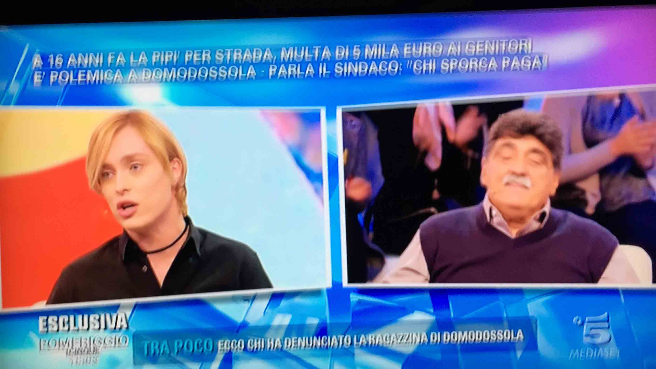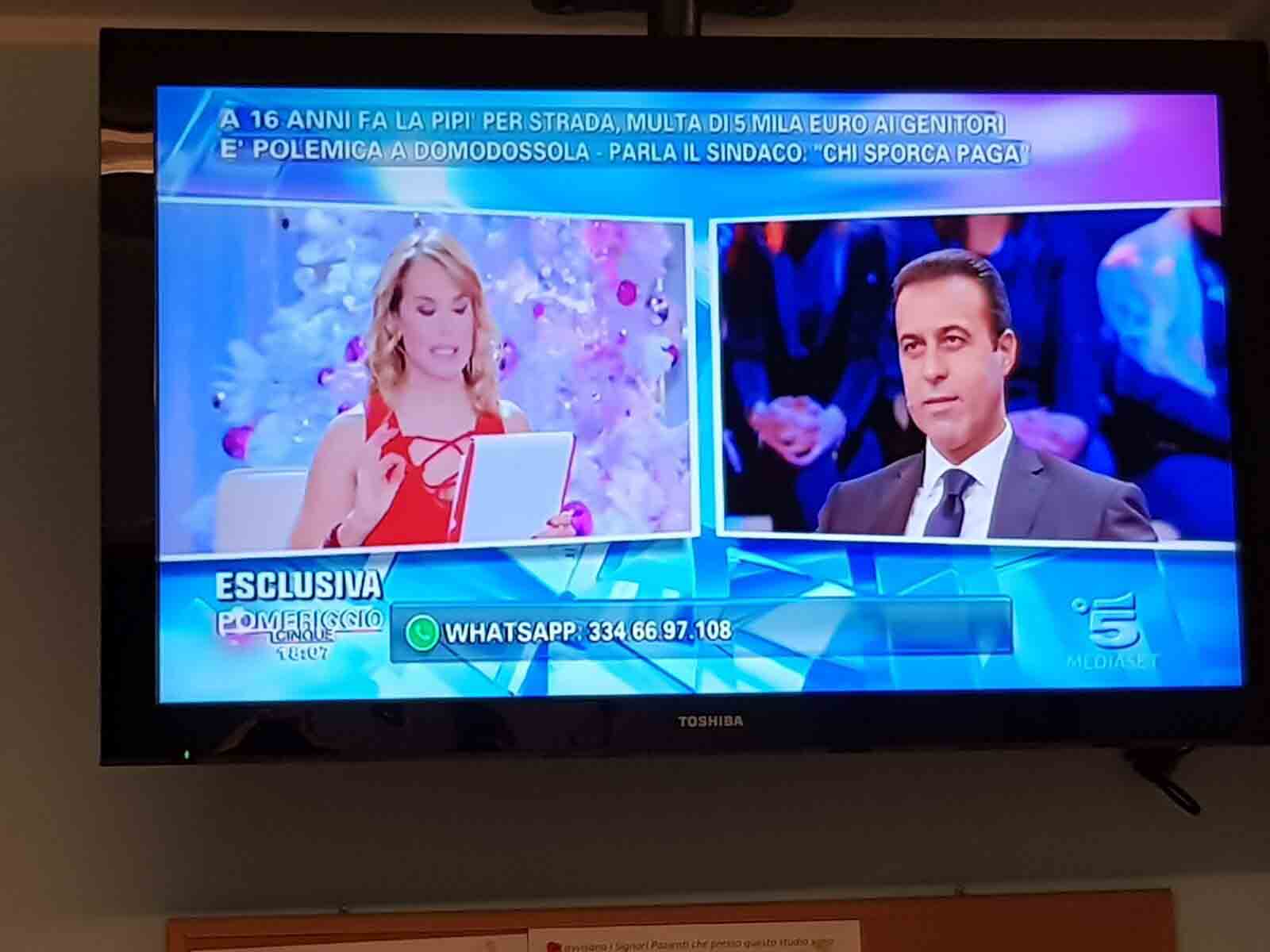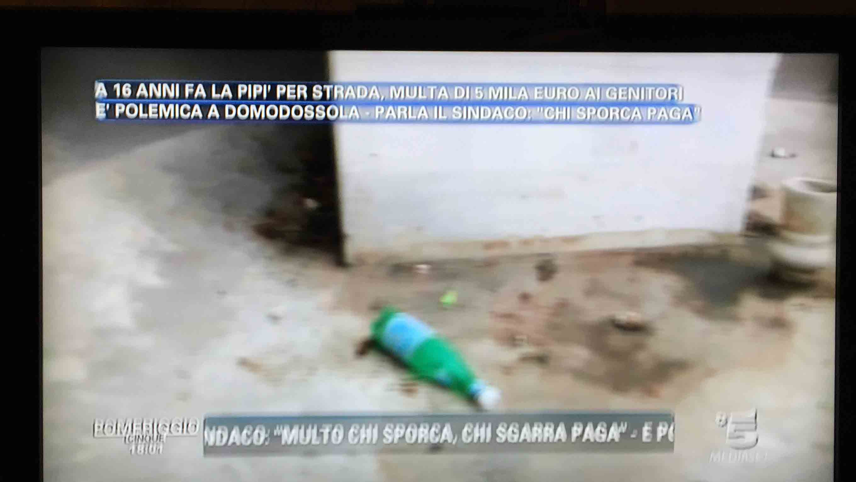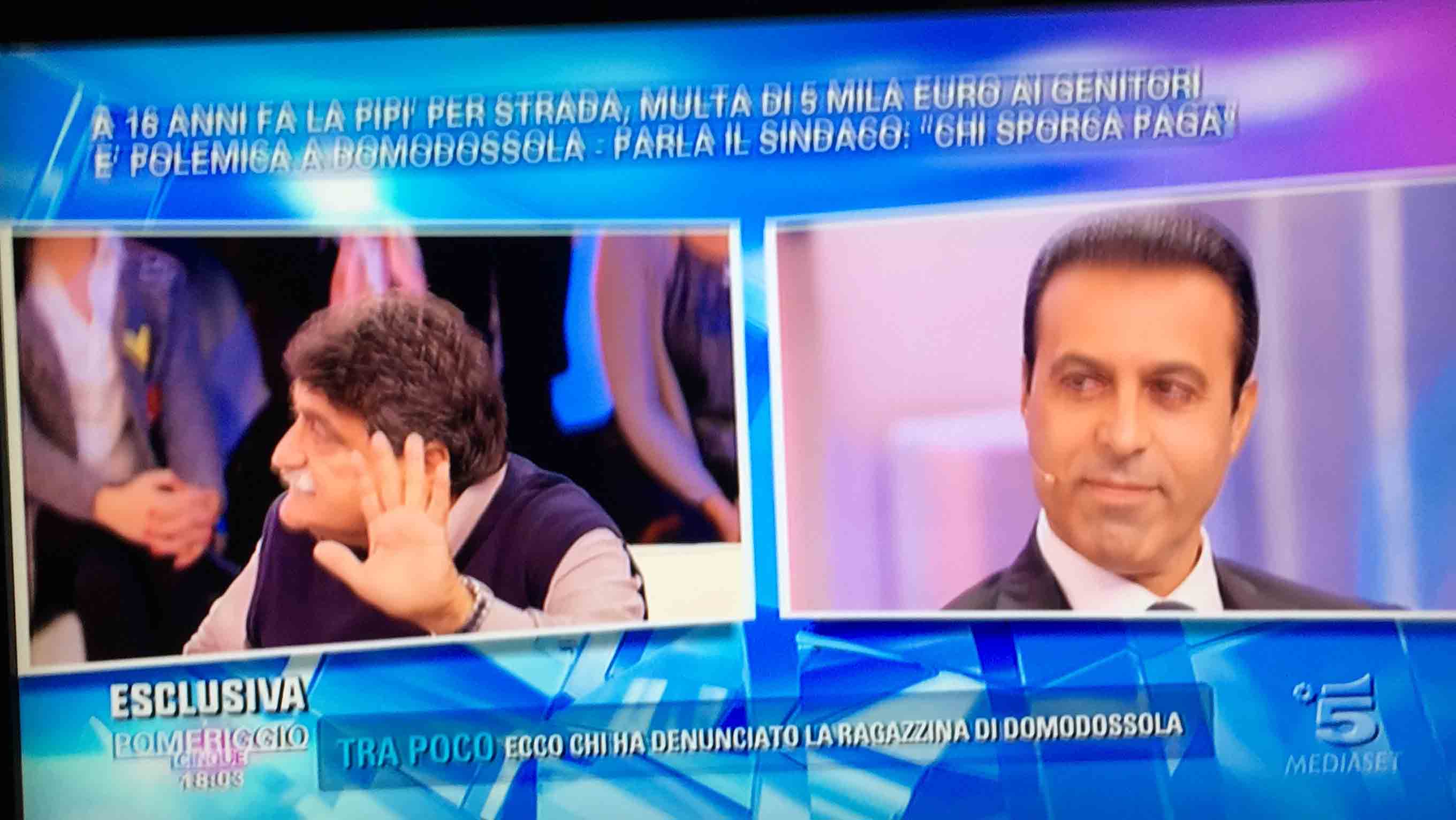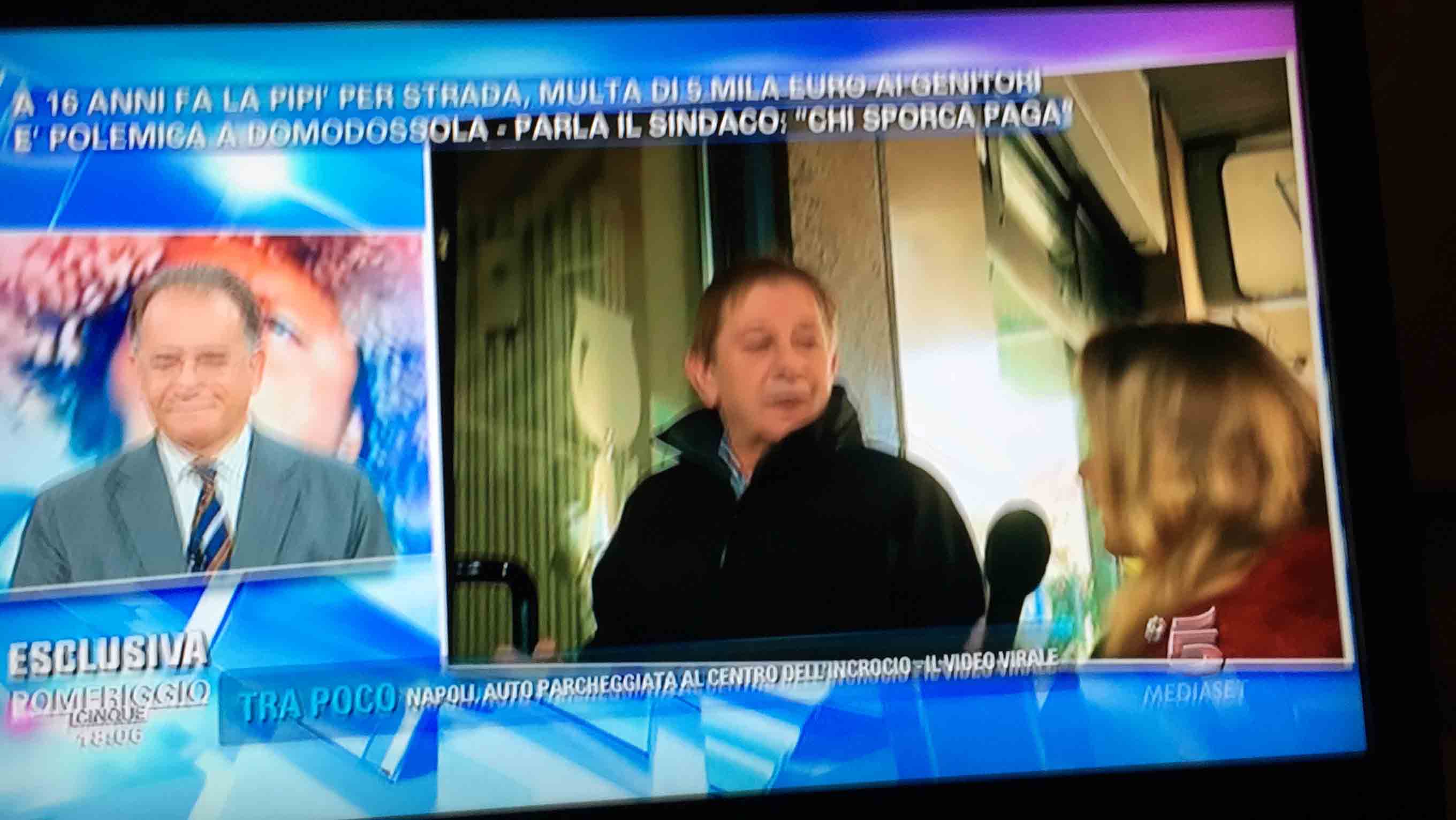 per il sindaco domese Lucio Pizzi, invitato da Barbara D'urso a Pomeriggio 5, popolare trasmissione sulla rete ammiraglia Mediaset, per parlare della multa di 5 mila euro inflitta ai genitori di una ragazzina sedicenne che ha fatto pipì in piazza Mercato. I giornalisti di Canale 5 hanno intervistato un barista di piazza Mercato, che ha spiegato che è stata la donna delle pulizie del suo bar a denunciare la giovane, ed in seguito alla denuncia la polizia locale ha effettuato le indagini, riconoscendo dai video delle telecamere di sicurezza i due amici che erano con la ragazzina, e quindi riuscendo poi ad identificarla e multarla. Il barista ha spiegato che la giovane si è messa tra i tavolini del bar a fare la pipì, intorno alle 4,30 di notte, e che la donna delle pulizia l'ha sgridata, a quel punto si sono intromessi i due amici della ragazzina, che avrebbero inveito contro la donna delle pulizie. In trasmissione molti opinionisti hanno animato la discussione, evidenziando la mancanza di bagni pubblici, la disparità di sanzione rispetto ai 400 euro inflitti alla donna che non aveva raccolto la deiezione del suo cane. In una serie di interviste effettuate ad alcuni passanti in centro a Domo in molti hanno confessato di avere fatto, almeno una volta nella vita, la pipì in strada. Pizzi ha spiegato che la sanzione è quella prevista per legge, ed ha fatto notare a chi obbiettava che era "pericoloso" venire a visitare Domo, che "basta rispettare la legge".