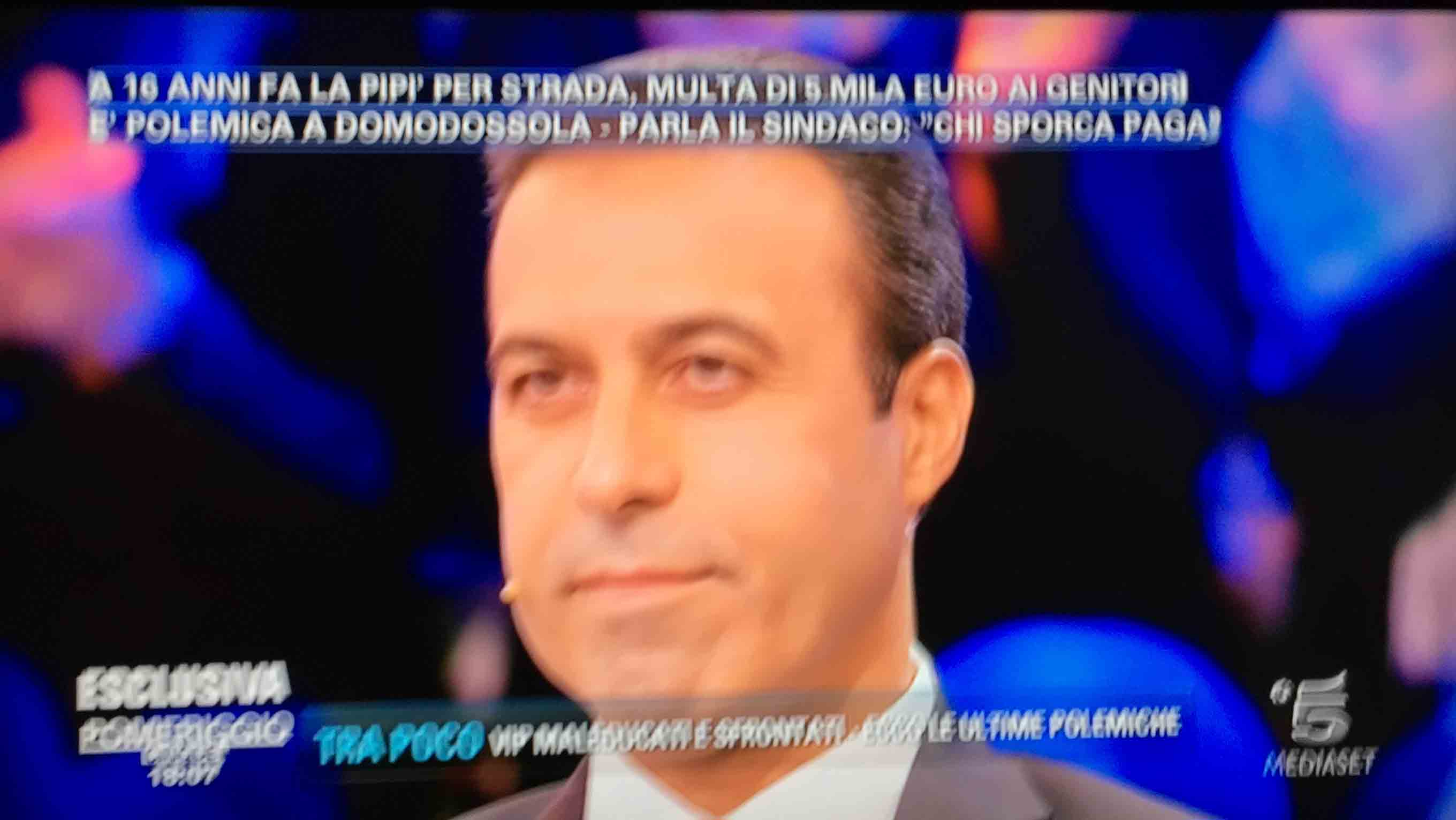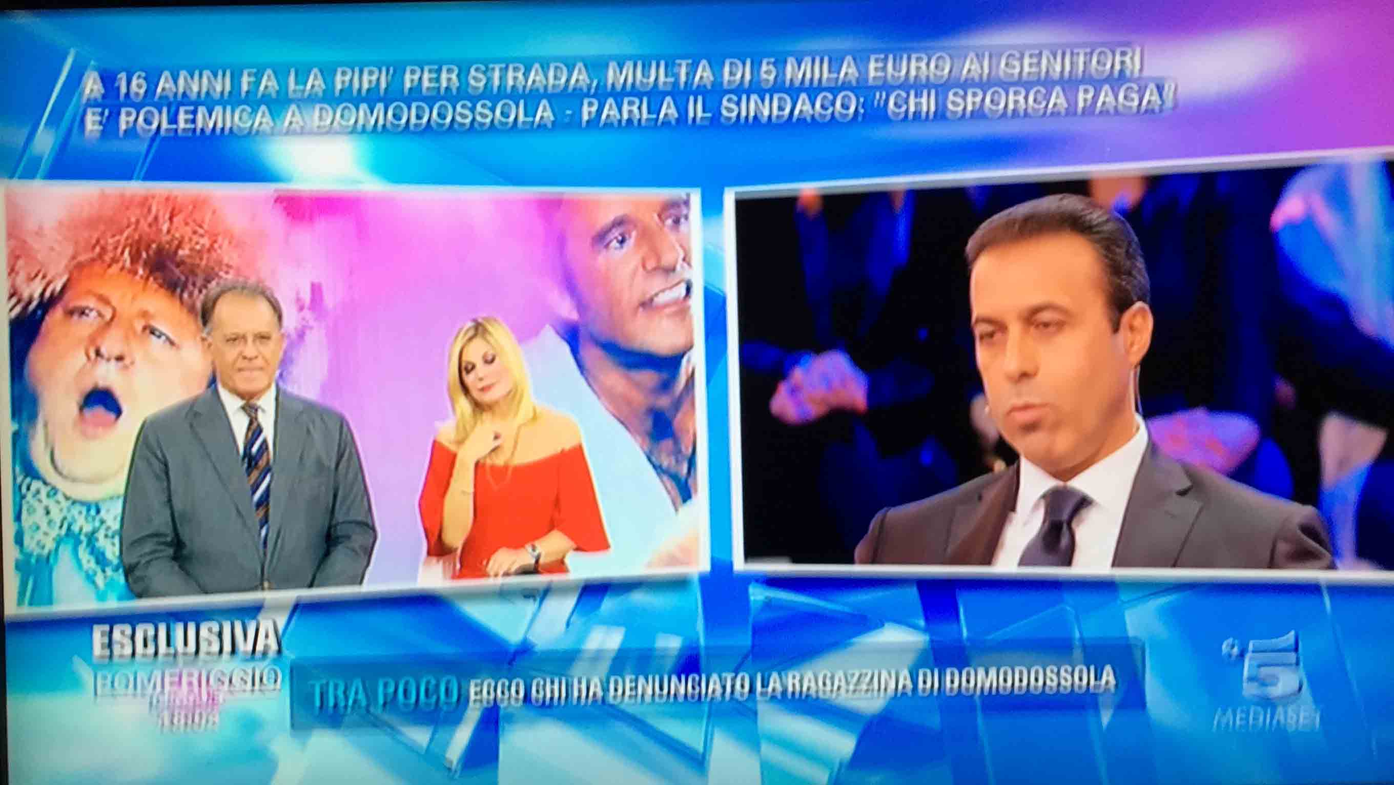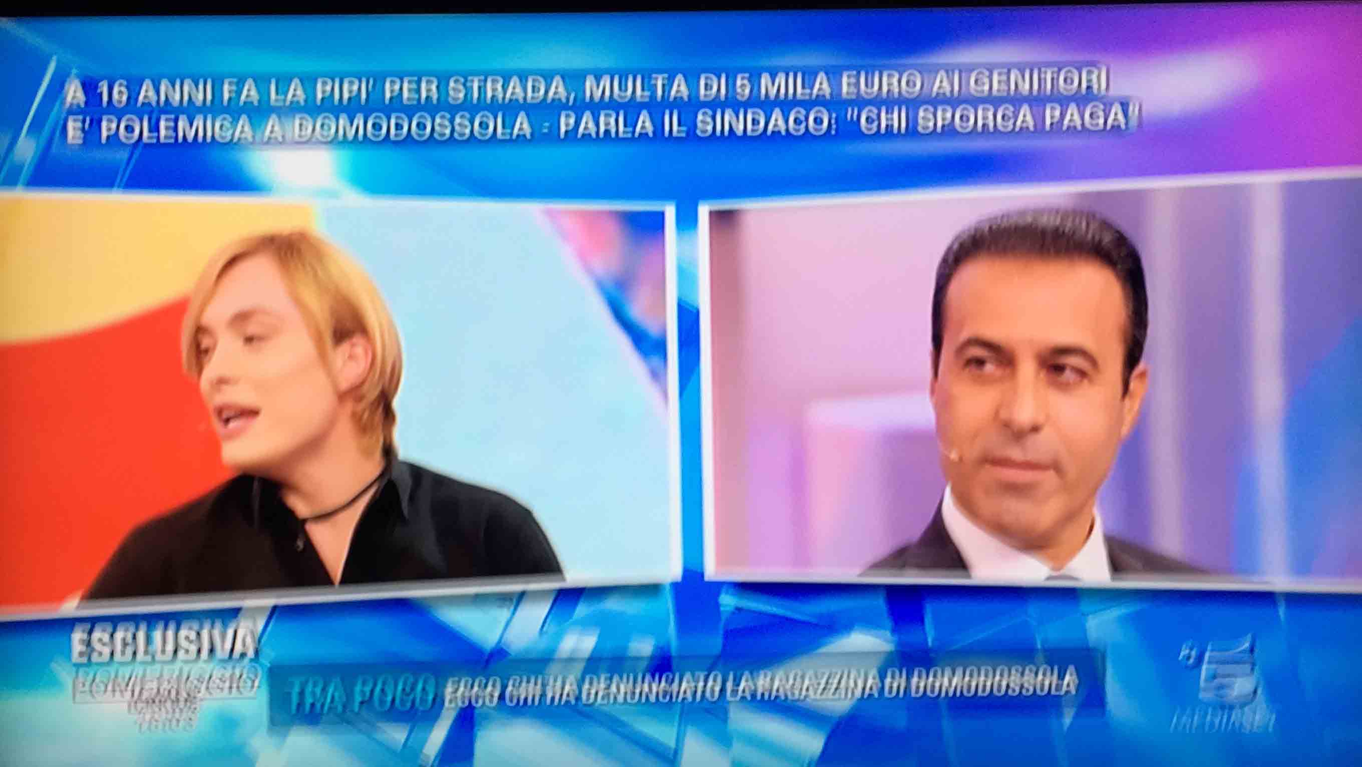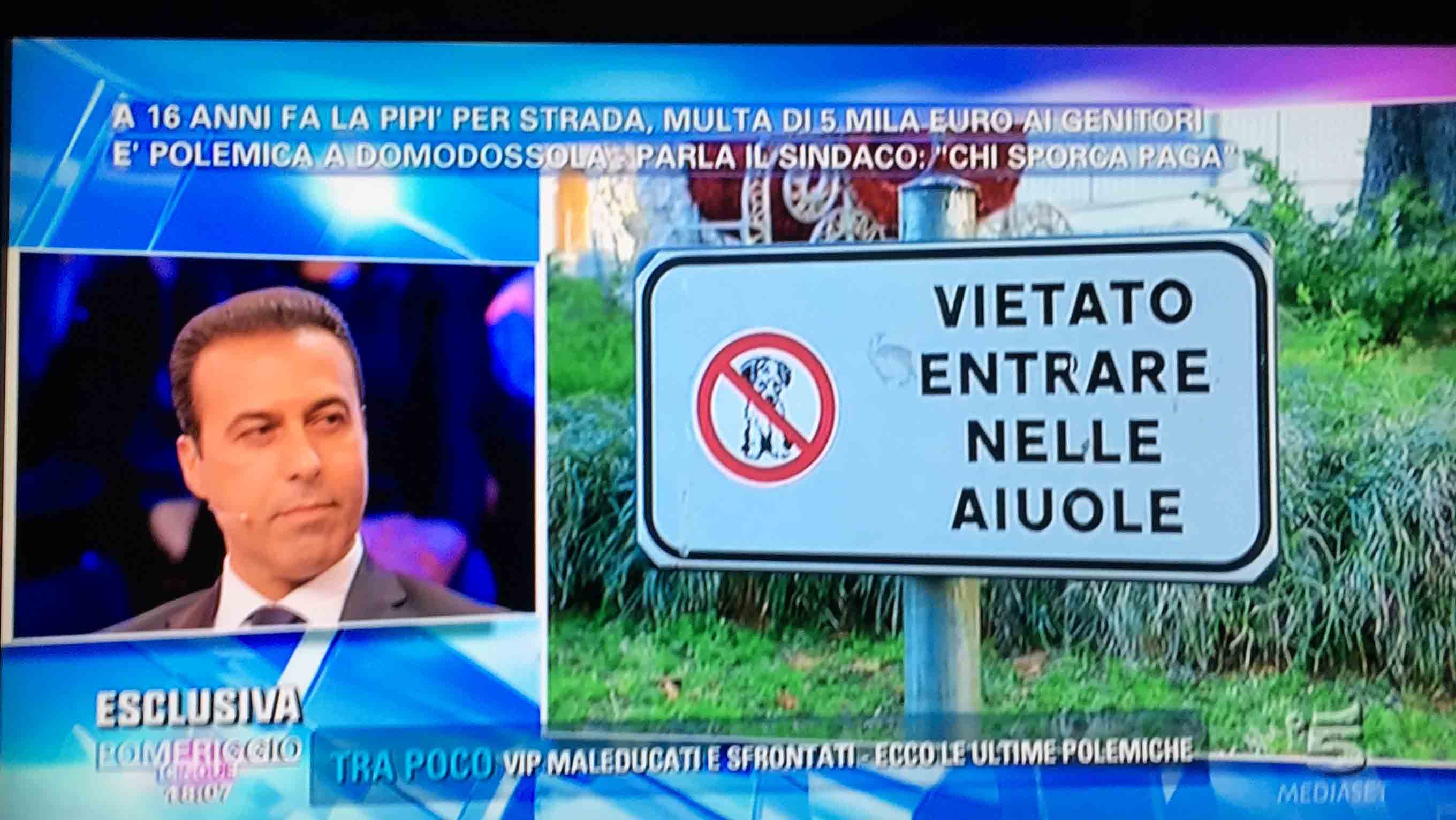 per il sindaco domese Lucio Pizzi, invitato da Barbara D'urso a Pomeriggio 5, popolare trasmissione sulla rete ammiraglia Mediaset, per parlare della multa di 5 mila euro inflitta ai genitori di una ragazzina sedicenne che ha fatto pipì in piazza Mercato. I giornalisti di Canale 5 hanno intervistato un barista di piazza Mercato, che ha spiegato che è stata la donna delle pulizie del suo bar a denunciare la giovane, ed in seguito alla denuncia la polizia locale ha effettuato le indagini, riconoscendo dai video delle telecamere di sicurezza i due amici che erano con la ragazzina, e quindi riuscendo poi ad identificarla e multarla. Il barista ha spiegato che la giovane si è messa tra i tavolini del bar a fare la pipì, intorno alle 4,30 di notte, e che la donna delle pulizia l'ha sgridata, a quel punto si sono intromessi i due amici della ragazzina, che avrebbero inveito contro la donna delle pulizie. In trasmissione molti opinionisti hanno animato la discussione, evidenziando la mancanza di bagni pubblici, la disparità di sanzione rispetto ai 400 euro inflitti alla donna che non aveva raccolto la deiezione del suo cane. In una serie di interviste effettuate ad alcuni passanti in centro a Domo in molti hanno confessato di avere fatto, almeno una volta nella vita, la pipì in strada. Pizzi ha spiegato che la sanzione è quella prevista per legge, ed ha fatto notare a chi obbiettava che era "pericoloso" venire a visitare Domo, che "basta rispettare la legge".