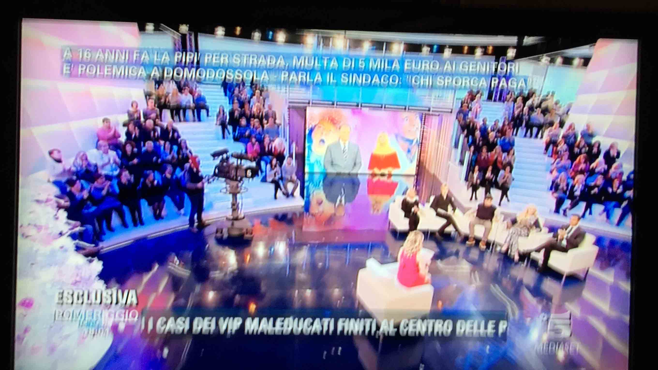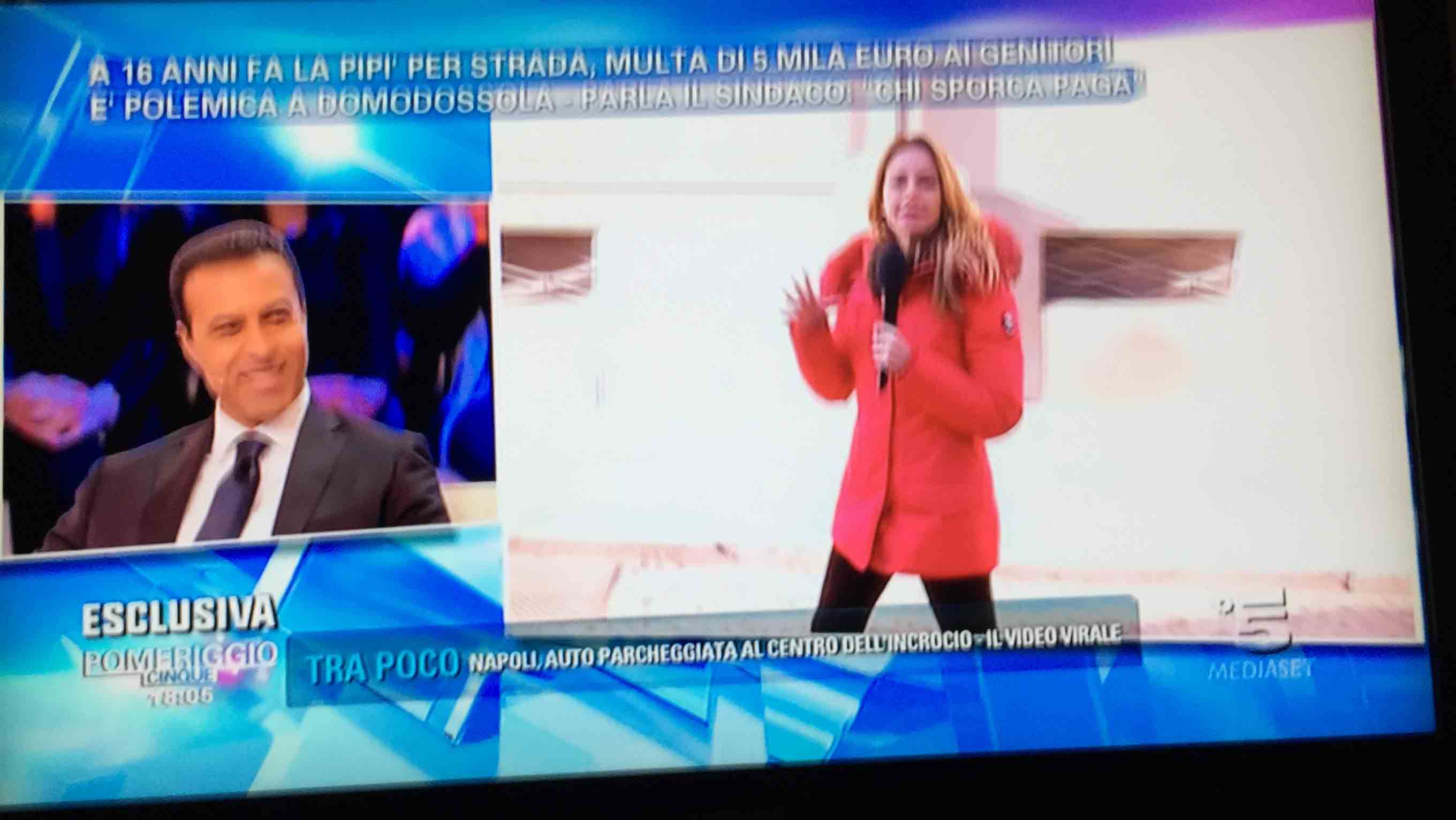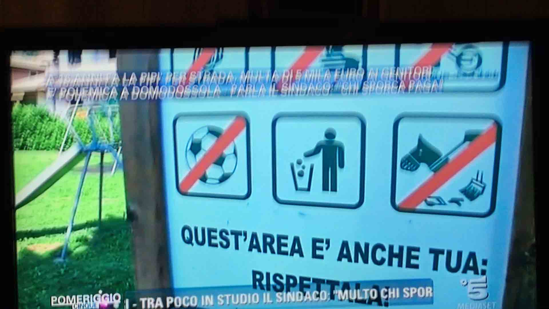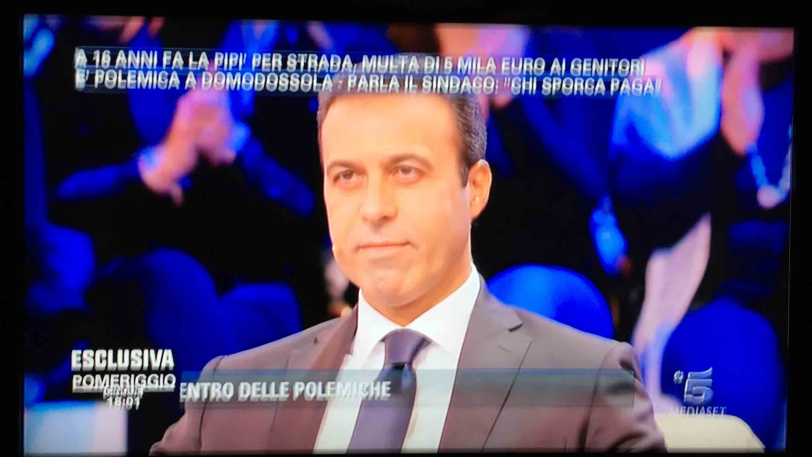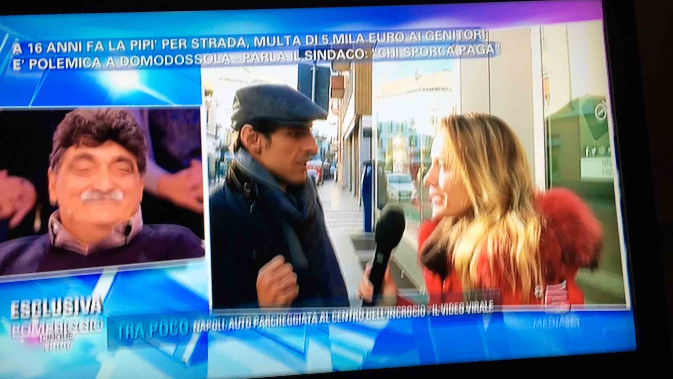 per il sindaco domese Lucio Pizzi, invitato da Barbara D'urso a Pomeriggio 5, popolare trasmissione sulla rete ammiraglia Mediaset, per parlare della multa di 5 mila euro inflitta ai genitori di una ragazzina sedicenne che ha fatto pipì in piazza Mercato. I giornalisti di Canale 5 hanno intervistato un barista di piazza Mercato, che ha spiegato che è stata la donna delle pulizie del suo bar a denunciare la giovane, ed in seguito alla denuncia la polizia locale ha effettuato le indagini, riconoscendo dai video delle telecamere di sicurezza i due amici che erano con la ragazzina, e quindi riuscendo poi ad identificarla e multarla. Il barista ha spiegato che la giovane si è messa tra i tavolini del bar a fare la pipì, intorno alle 4,30 di notte, e che la donna delle pulizia l'ha sgridata, a quel punto si sono intromessi i due amici della ragazzina, che avrebbero inveito contro la donna delle pulizie. In trasmissione molti opinionisti hanno animato la discussione, evidenziando la mancanza di bagni pubblici, la disparità di sanzione rispetto ai 400 euro inflitti alla donna che non aveva raccolto la deiezione del suo cane. In una serie di interviste effettuate ad alcuni passanti in centro a Domo in molti hanno confessato di avere fatto, almeno una volta nella vita, la pipì in strada. Pizzi ha spiegato che la sanzione è quella prevista per legge, ed ha fatto notare a chi obbiettava che era "pericoloso" venire a visitare Domo, che "basta rispettare la legge".