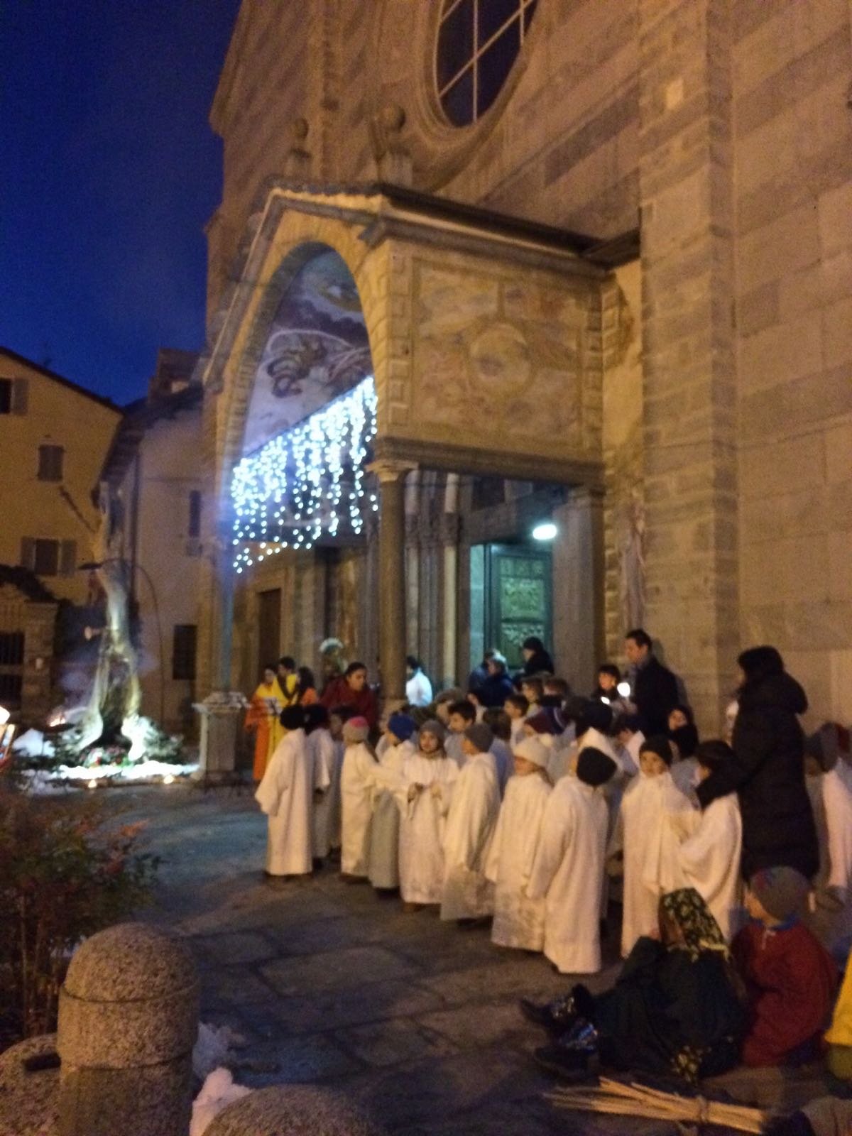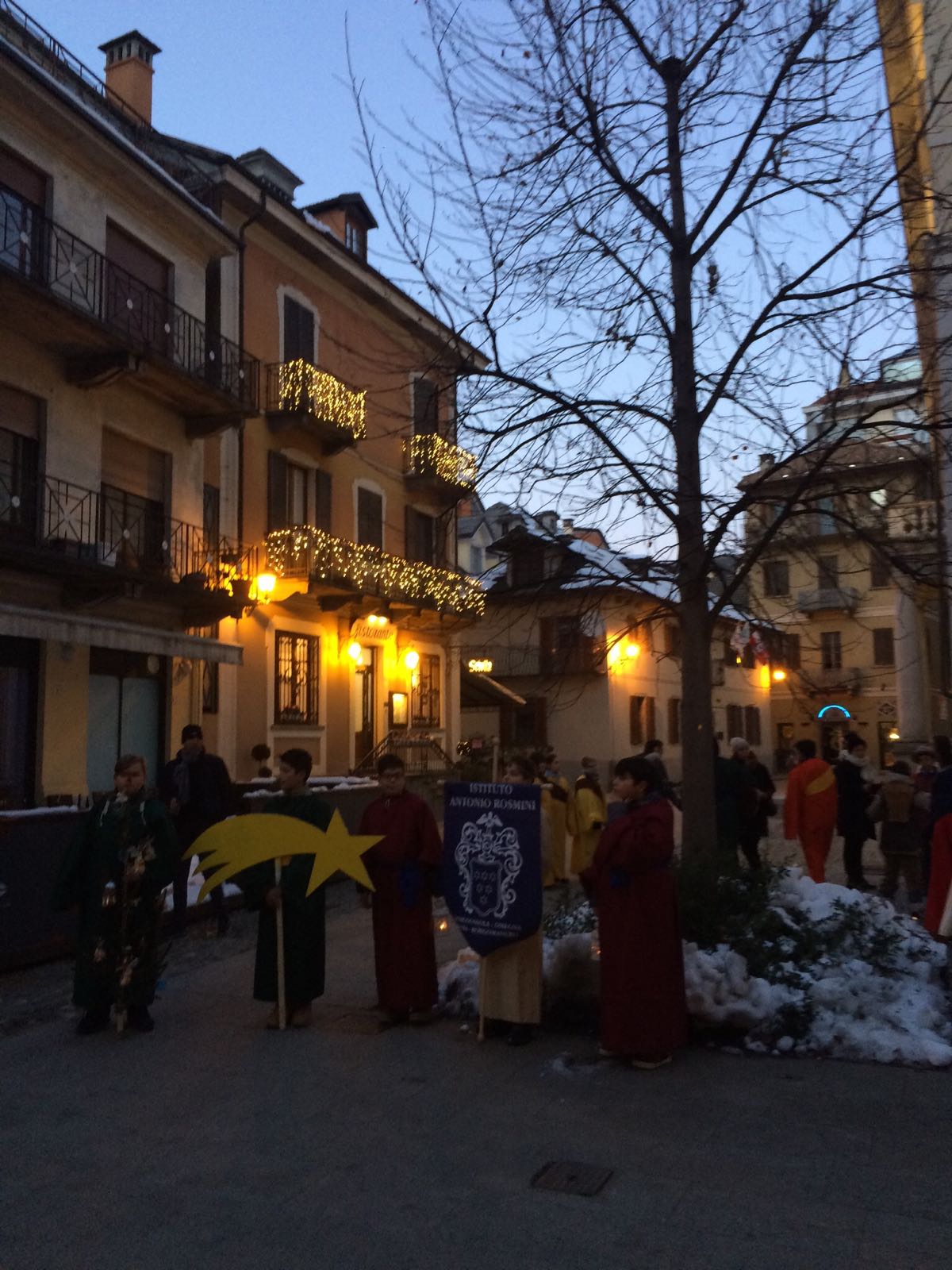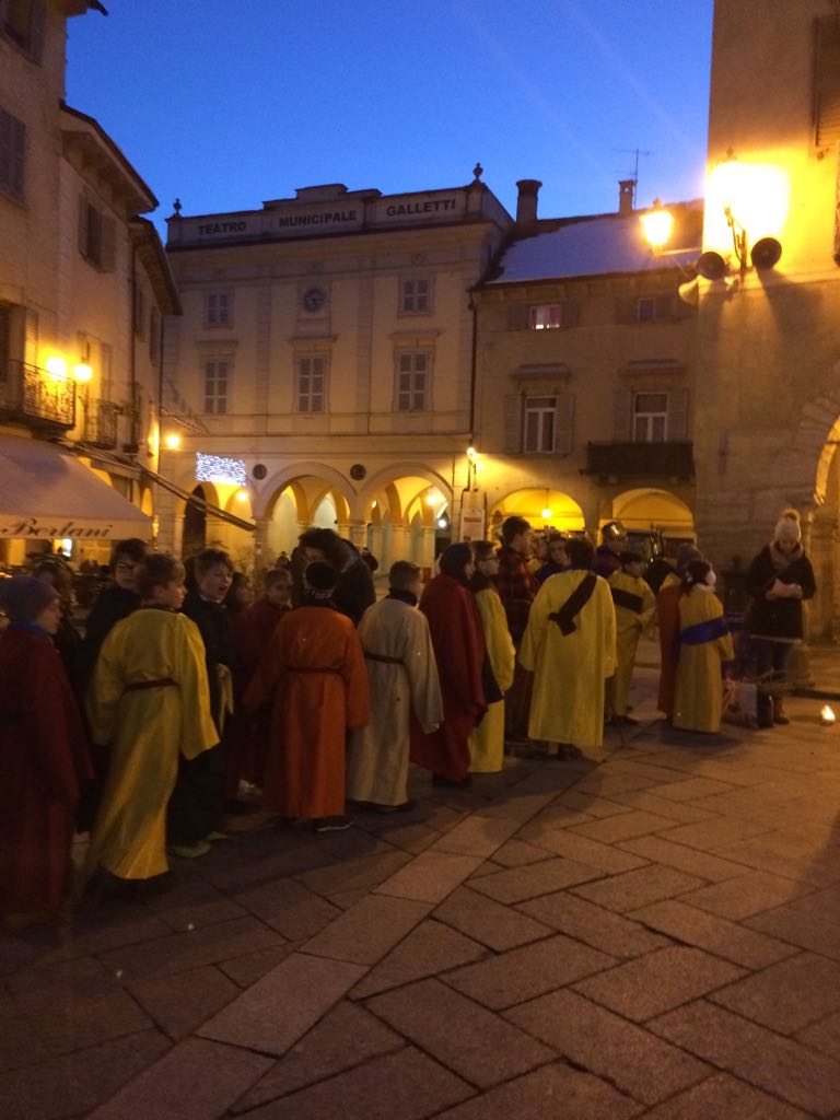 DOMODOSSOLA- 20-12-2017- Come da tradizione l'Istituto Antonio Rosmini di Domodossola ha portato la sacra rappresentazione della nascita di Gesù per le vie del centro storico. Lunedì 18 dicembre gli alunni della scuola primaria e della scuola secondaria di primo grado hanno rievocato così il sacro evento. Pastorelli, centurioni romani, angioletti hanno intonato canti natalizi alternati a meditazioni e letture dense di significato. La dirigente della scuola secondaria di primo grado, prof.ssa Simonetta Aru, racconta : "quest’anno abbiamo voluto recuperare le tradizioni legate ai riti del Santo Natale. Perché è dentro le tradizioni che riscopriamo da dove veniamo e quindi la nostra identità. Tutte le scene sono state introdotte dai passi del Vangelo , sono seguite poi delle meditazioni con le parole di Papa Francesco e di Benedetto XVI relative al significato del Presepe e della Sacra Rappresentazione che fanno da legame al Vangelo e da introduzione e motivazione alle testimonianze legate alle tradizioni sul Santo Natale". Sono stati ricordati nel corso della rievocazione, due testimoni che vengono da lontano, ma che vivono una situazione difficile a causa della guerra: Padre Ibrahim di Aleppo e Myriam, una bambina irachena di dieci anni di Qaraqosh, costretta a lasciare la propria casa per salvarsi dai miliziani dello Stato islamico. Punto d'arrivo delle varie tappe anche quest'anno la Collegiata dei Santi Gervasio e Protasio dove i ragazzi e gli insegnanti sono stati accolti da don Vincenzo Barone, il quale ha benedetto le statuine dei Gesù Bambini che gli studenti avevano con loro. Il parroco ha invitato a riflettere sul senso Cristiano dell'Avvento.