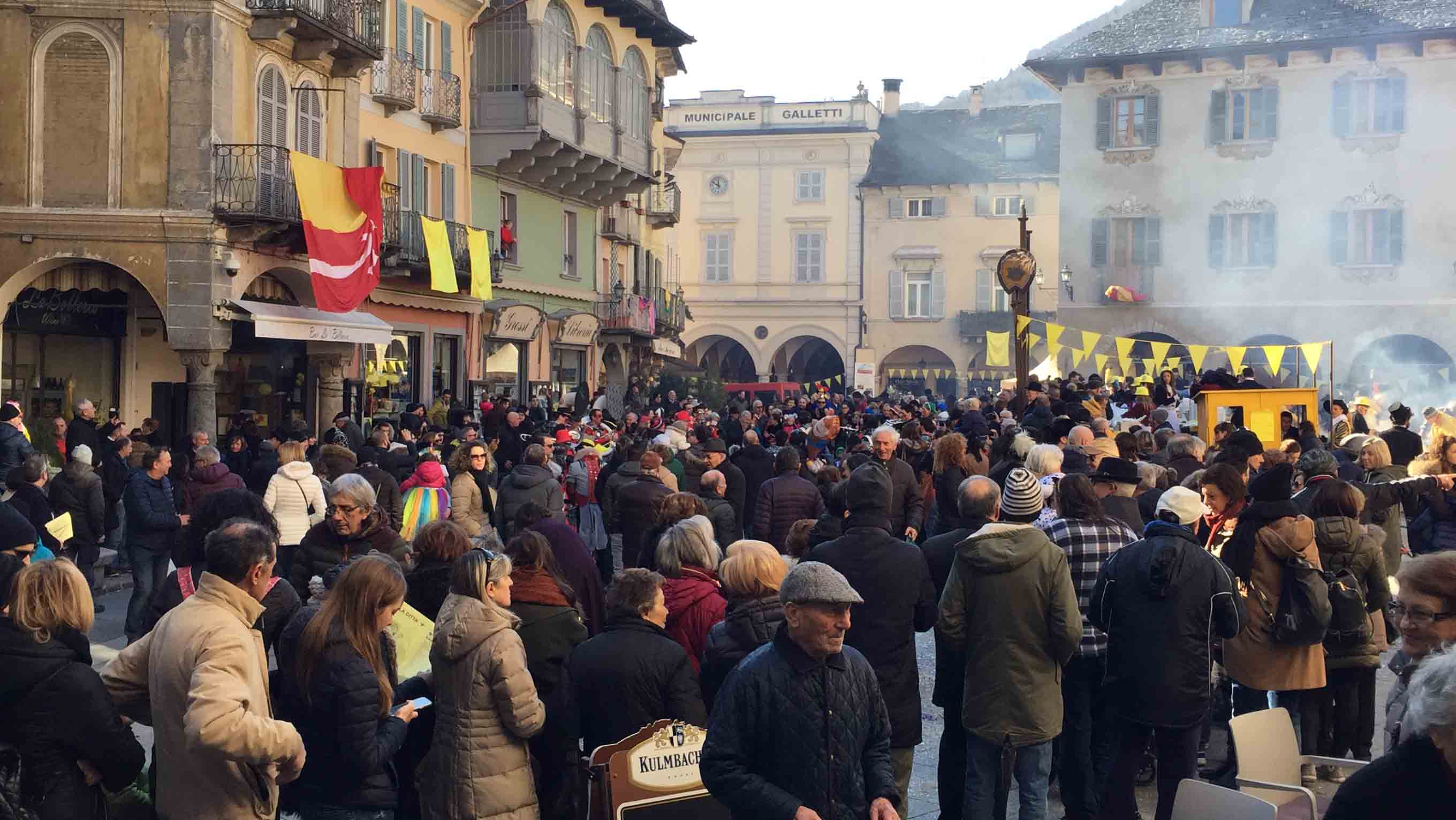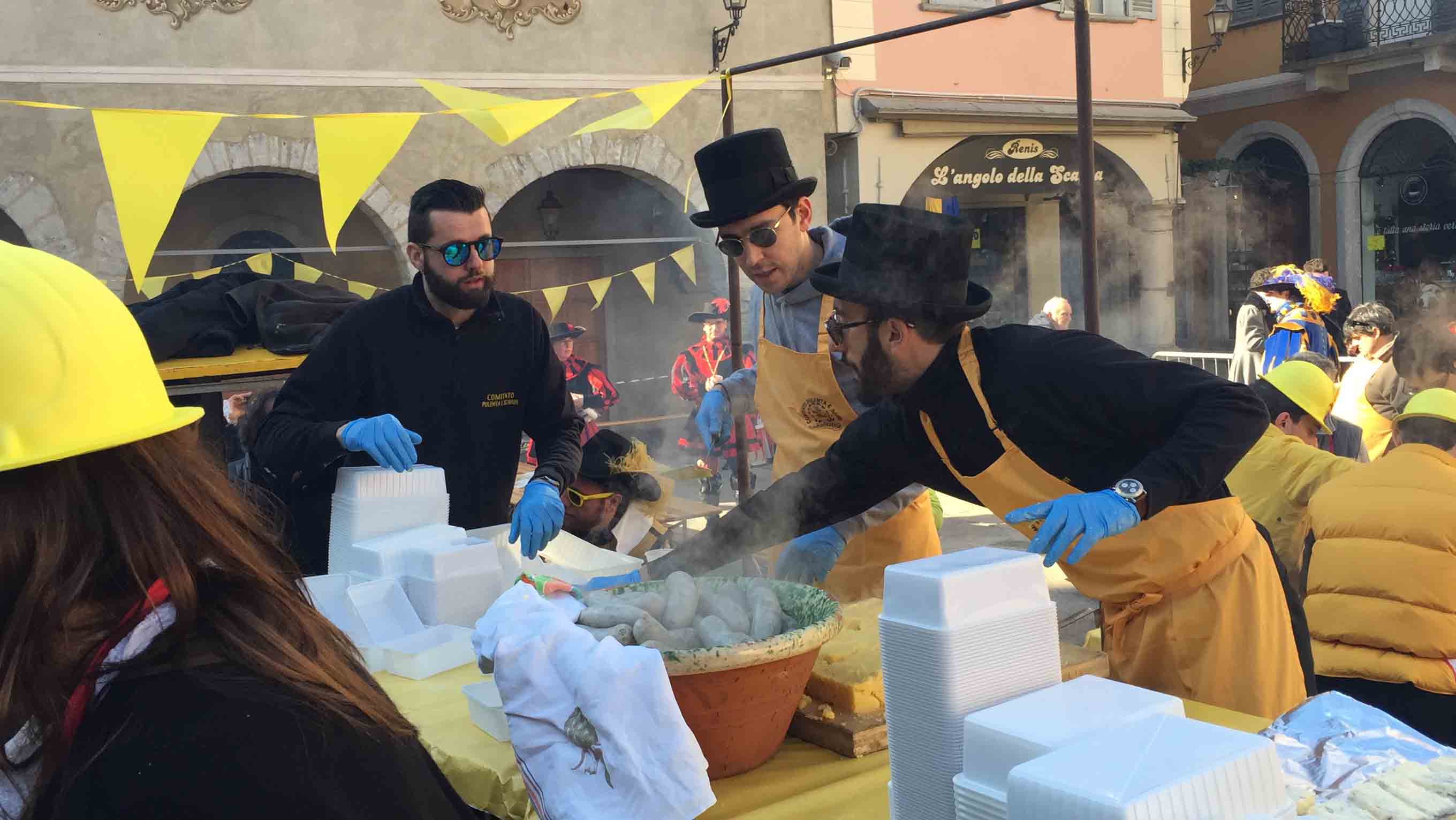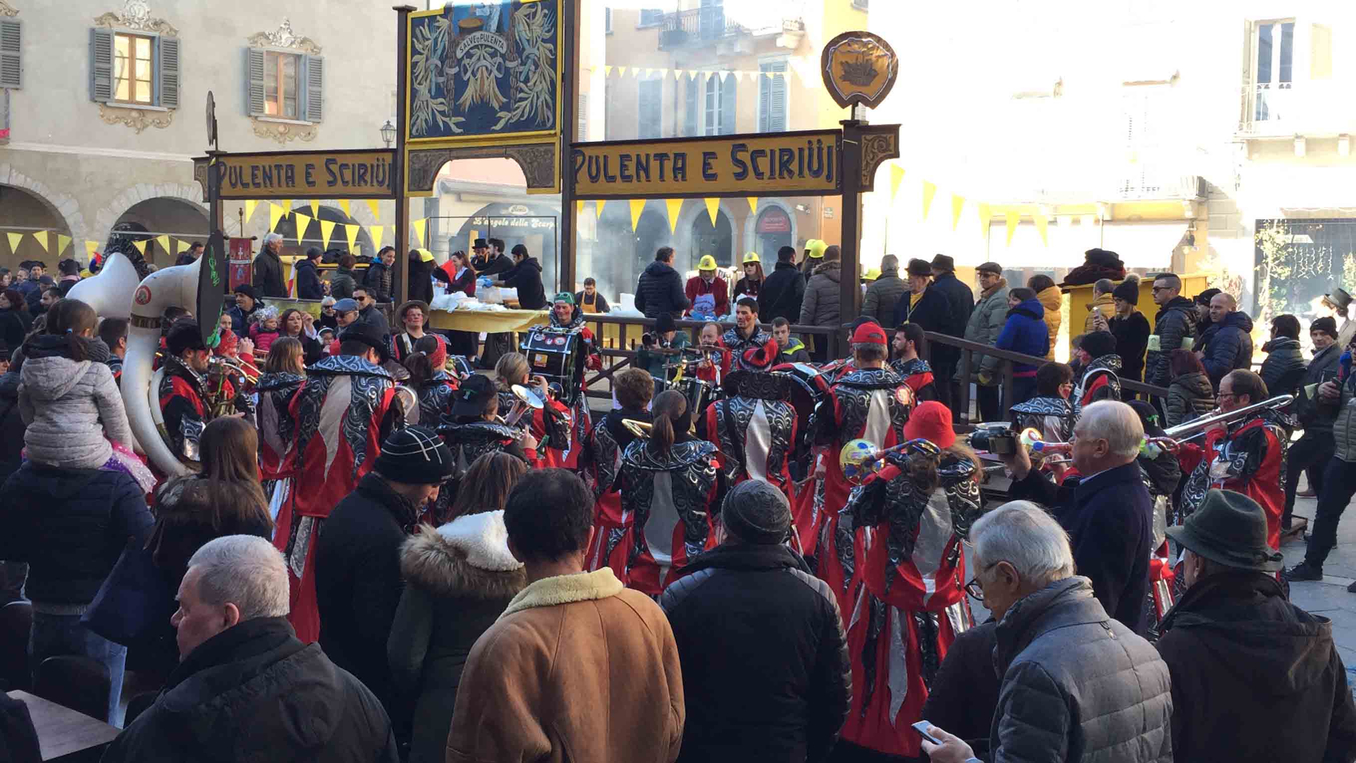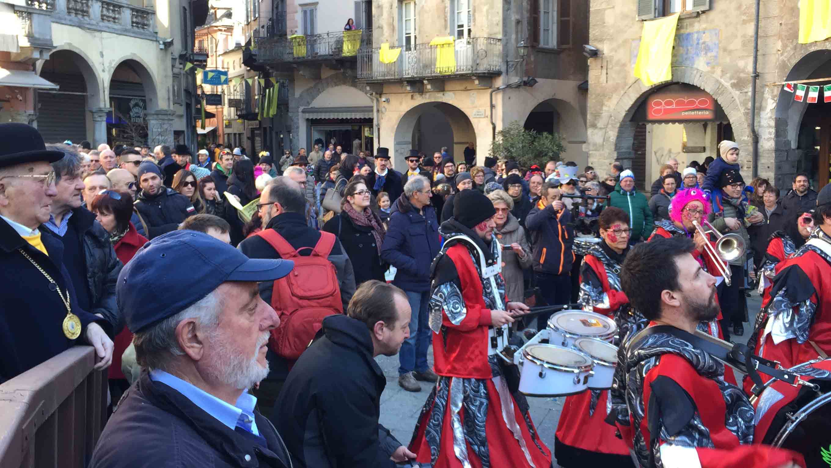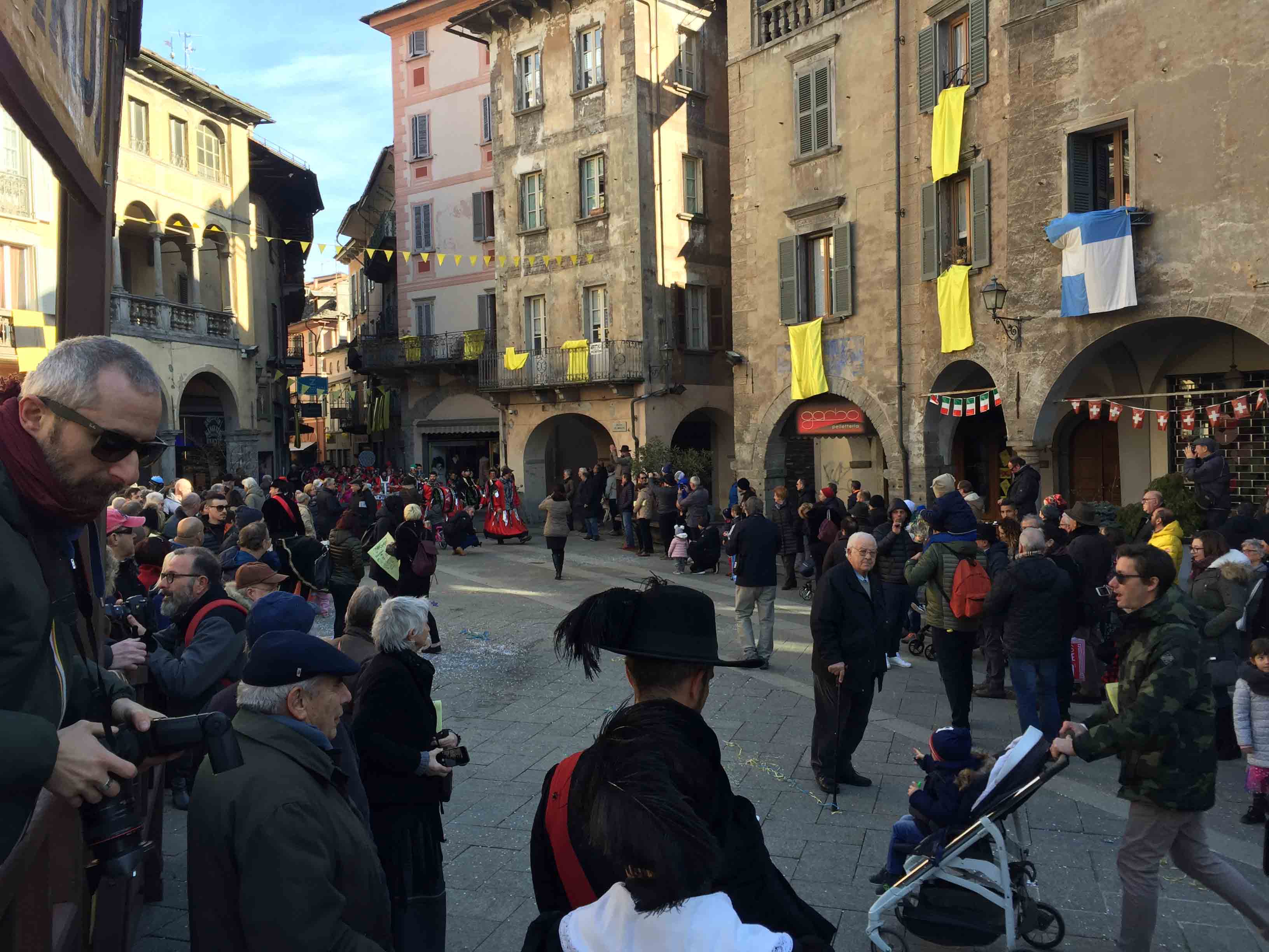 DOMODOSSOLA- 11-02-2018- Piazza Mercato affollata, come da tradizione, per la distribuzione di polenta e salamini del Carnevale. E' stata la Contessa di Mattarella ad assaggiare il primo salamino cucinato e dare così il via alla distribuzione, con i domesi in coda per la loro razione sulle due file a lato del palco. Applauditissima la banda di Simplon Dorf, che ha allietato con le sue musiche l'attesa per la polenta. Dalle 14,30 la sfilata e poi il matrimonio di Togn e Cia.