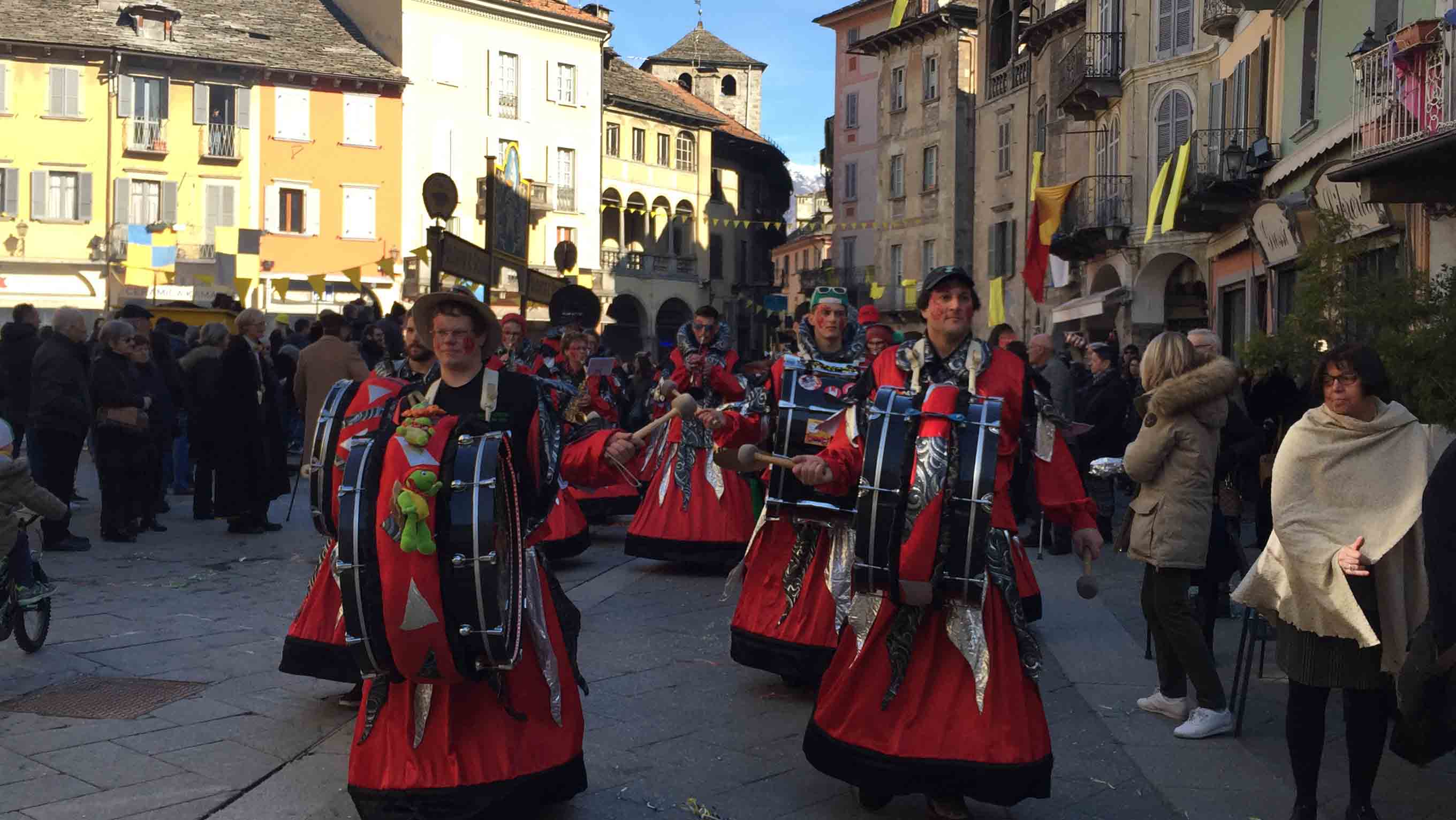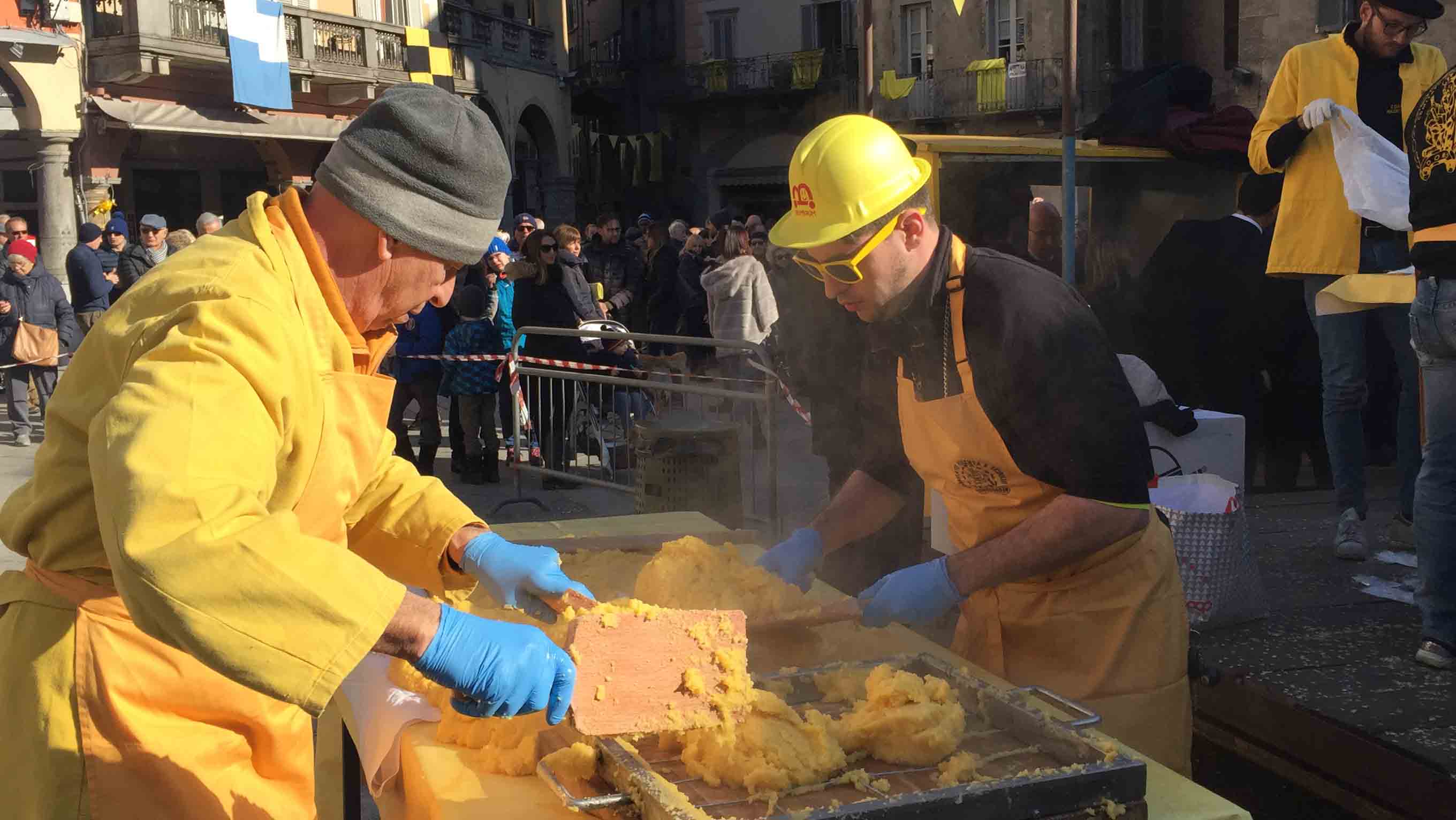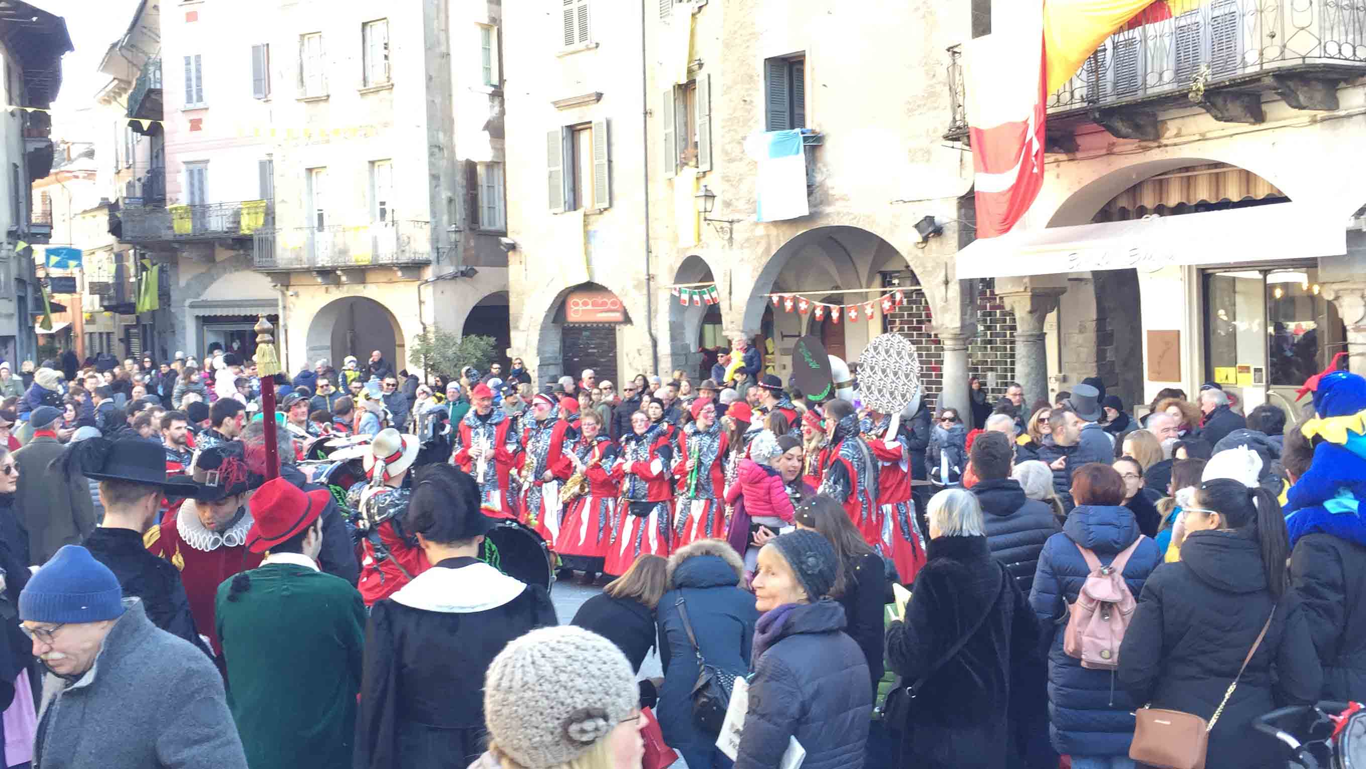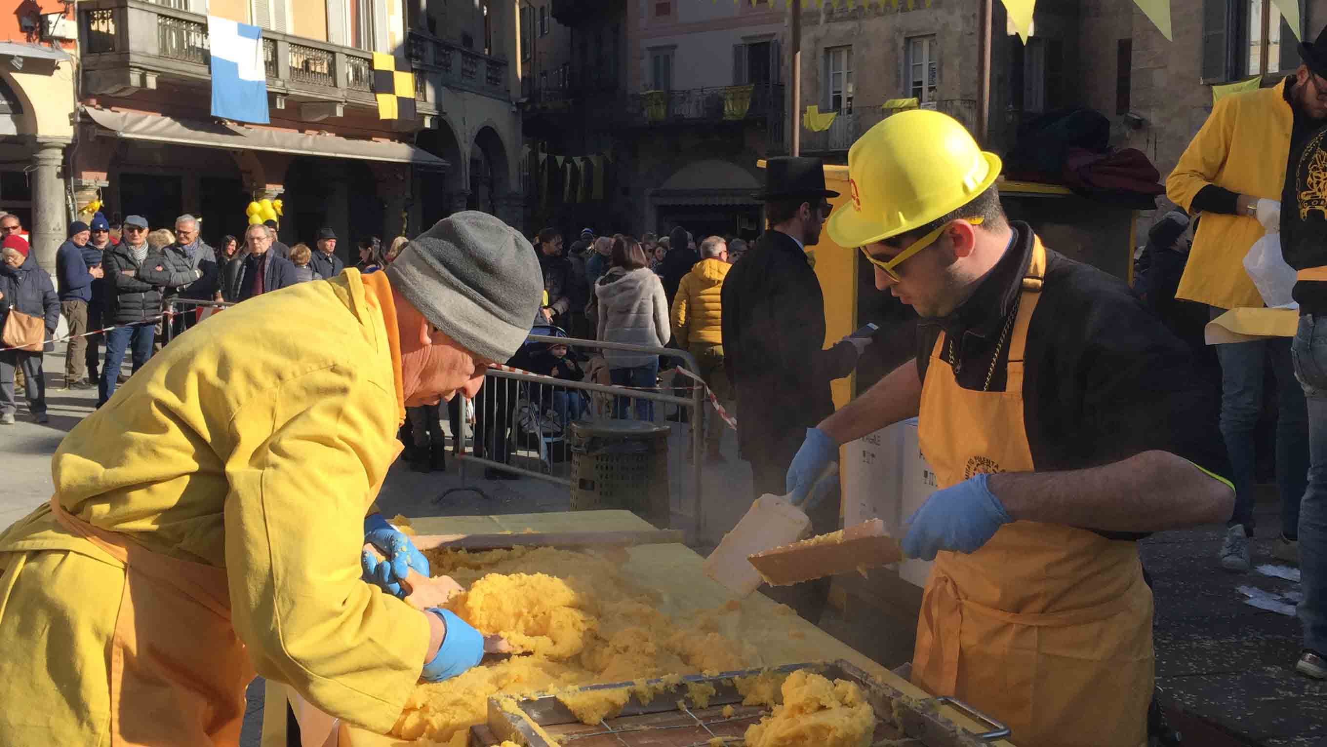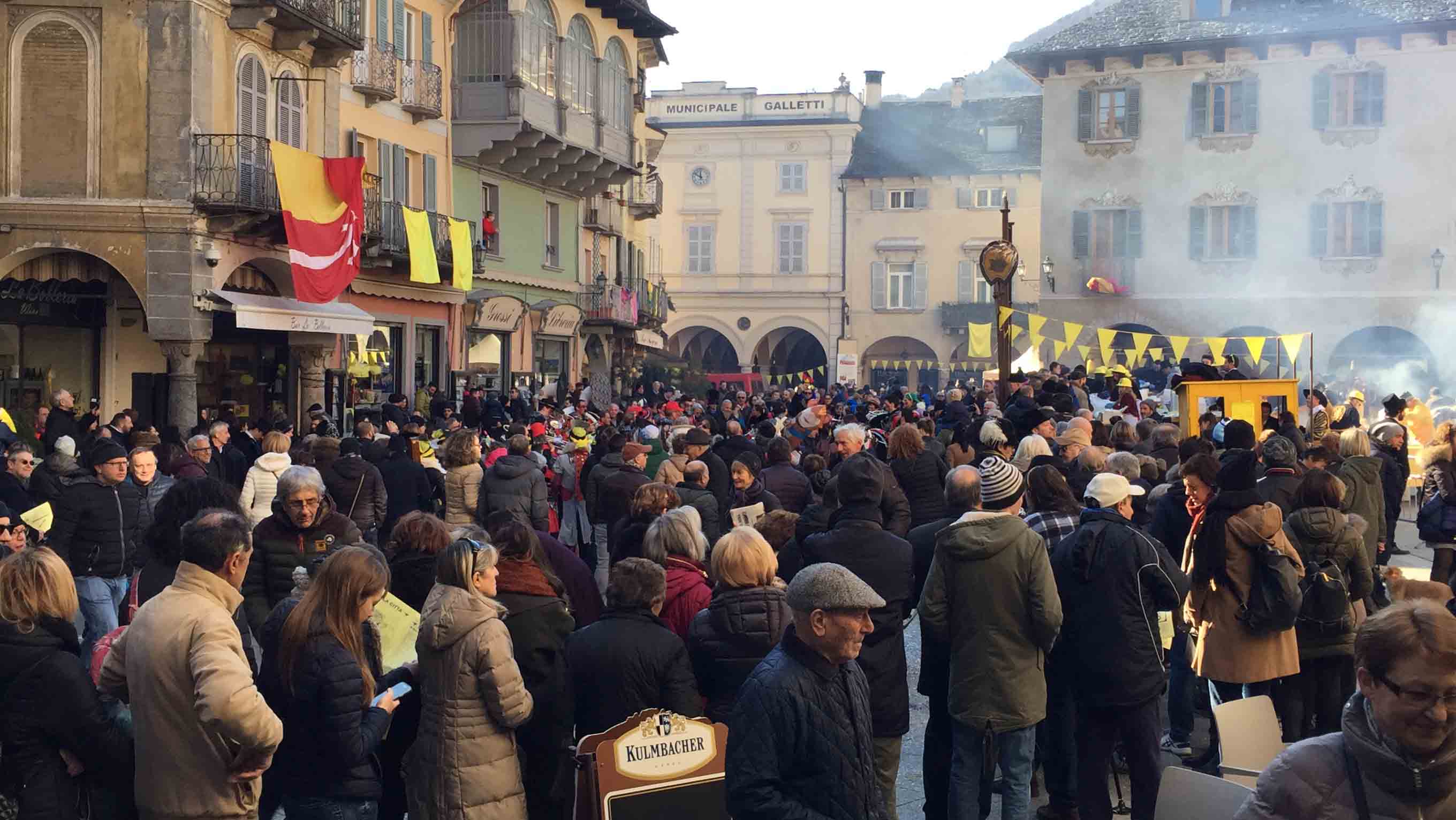 DOMODOSSOLA- 11-02-2018- Piazza Mercato affollata, come da tradizione, per la distribuzione di polenta e salamini del Carnevale. E' stata la Contessa di Mattarella ad assaggiare il primo salamino cucinato e dare così il via alla distribuzione, con i domesi in coda per la loro razione sulle due file a lato del palco. Applauditissima la banda di Simplon Dorf, che ha allietato con le sue musiche l'attesa per la polenta. Dalle 14,30 la sfilata e poi il matrimonio di Togn e Cia.