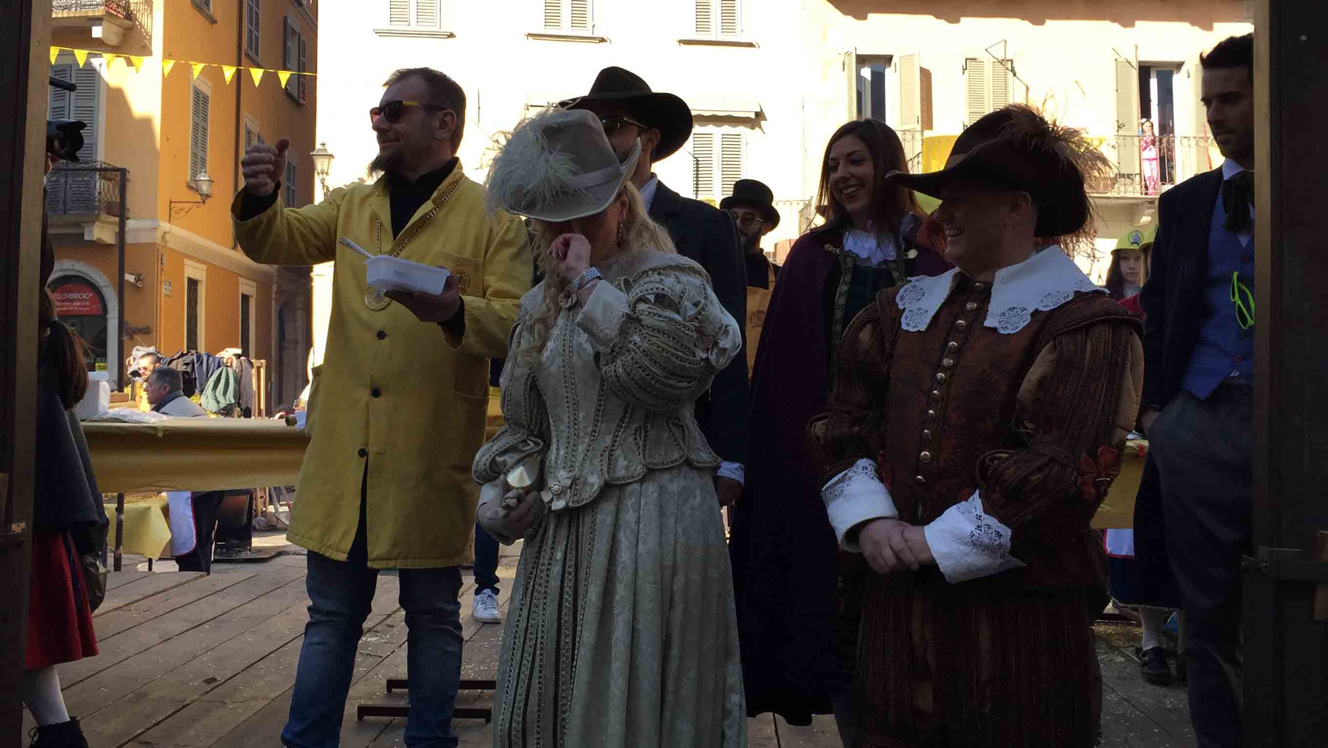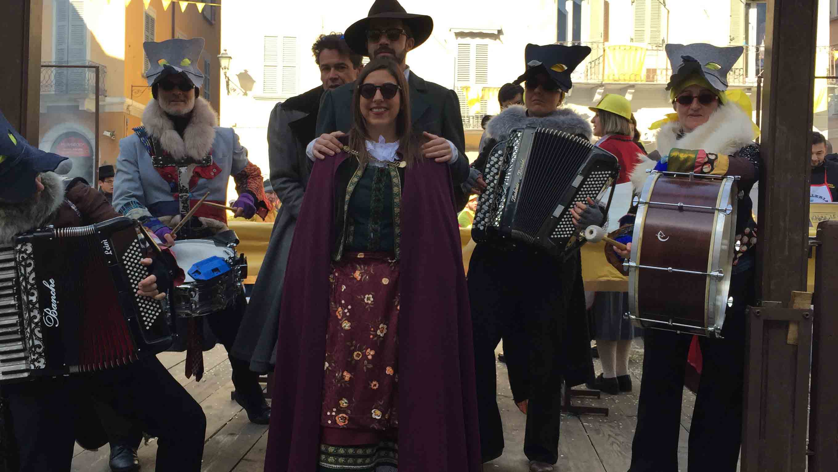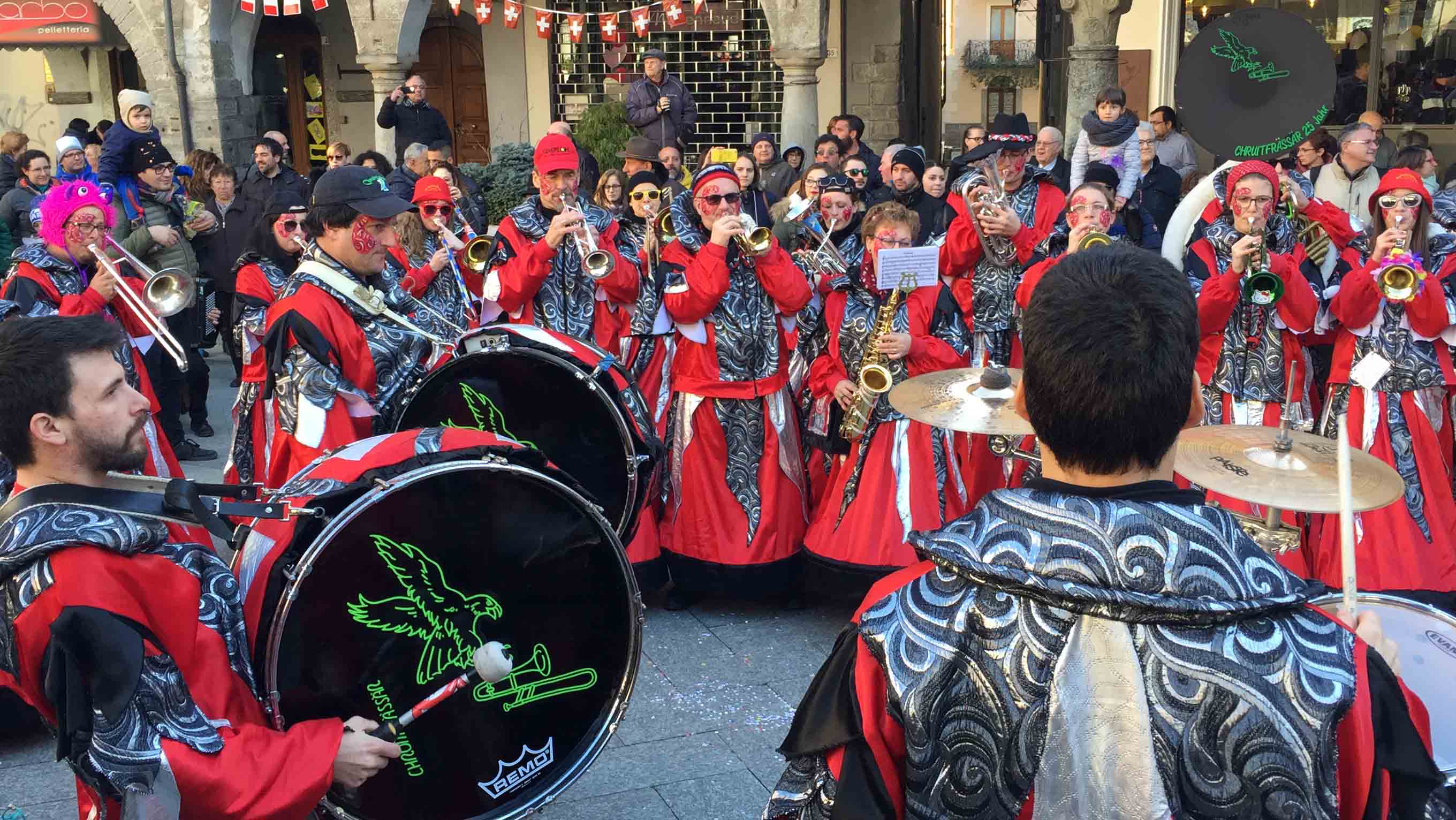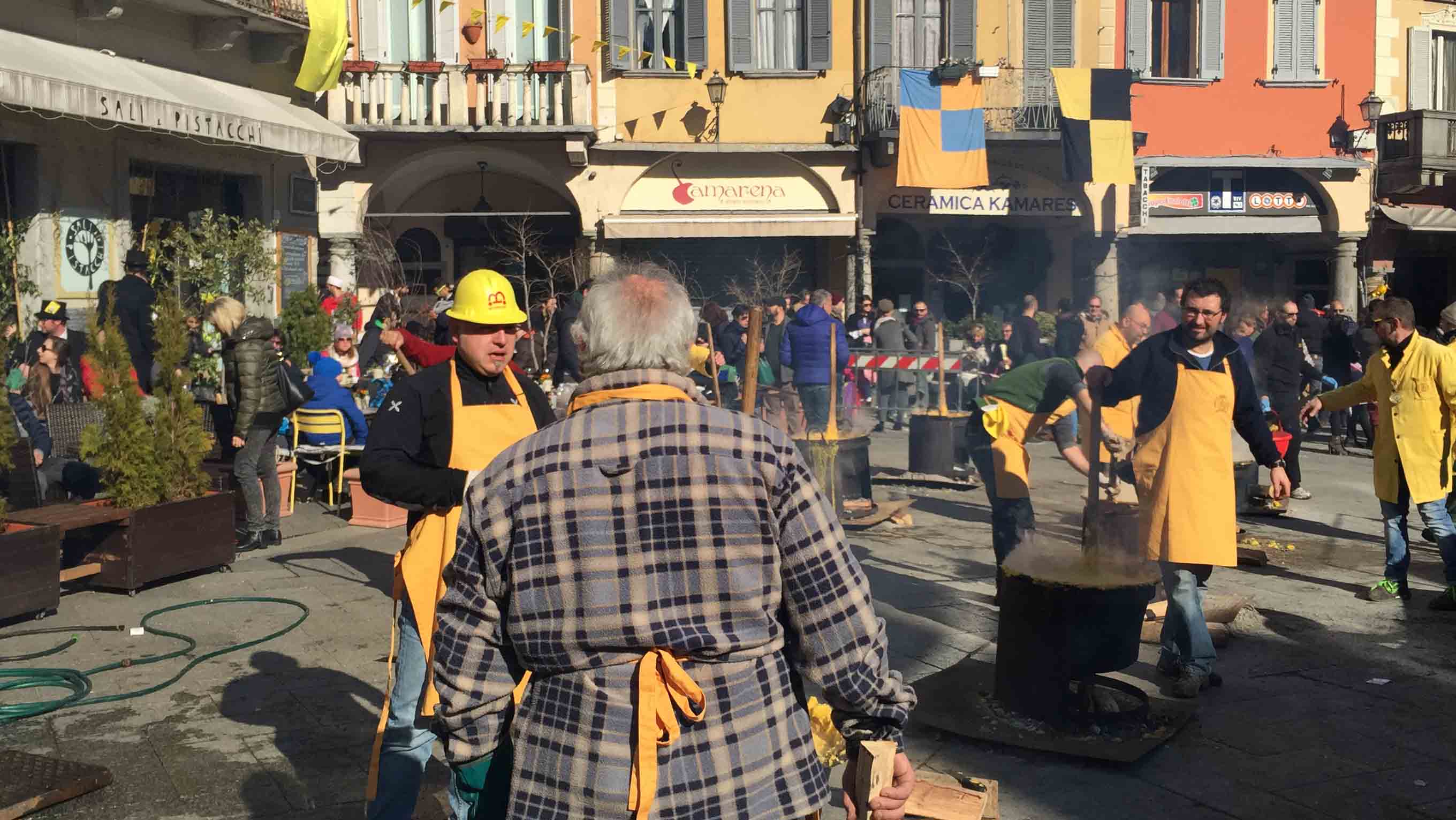 DOMODOSSOLA- 11-02-2018- Piazza Mercato affollata, come da tradizione, per la distribuzione di polenta e salamini del Carnevale. E' stata la Contessa di Mattarella ad assaggiare il primo salamino cucinato e dare così il via alla distribuzione, con i domesi in coda per la loro razione sulle due file a lato del palco. Applauditissima la banda di Simplon Dorf, che ha allietato con le sue musiche l'attesa per la polenta. Dalle 14,30 la sfilata e poi il matrimonio di Togn e Cia.