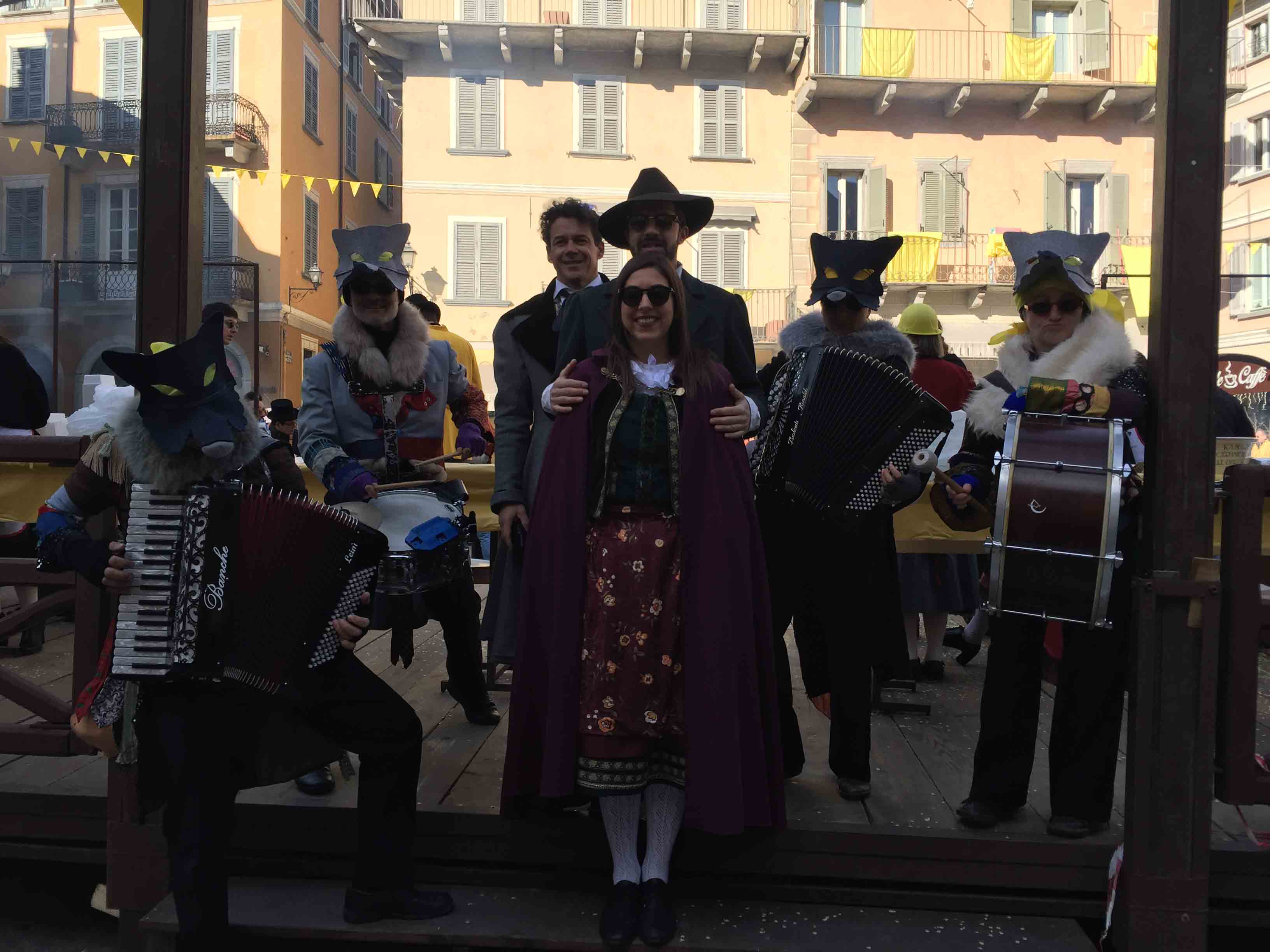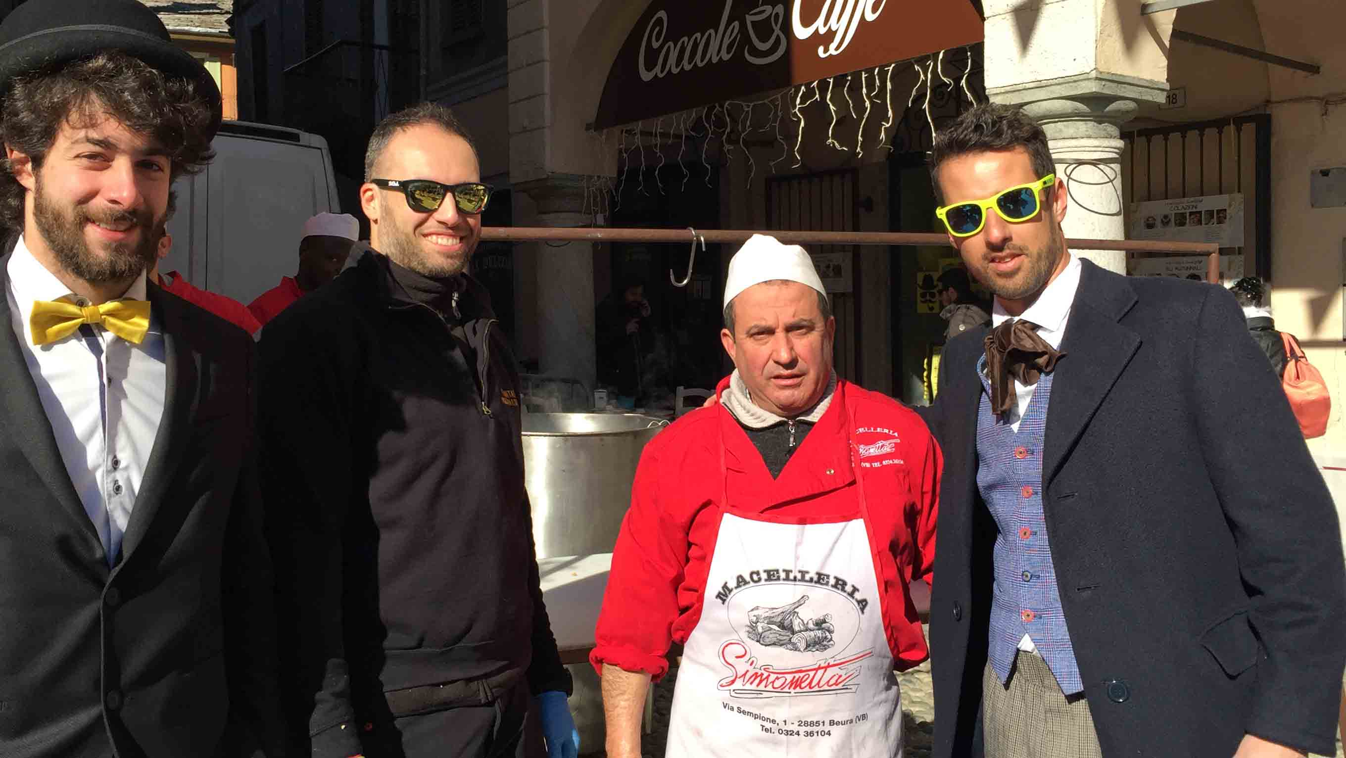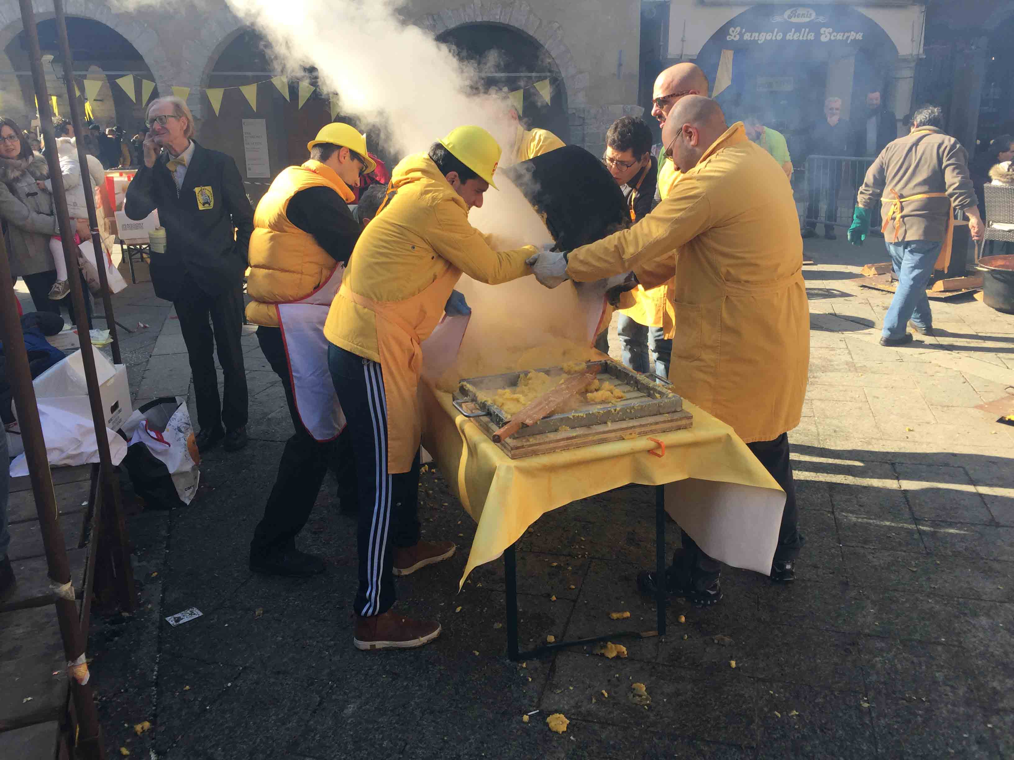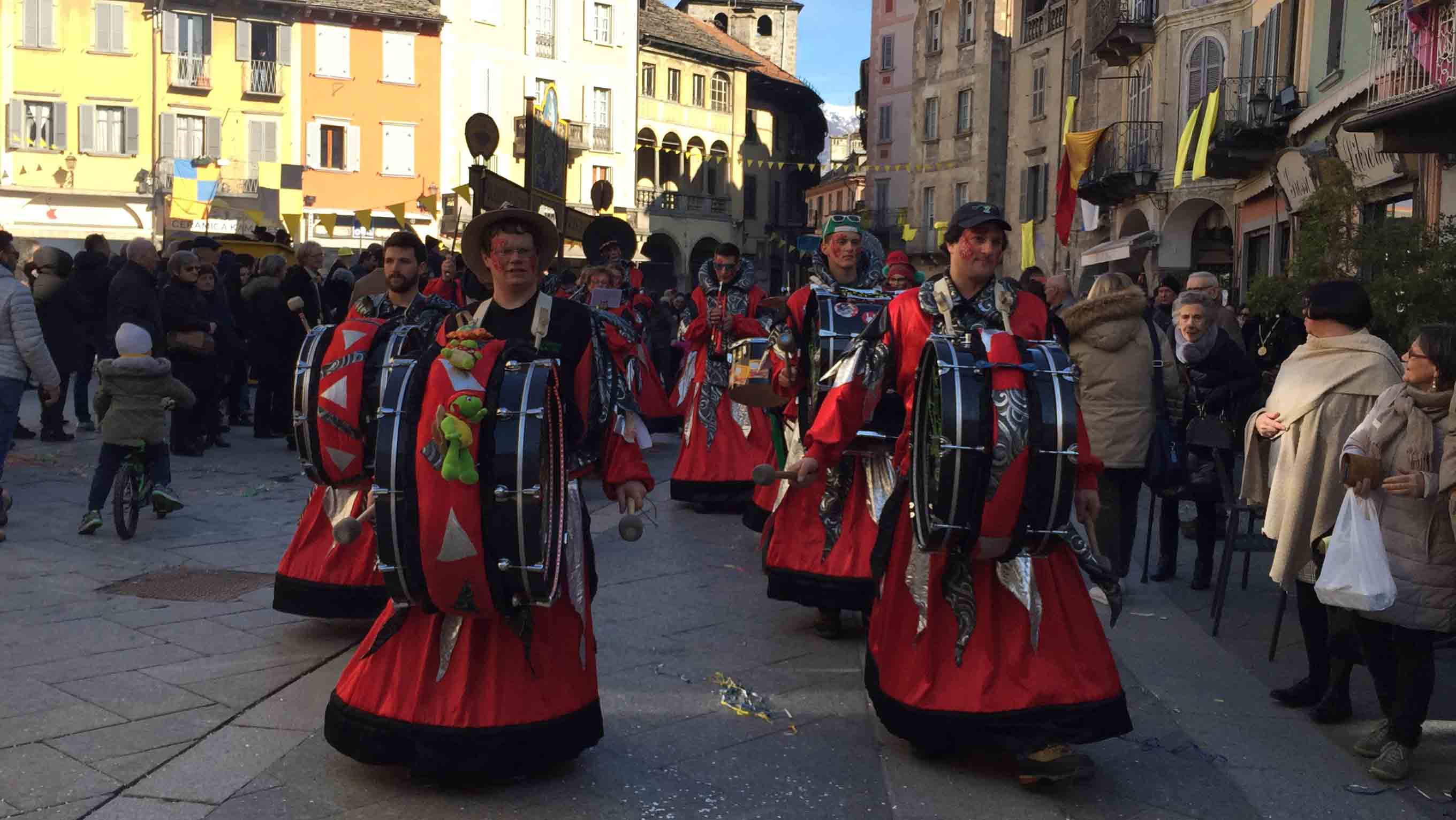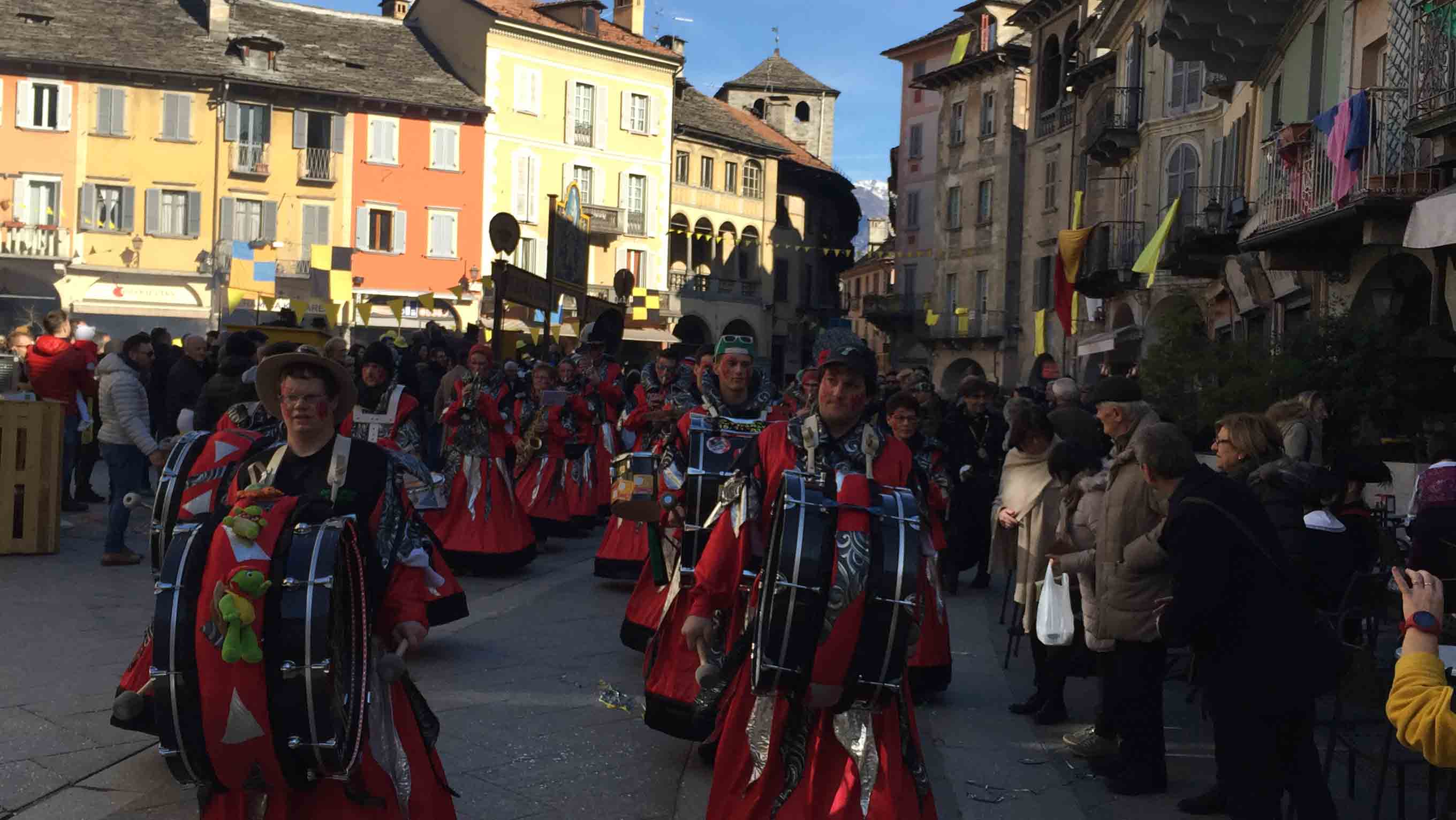 DOMODOSSOLA- 11-02-2018- Piazza Mercato affollata, come da tradizione, per la distribuzione di polenta e salamini del Carnevale. E' stata la Contessa di Mattarella ad assaggiare il primo salamino cucinato e dare così il via alla distribuzione, con i domesi in coda per la loro razione sulle due file a lato del palco. Applauditissima la banda di Simplon Dorf, che ha allietato con le sue musiche l'attesa per la polenta. Dalle 14,30 la sfilata e poi il matrimonio di Togn e Cia.