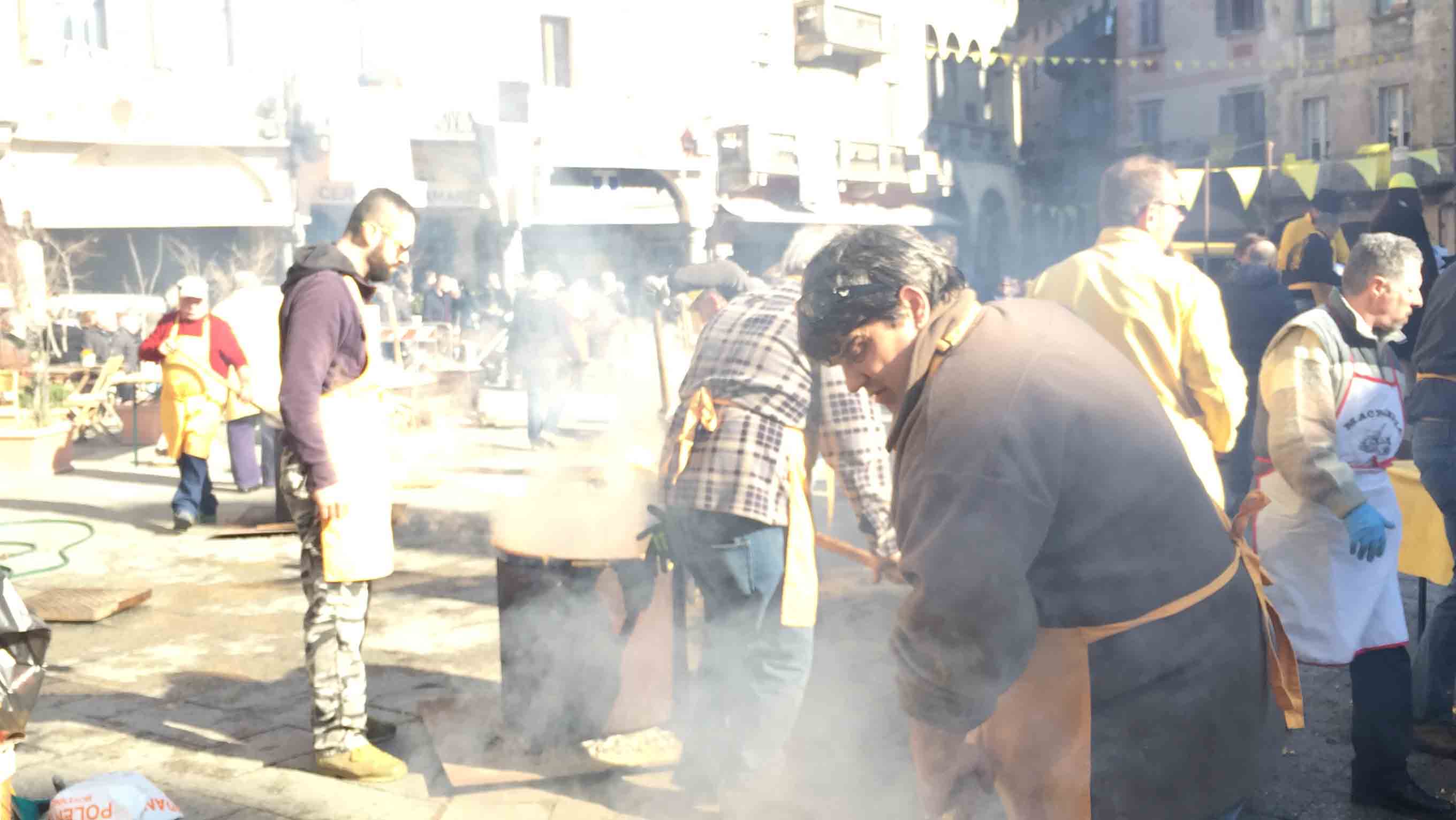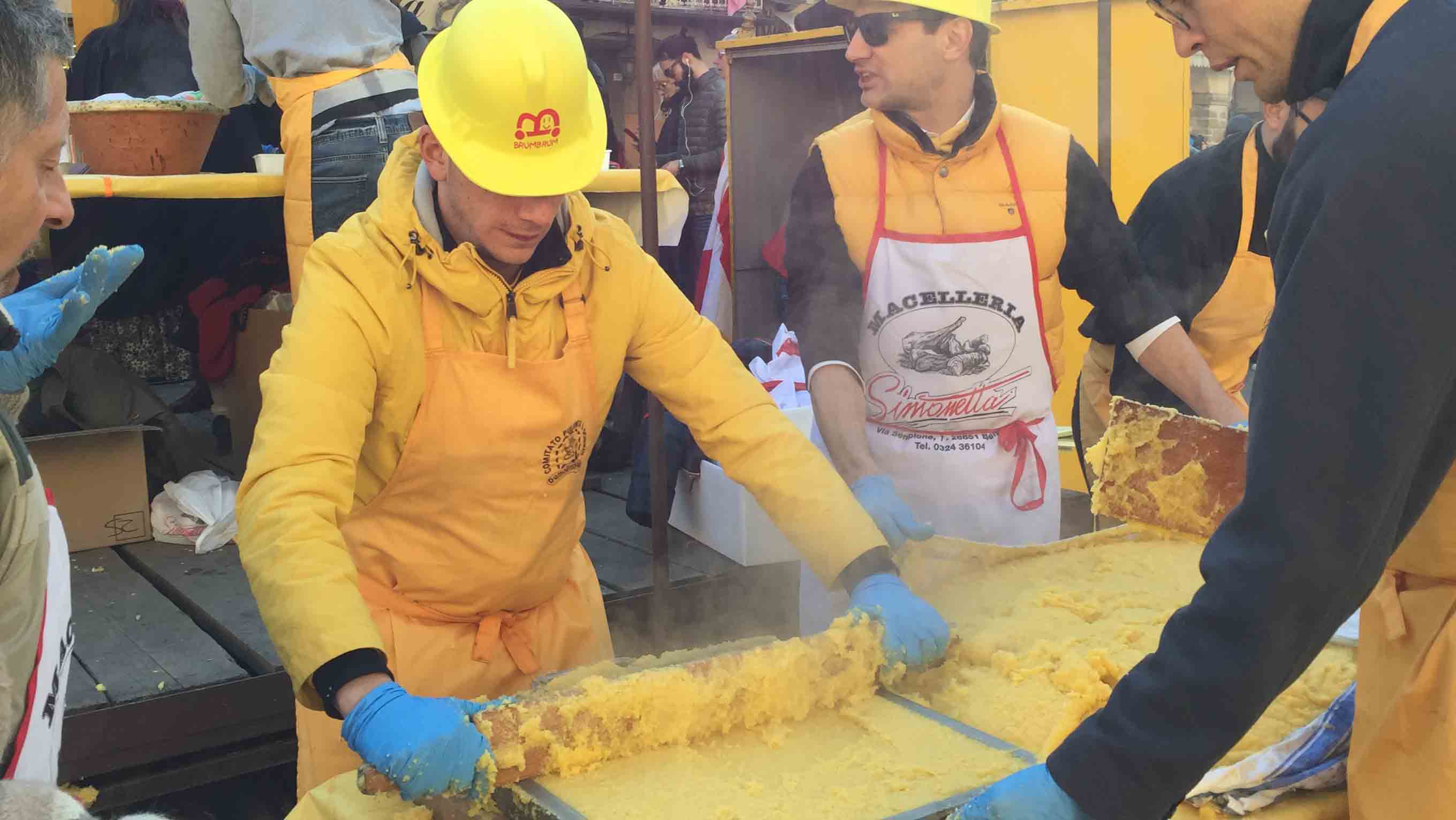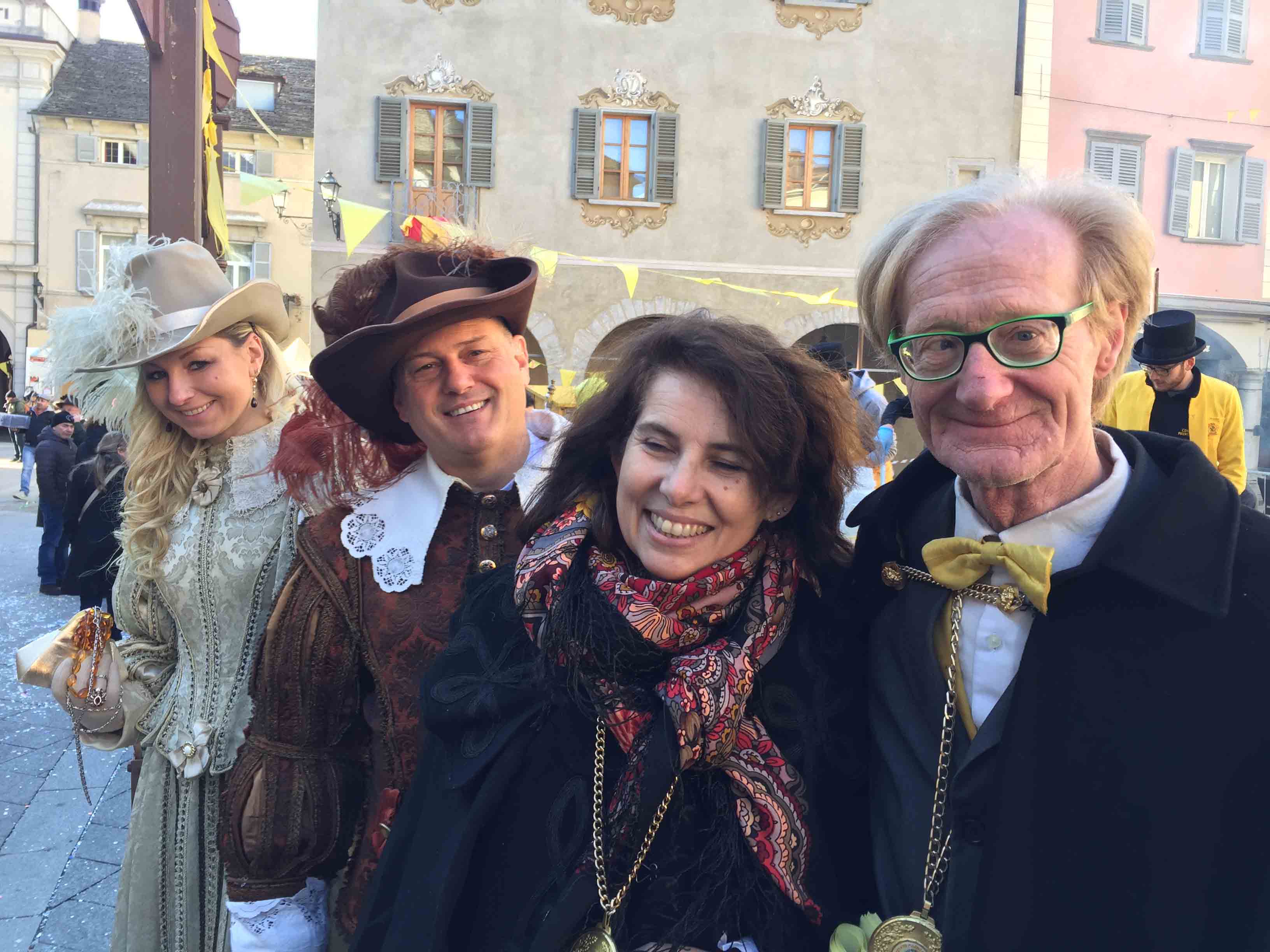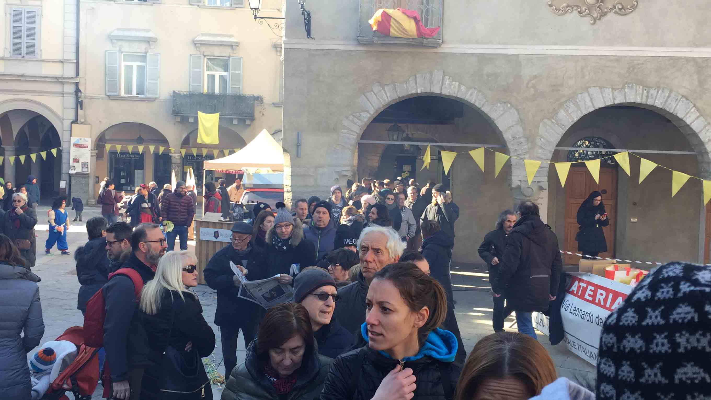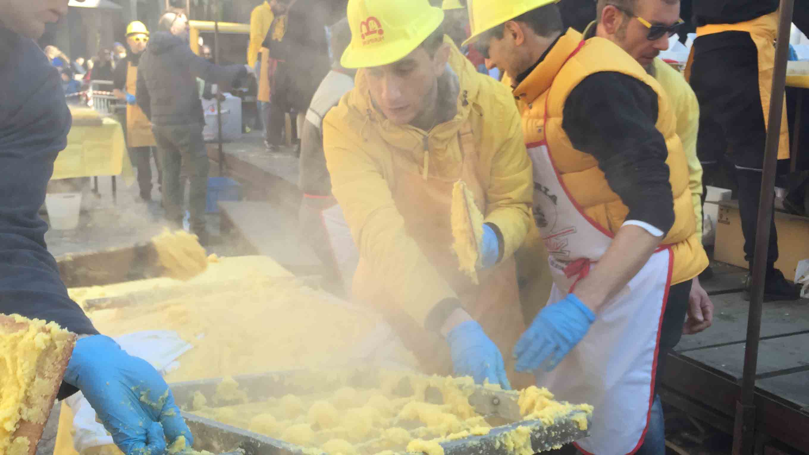 DOMODOSSOLA- 11-02-2018- Piazza Mercato affollata, come da tradizione, per la distribuzione di polenta e salamini del Carnevale. E' stata la Contessa di Mattarella ad assaggiare il primo salamino cucinato e dare così il via alla distribuzione, con i domesi in coda per la loro razione sulle due file a lato del palco. Applauditissima la banda di Simplon Dorf, che ha allietato con le sue musiche l'attesa per la polenta. Dalle 14,30 la sfilata e poi il matrimonio di Togn e Cia.
