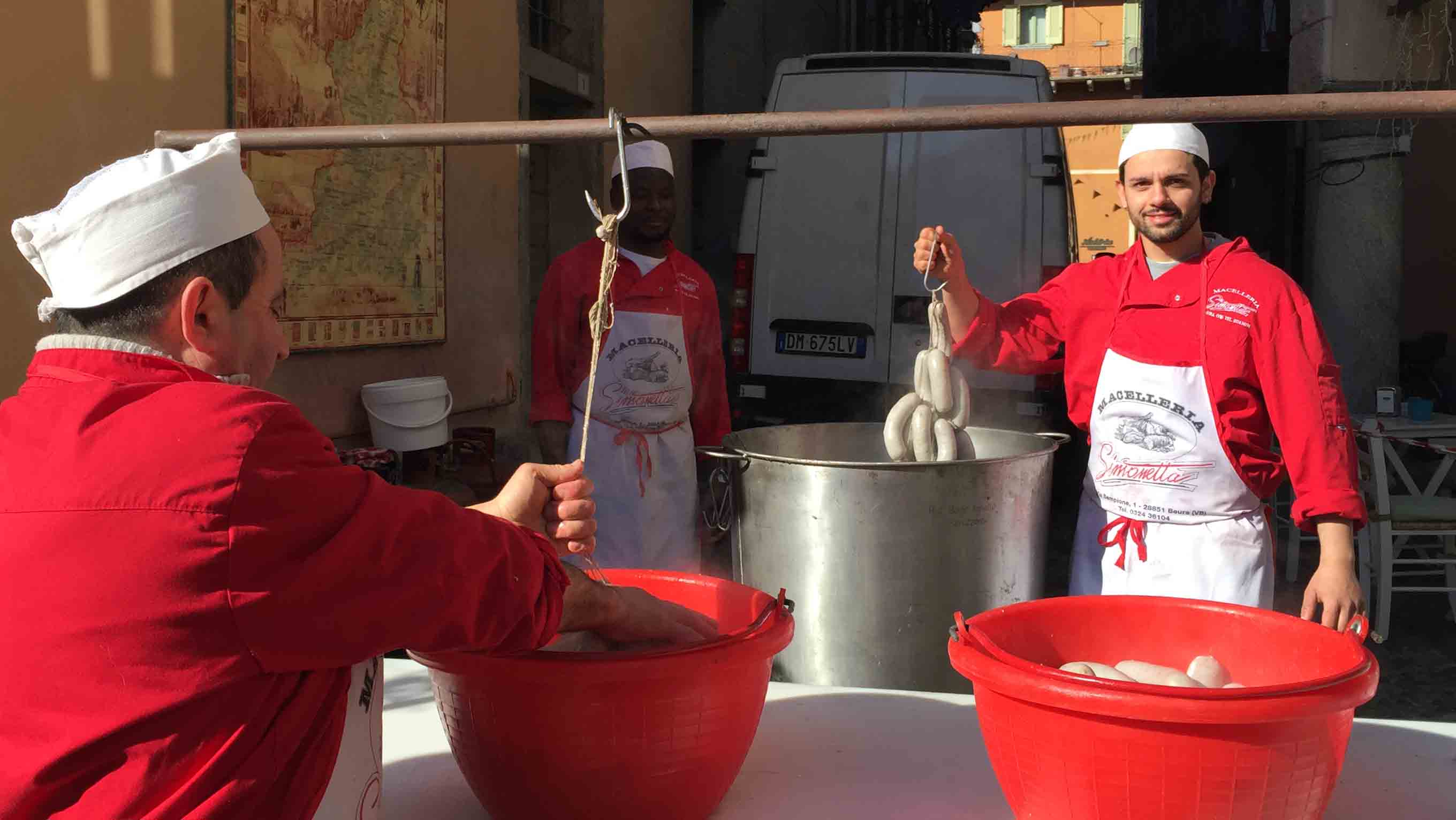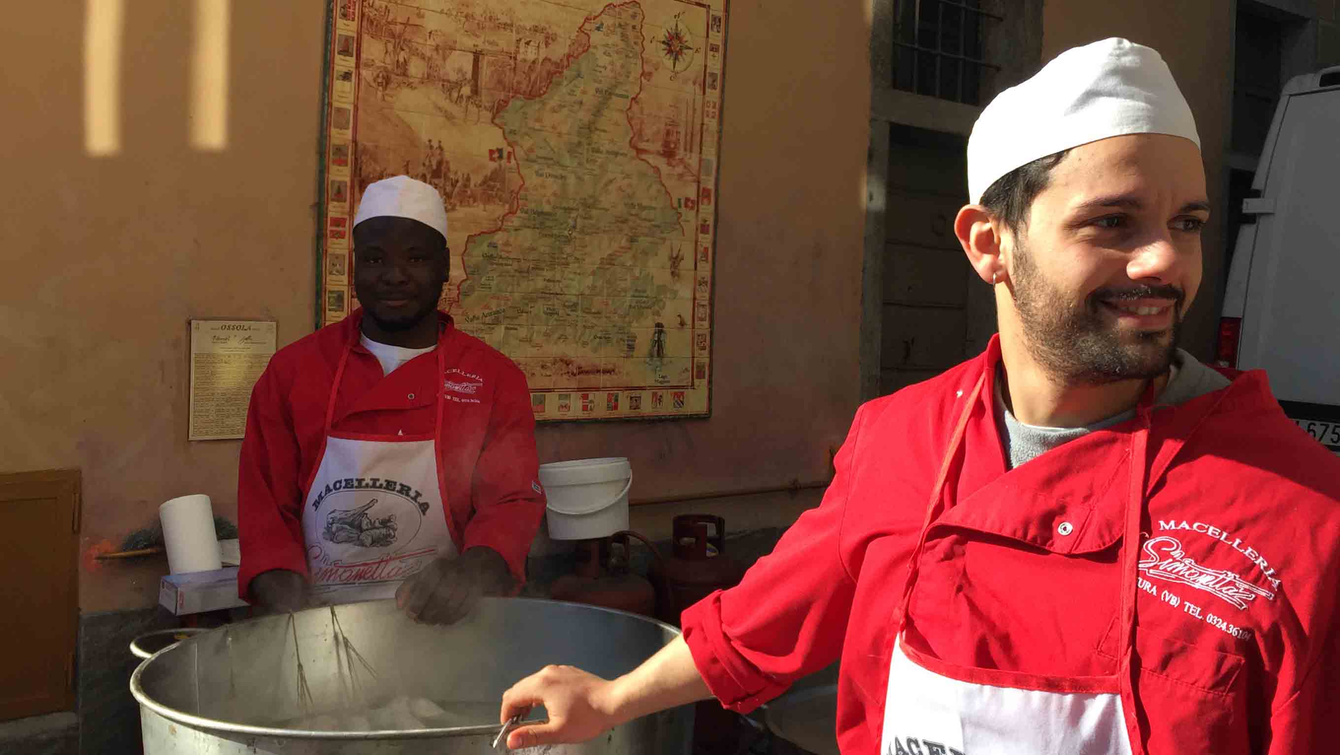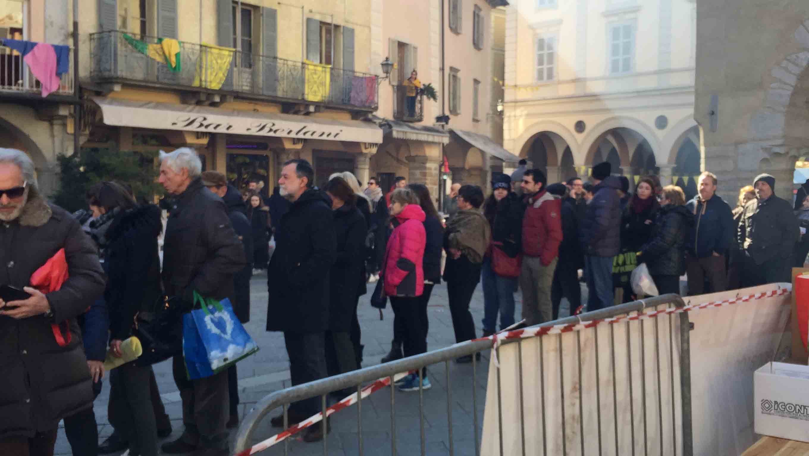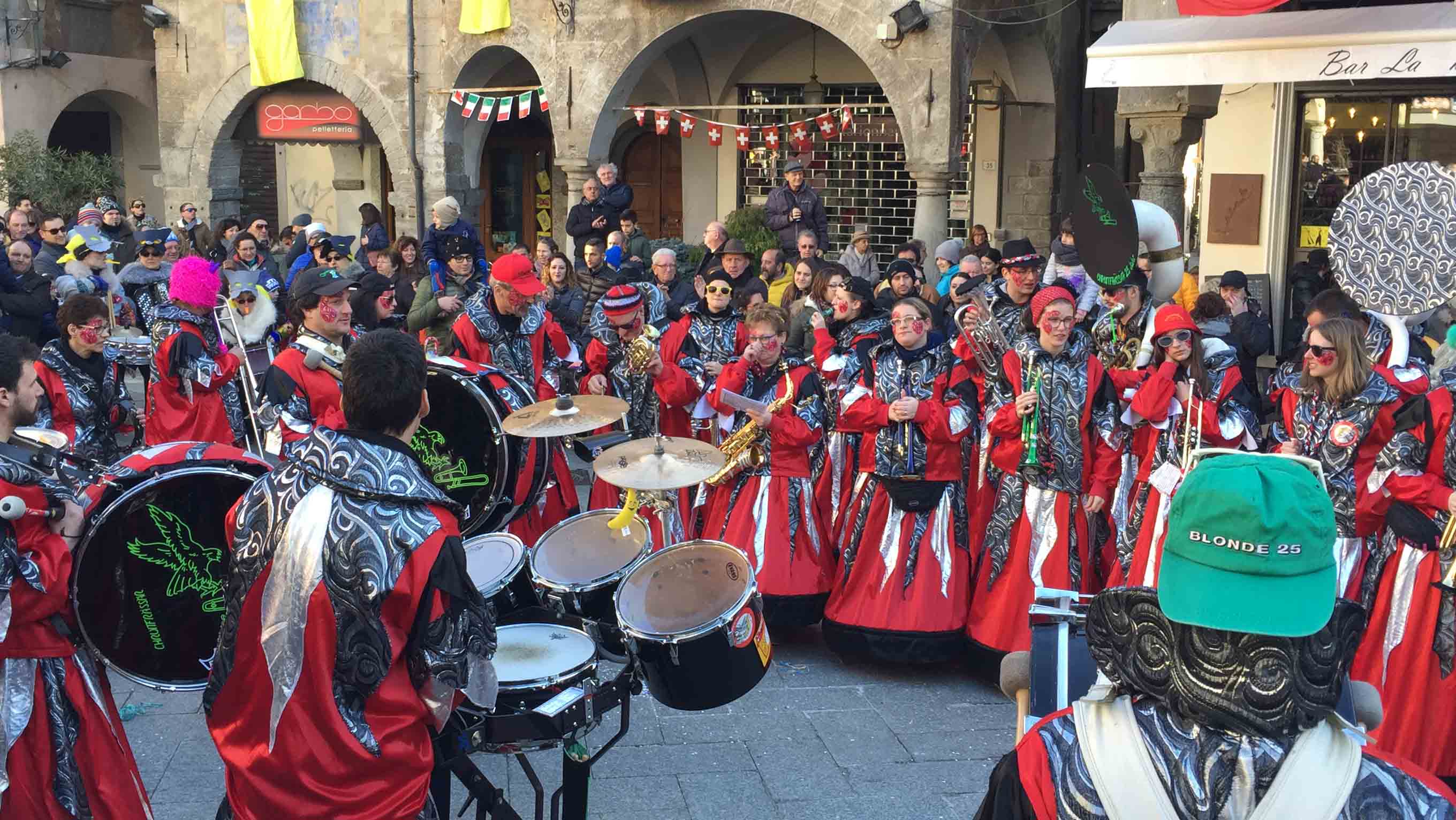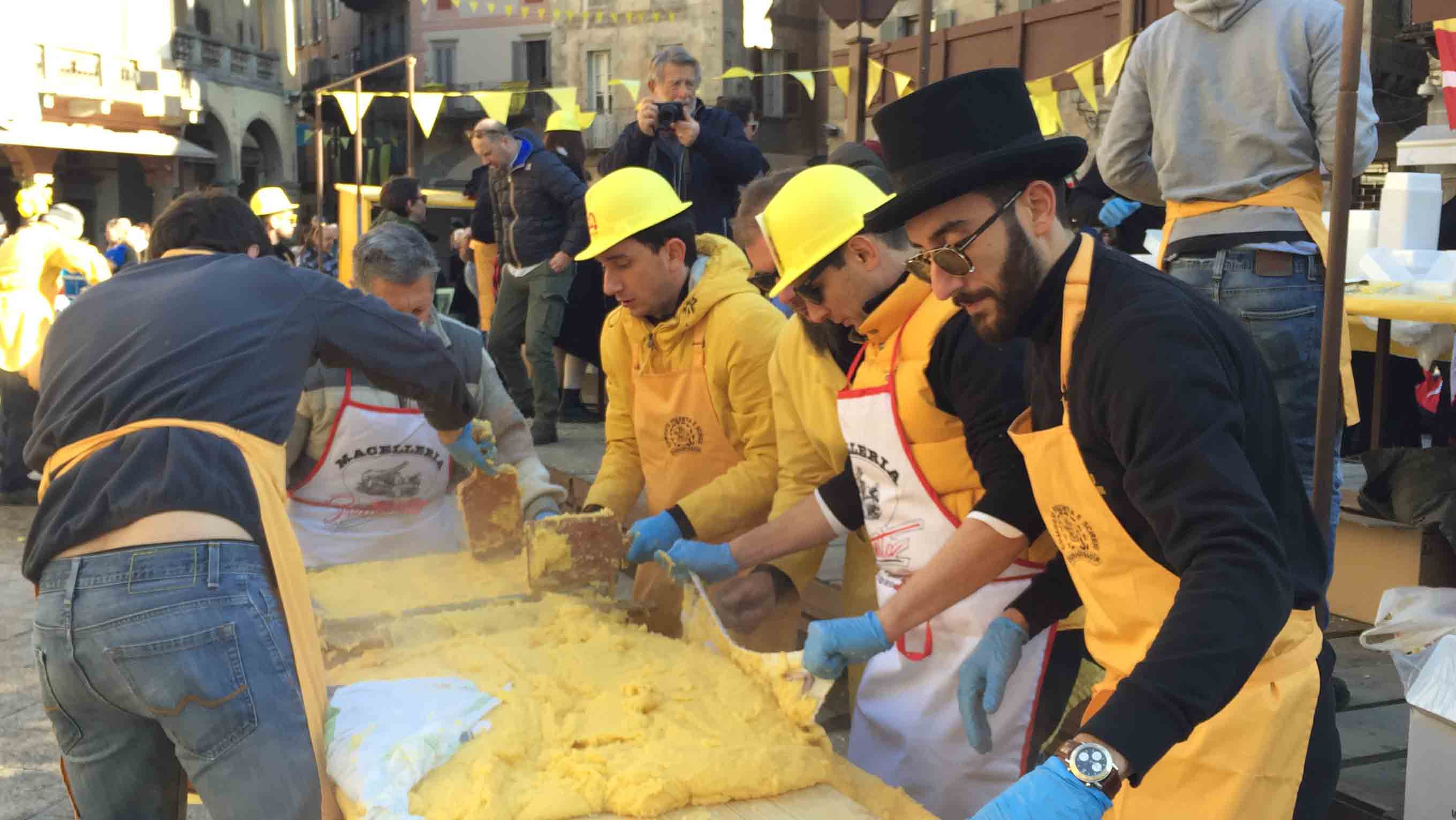 DOMODOSSOLA- 11-02-2018- Piazza Mercato affollata, come da tradizione, per la distribuzione di polenta e salamini del Carnevale. E' stata la Contessa di Mattarella ad assaggiare il primo salamino cucinato e dare così il via alla distribuzione, con i domesi in coda per la loro razione sulle due file a lato del palco. Applauditissima la banda di Simplon Dorf, che ha allietato con le sue musiche l'attesa per la polenta. Dalle 14,30 la sfilata e poi il matrimonio di Togn e Cia.