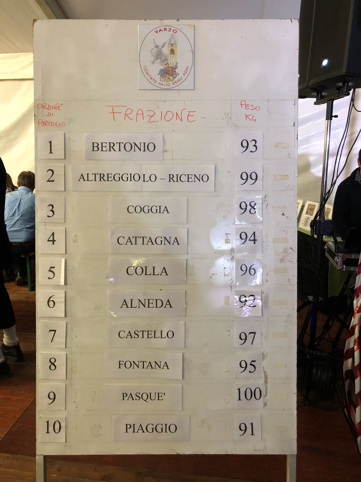Per quanto riguarda l’estrazione dei pesi la più fortunata è stata Alneda con 92 chilogrammi, mentre chi dovrà portare i temuti 100 chili sarà il Pasquè.