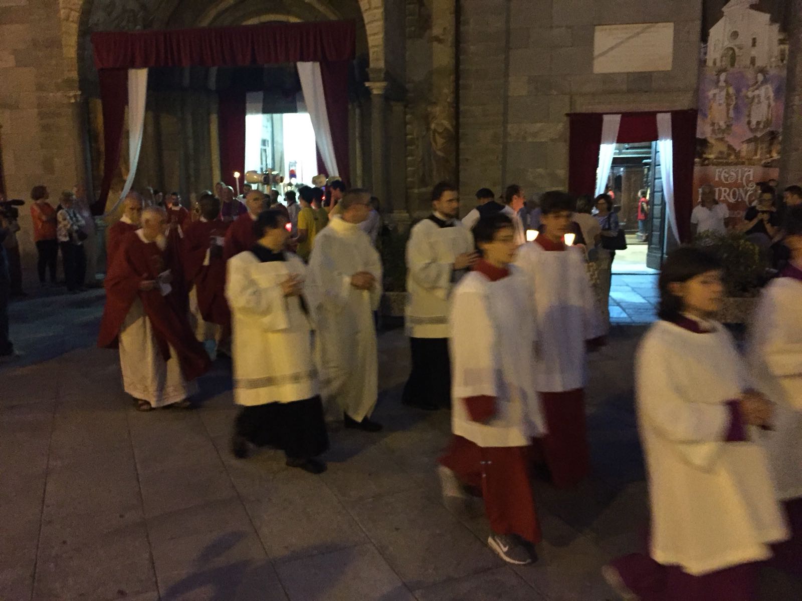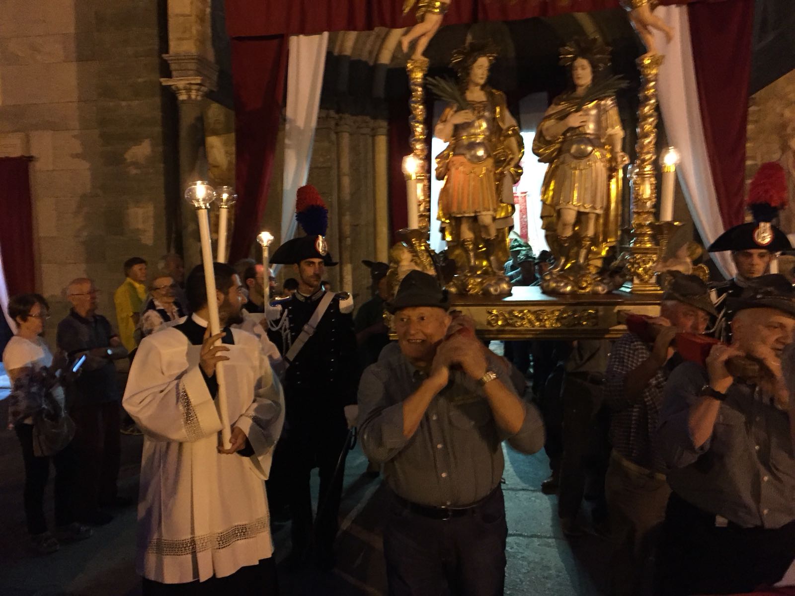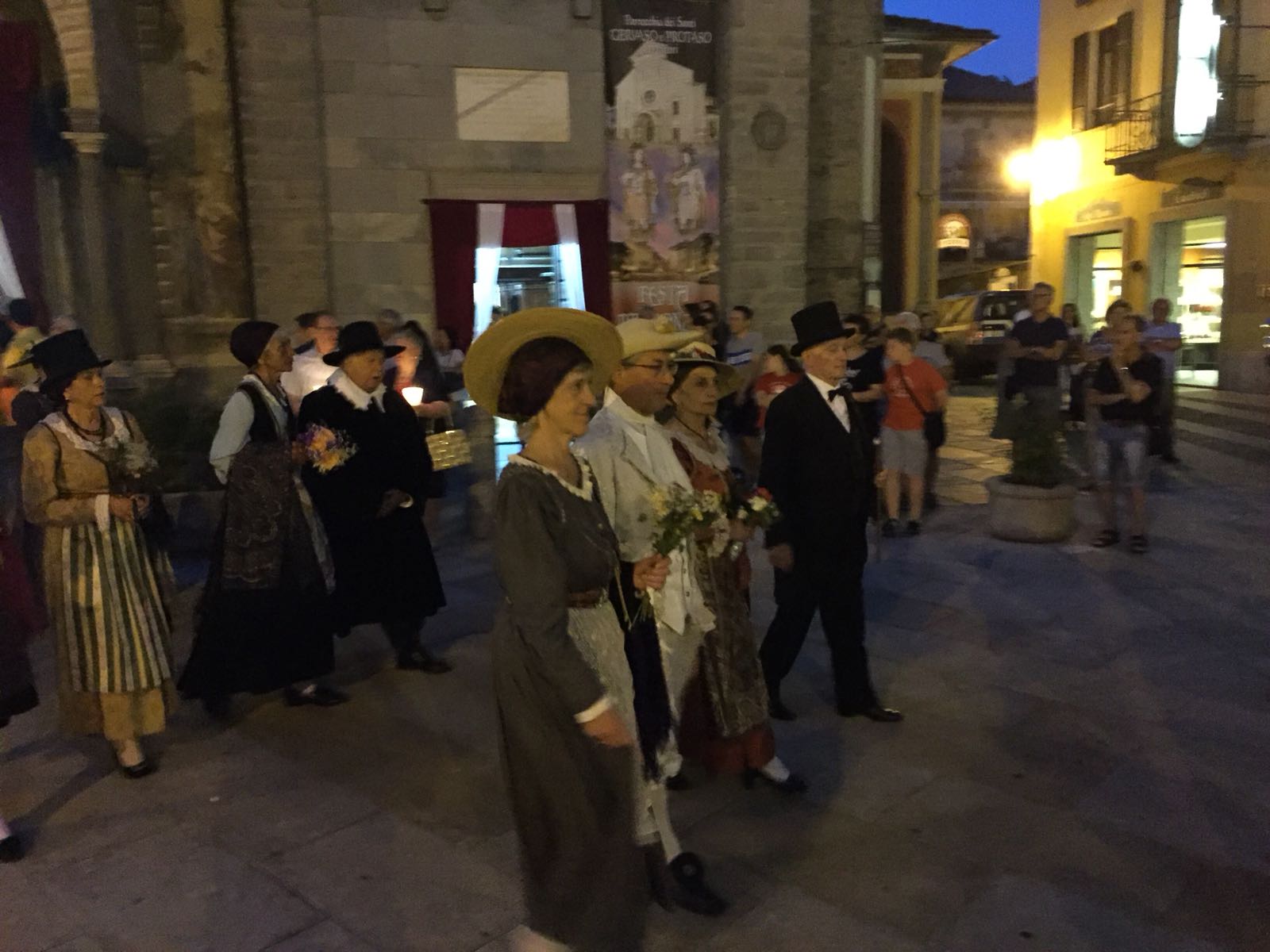 che martedì sera hanno partecipato alla tradizionale processione per la festa patronale domese in onore dei santi Gervasio e Protasio. Dopo la Santa Messa officiata dal vicario vescovile ossolano, e parroco di Domo, don Vincenzo Barone, che si è rivolto principalmente ai giovani ed al loro contributo per migliorare la società, è stato fatto uno scambio di doni col sindaco Lucio Pizzi, e sono stati onorati due collaboratori della Parrocchia con una targa. Ai presenti in collegiata è stato distribuito un opuscolo sui due santi Patroni. Poi è partito il lungo corteo con la statua dei Santi, che è stato portato dagli alpini per le vie cittadine. In processione oltre ai numerosissimi fedeli e religiosi anche la confraternita di Santa Marta, la banda cittadina, i gruppi folk, il sindaco Lucio Pizzi con diversi componenti della giunta, e le autorità militari locali. Variato il percorso della processione nelle vie domesi rispetto agli anni scorsi, quando si terminava in piazza Stazione, con la novità della benedizione alla città impartita dal parroco don Vincenzo Barone sotto il cedro di piazza Chiossi.
