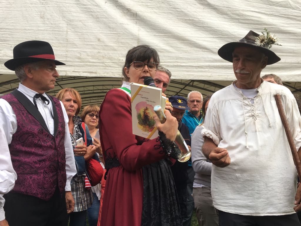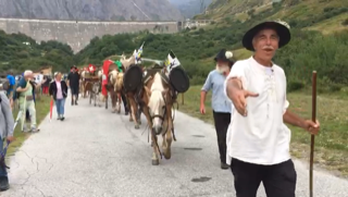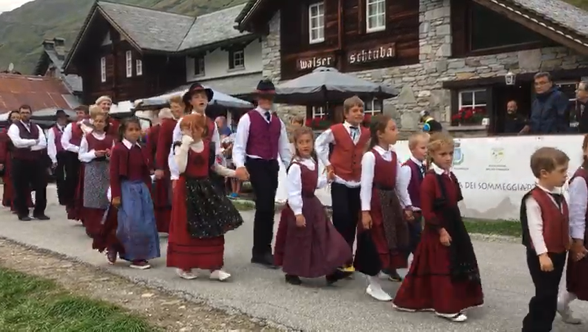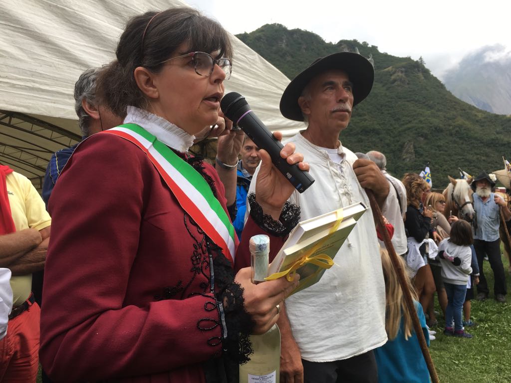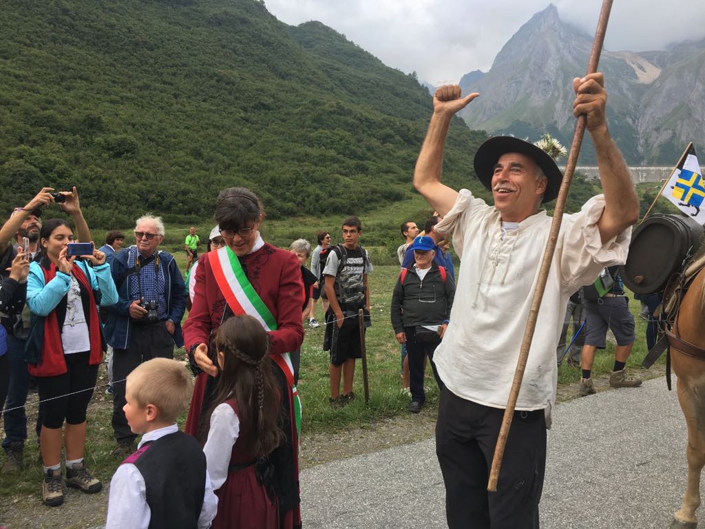 FORMAZZA- 23-08-2018- Il legame antico delle genti alpine e dei loro commerci è stato ancora una volta rinsaldato quest'oggi a Formazza, dove sono arrivati i someggiatori della Sbrinz Route 2018, carovana partita domenica da Lucerna ed attesa sabato a Domodossola col suo carico di formaggi trasportati da asini e cavalli. Bambini e donne in costume walser, le fisarmoniche, il sindaco Bruna Papa con fascia tricolore, tanti turisti, hanno accolto i circa cinquanta partecipanti, poi il consueto saluto ufficiale e lo scambio dei doni, quest'anno due libri dedicati alla valle ed il sempre apprezzato genepy locale. Ora la festa sino a tardi ed il meritato breve riposo in vista della partenza di domattina per Premia.