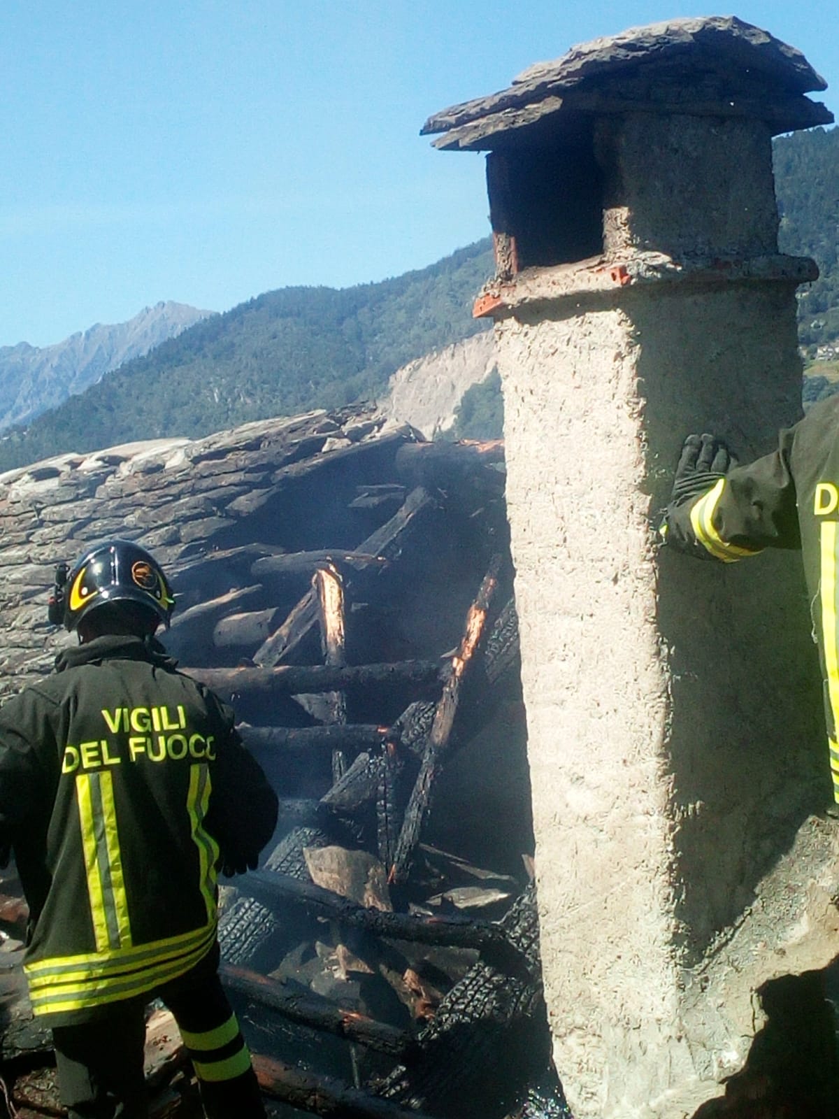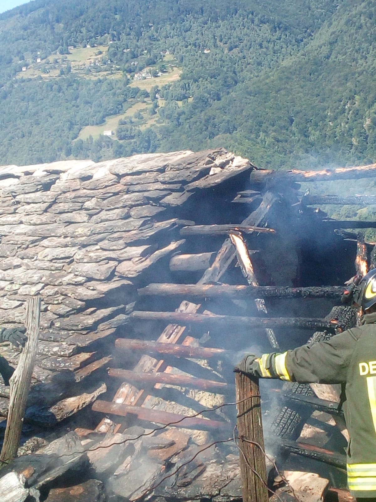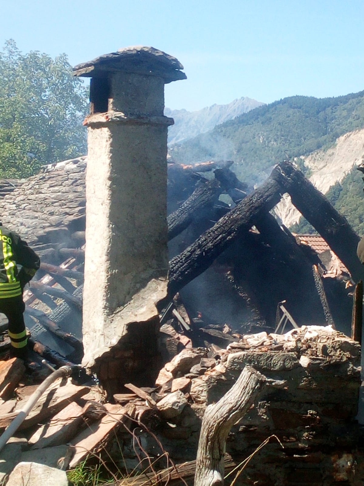 DRUOGNO- 26-08-2018- E' stato un problema alla canna fumaria a causare l'incendio sviluppatosi nel pomeriggio in una baita a Dalovio, alpeggio di Coimo di Druogno, che ha completamente distrutto il tetto. L'intervento per spegnere le fiamme e mettere in sicurezza l'area è durato diverse ore, sul posto, oltre ai carabinieri Forestali, i Vigili del fuoco di Santa Maria Maggiore e Domo e le squadre Aib.