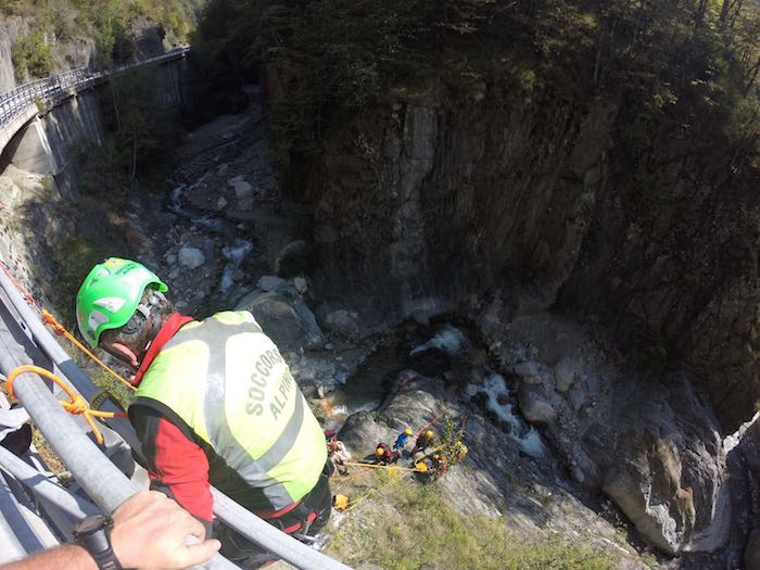 Il primo giorno le squadre si sono impegnate per soccorrere due canyonisti in difficoltà nel torrente della val Moriana, in alta valle Anzasca. La simulazione ha prodotto l'evacuazione in barella di un soggetto traumatizzato e l'accompagnamento protetto del compagno in condizione di forte stress.