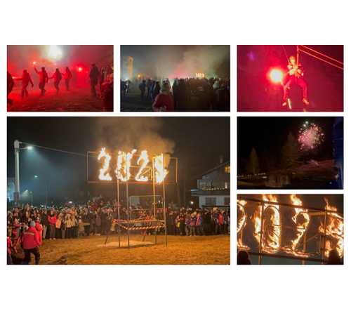 MACUGNAGA- 30-12-2023-- Anticipo di Capodanno ai piedi del Monte Rosa sabato sera. I maestri di sci della scuola di Macugnaga, con le loro fiaccole sono scesi con gli sci sulla pista del Belvedere, ed hanno poi raggiunto a piedi la scuola di sci a Staffa.