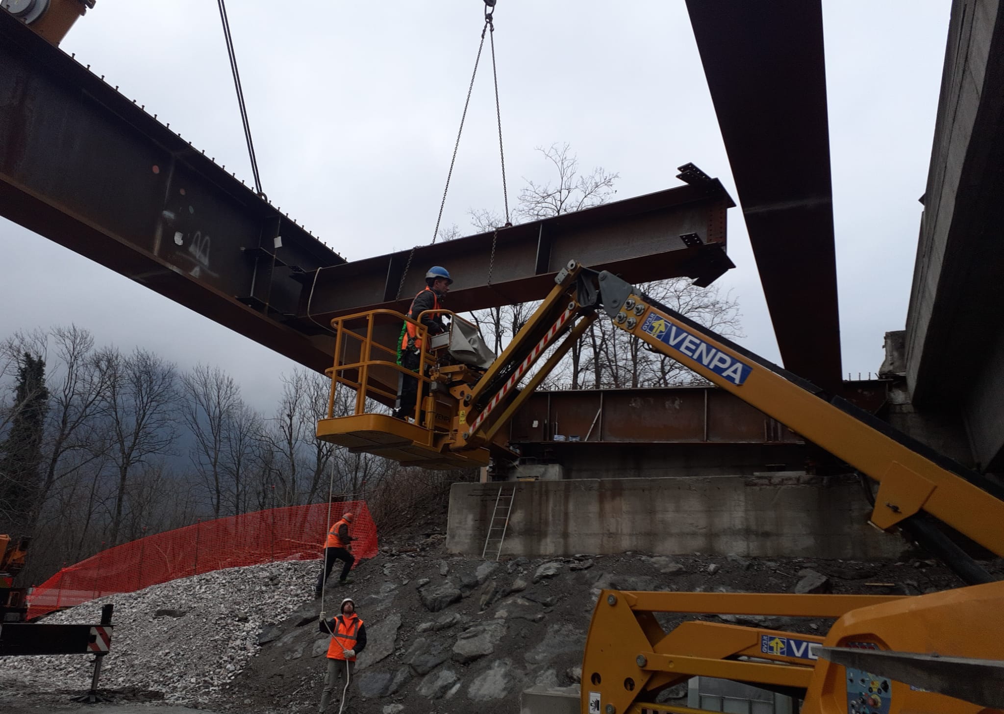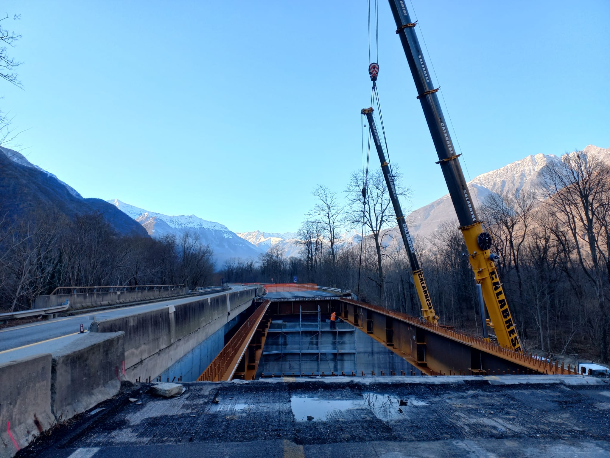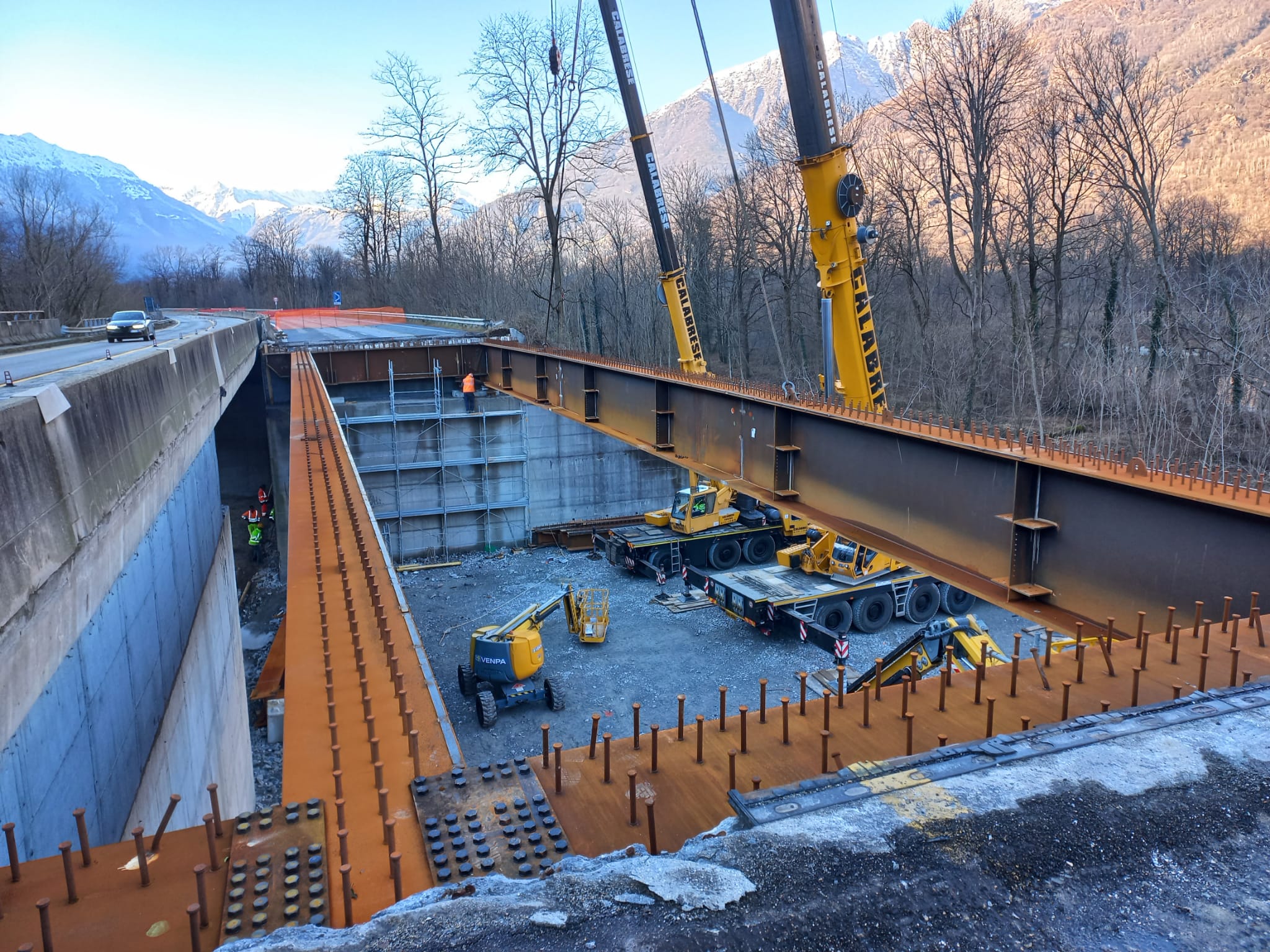 ORNAVASSO - 11-1-2024 -- Sono in corso le operazioni di varo dei due viadotti all’altezza del km 102 della statale 33 “del Sempione” a Ornavasso. Completata la demolizione dei vecchi impalcati ed eseguita la rimozione del materiale, nel corso delle scorse settimane sono state assemblate in cantiere le travi metalliche che costituiscono i nuovi impalcati, lunghi 36 metri ciascuno. Completato l’assemblaggio delle travi sono stati avviati i vari. Le operazioni sono condotte tramite autogru in grado di sollevare carichi fino a 200 tonnellate. Nei prossimi giorni proseguiranno i vari degli elementi di giunzione tra le travi.