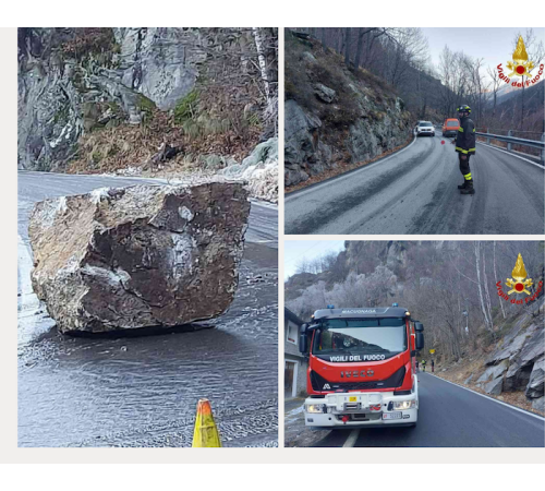 CEPPO MORELLI - 20-1-2024 -- In mattinata i Vigili del Fuoco di Verbania sono intervenuti in Comune di Ceppo Morelli per un masso di oltre un metro cubo precipitato sulla strada statale della Valle, SS 549, in località Campioli.