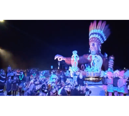 VALLE VIGEZZO - 13-2-2024 -- Le tematiche legate all'ambiente hanno dominato il Carnevale vigezzino. Diversi i carri e le mascherate "green" a sfilare, lunedì tra ali di gente. Numerosissima, nonostante il giorno feriale. decisamente ambientalista il carro di Toceno, dedicato alla crisi idrica e che s'è aggiudicato il primo premio. Un capo indiano il personaggio dominante, in basso, i figurati intenti in una danza della pioggia. La grande sfilata in notturna di lunedì ha conferito al Carnevale Vigezzino, che aveva sospeso la sfilata di domenica per il rischio pioggia, un'atmosfera del tutto particolare. Un'atmosfera particolarmente gioiosa. Chissà se la sfilata in notturna non possa diventare una tradizione nella valle dei pittori.