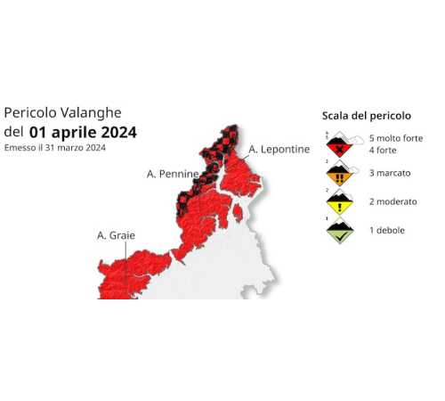 VCO - 31-3-2024 -- Anche domani, lunedì di Pasquetta,il bollettino di Arpa Piemonte annuncia allerta arancione per il rischio "Molto forte" di valanghe sulle montagne ossolane.