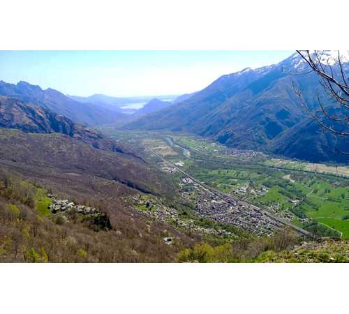 Lungo tratti anche molto ripidi arriviamo all’Alpe Sui di Sopra, 1220, dove troviamo baite, alcune diroccate (quasi un’ora e un quarto da Capraga). Qui si trova anche l’arrivo di un chilometro verticale che presumo parta da Vogogna, quota 226. E’ un bellissimo punto panoramico sull’Ossola e sul Monte Rosa. Merita la lunga pausa pranzo, in tenuta quasi da spiaggia. Con spirito d’avventura, che verrà premiato, in discesa ci teniamo a sinistra, dove, in corrispondenza di un ometto, inizia un sentiero molto evidente e pulito, indicato come “non segnalato” e “difficile” sulla cartina.