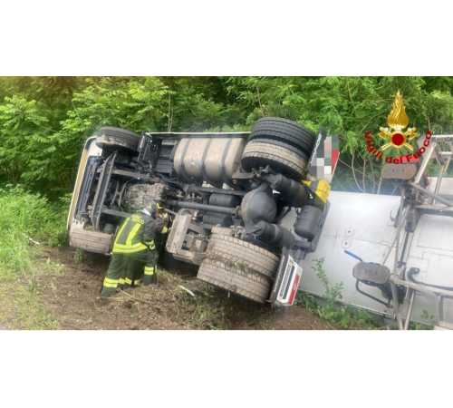 ORNAVASSO - 27-5-2024 -- I vigili del fuoco di Verbania con una squadra sono intervenuti quest'oggi sulla deviazione della strada ss 33 del Sempione tra Migiandone e Anzola, per il ribaltamento di un autotreno. Il mezzo, che trasportava materiale bituminoso, per cause in corso di accertamento, si è ribaltato su di un fianco. L'intervento è in corso e i vigili del fuoco stanno predisponendo il taglio di alberi per liberare il mezzo e lavorare in sicurezza. Una ditta privata provvederà alla messa in strada del trattore, del rimorchio e al travaso successivo del bitume. Nessuna persona è rimasta ferita e non si hanno notizie di danni ambientali da sversamento. Intervento lungo e delicato ancora in corso. Polizia stradale sul posto per i rilievi. Per il momento la strada è aperta ma verrà chiusa al traffico per consentire alle autogrù di lavorare.