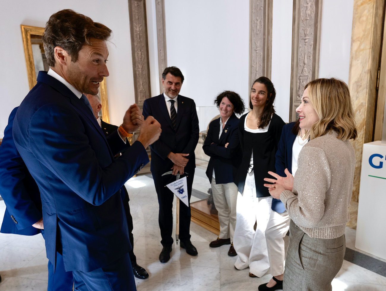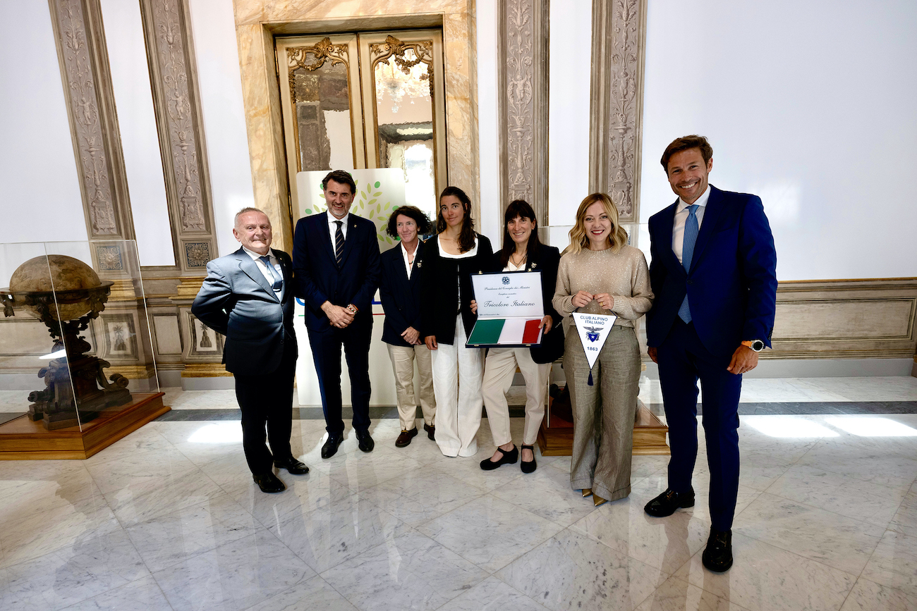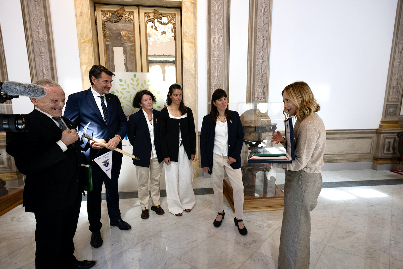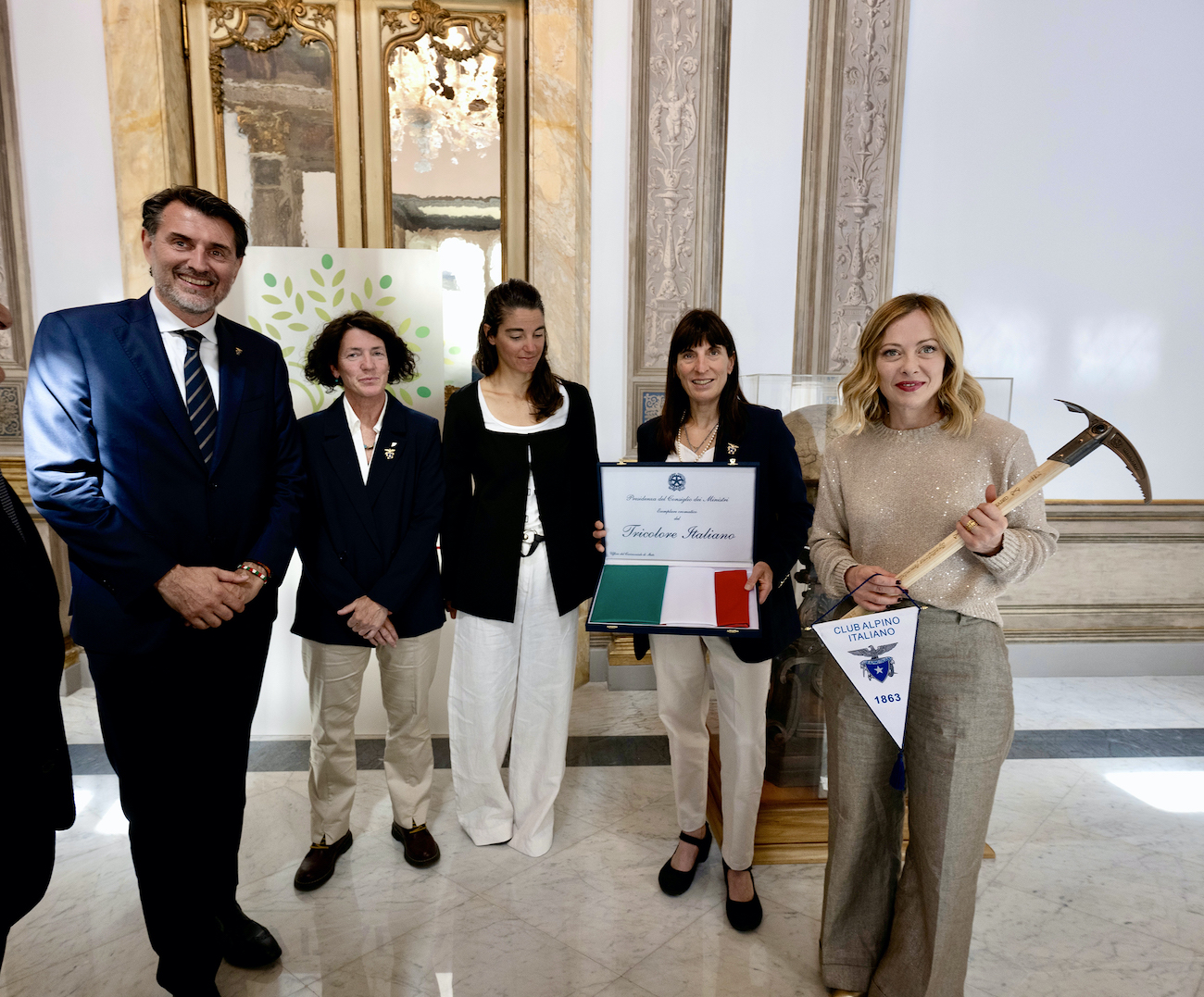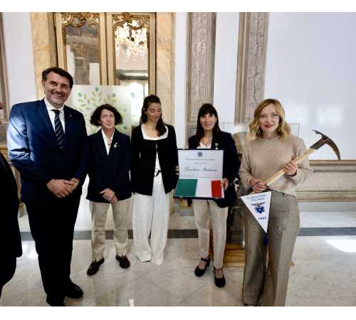 ROMA - 6-6-2024 -- C'erano l'alpinista ossolana Cristina Piolini, oltre al verbanese Antonio Montani, direttore generale del Cai, a Palazzo Chigi, l'altro giorno, per la consegna da parte della presidente del Consiglio, Giorgia Meloni, della bandiera italiana alla spedizione di donne che si recherà sul K2 per il 70° anniversario della conquista della seconda vetta del mondo da parte della missione italiana con gli alpinisti Lino Lacedelli e Achille Compagnoni, guidata da Ardito Desio.