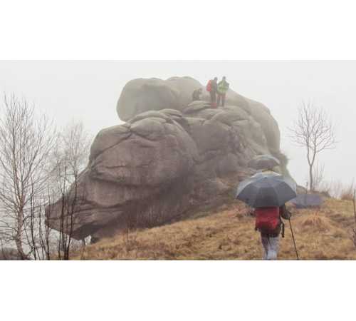 Panorama zero, pioggia sempre e velocemente scendiamo alla baita CAI, sul versante di Omegna, dove ci si asciuga e si pranza. Nella nebbia e sotto la pioggia ripartiamo in direzione nord — nord — est, scendendo lungo la pista di sci fino al caratteristico masso a forma di ippopotamo, che qualche ardito scala. Di qui si raggiungono l'Alpe Nuovo ed il rifugio del CAI Baveno, 1205, (quasi un'ora). Ancora una breve discesa e poi cinquanta metri di risalita fino al Monte Zughero, 1230 (un quarto d'ora). La pioggia dà un po' di tregua, ma il panorama è sempre assente. Si prende la direzione sud — est con un breve tratto di sentiero scomodo e ripido (l'unico dell'escursione).
