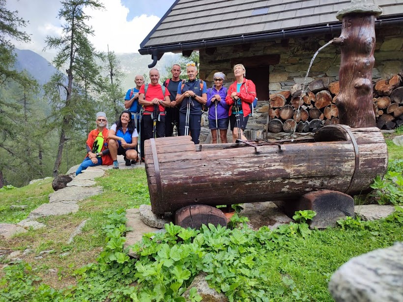 Rododendri, mirtilli, larici prendono il posto degli abeti e delle vaste praterie del versante sud. Raggiungiamo in pochi minuti l’Alpe Curtvel (Curtvello), 1756, con la sua bella fontana di legno e pranziamo vicino all’altrettanto bella baita. Ci manca molto oggi il buon caffè della badante esperta, presa da impegni di mamma. Riprendiamo la discesa nel bellissimo bosco di larici e su un lungo traverso verso oriente con scorci stupendi sul Pizzo Andolla e sul bacino dell'Alpe dei Cavalli, Cheggio per gli amici.