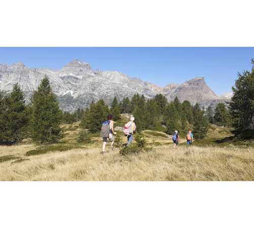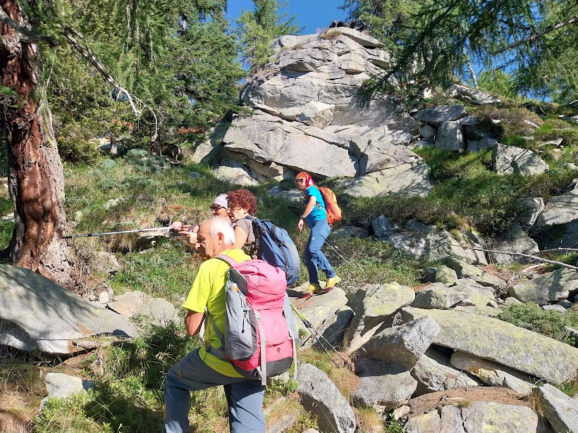 Un altro giovedì in Paradiso, nonostante i nostri peccati. A Corte Verde una freccia rossa su un sasso e la scritta “Nava” ci ingannano. Teniamo la destra seguendo un sentierino che, più in alto, si perde in uno splendido e ripido bosco di larici. Dopo rapide consultazioni prevale la saggezza della nostra età media elevata (escluse naturalmente le badanti) e torniamo a Corte Verde. Abbiamo perso quasi un’ora, ma in questa meravigliosa giornata va bene anche un approfondimento delle nostre conoscenze di un territorio nuovo e di grande bellezza.