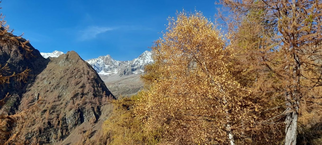 Il sentiero pianeggiante permette di godersi i primi panorami su Andolla e Weissmies che, salendo, si allargheranno sempre più, in un mix di pura bellezza abbinata agli splendidi colori dell’autunno. Dopo un’ora di cammino ecco l’Alpe Teste Inferiore, 1750 circa. Qui, con un piccolo aiuto dell’uomo, un sasso è stato trasformato nella testa di un cane, direi di razza San Bernardo, con la guancia destra decorata dal segno bianco e rosso del sentiero C26a. Breve pausa e si riprende a salire seriamente.