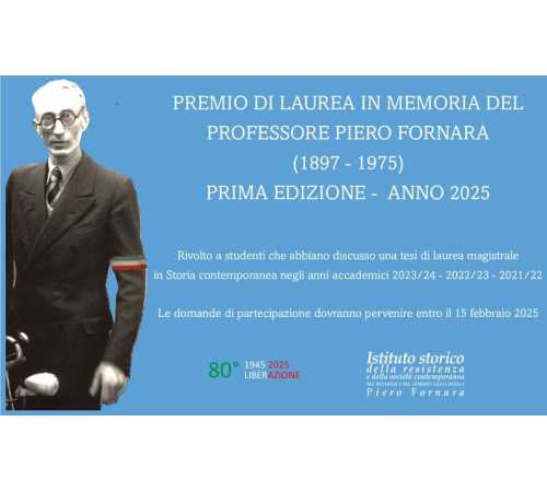 NOVARESE - VCO- 16-12-2024 --L’Istituto Storico della Resistenza e della società contemporanea nel Novarese e nel Verbano-Cusio-Ossola “Piero Fornara” bandisce la prima edizione del concorso per l’assegnazione di un premio per una tesi di laurea magistrale in Storia contemporanea in ricordo del Prof. Piero Fornara (Cameri 1897-Novara 1975).