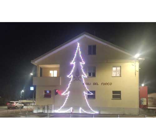DOMODOSSOLA- 25-12-2024-- Danneggiato il simbolo di Natale della caserma dei Vigili del Fuoco. La scorsa notte é stato strappata in due punti l'illuminazione che disegna l'albero di natale sulla facciata dell'edificio. Non é stato il vento, e manca qualche metro delle luminarie.