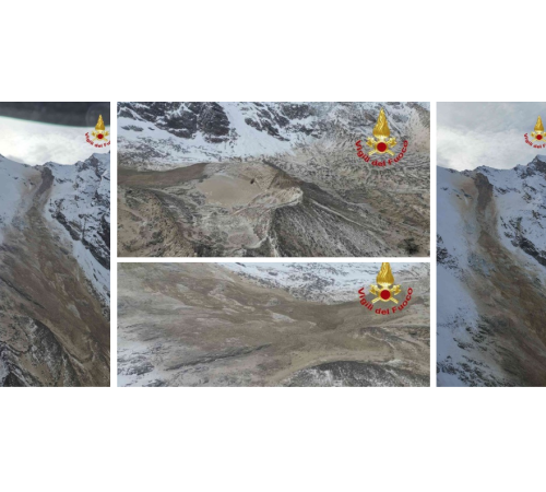 MACUGNAGA - 2-1-2024 -- Sono in corso le operazioni di monitoraggio del movimento franoso originatosi dal Colle delle Locce (3.200 m circa) che ha investito le aree sottostanti, ed in particolare gli accumuli sono giunti fino alla sponda est del Lago delle Locce (2.200 m circa).