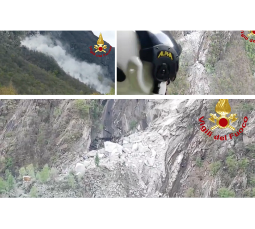 VARZO - 23-4-2025 -- Nel pomeriggio di ieri, i Vigili del Fuoco del Comando provinciale, con una squadra dalla sede di Domodossola e l'elicottero Drago 66 del Reparto Volo Piemonte proveniente da Torino, sono intervenuti per una frana sulla destra orografica del torrente Diveria.