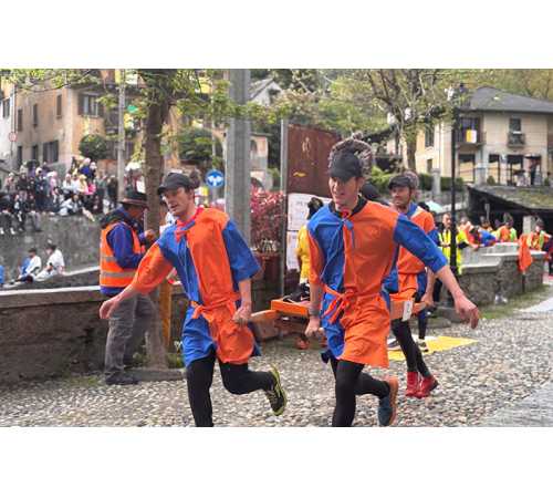 VARZO- 27-04-2025-- Il drago blu e arancione di frazione Cattagna รจ il vincitore del XV Palio degli Asini di Varzo 2025. In seconda posizione, distaccati di qualche secondo, gli "asini" della frazione Colla, terza frazione Coggia.