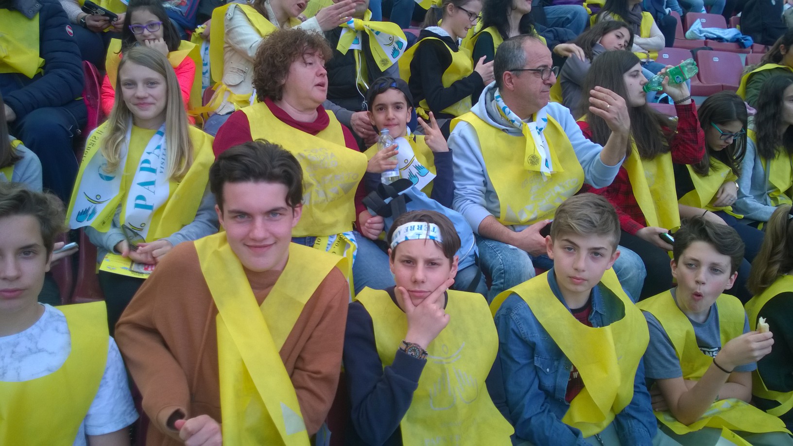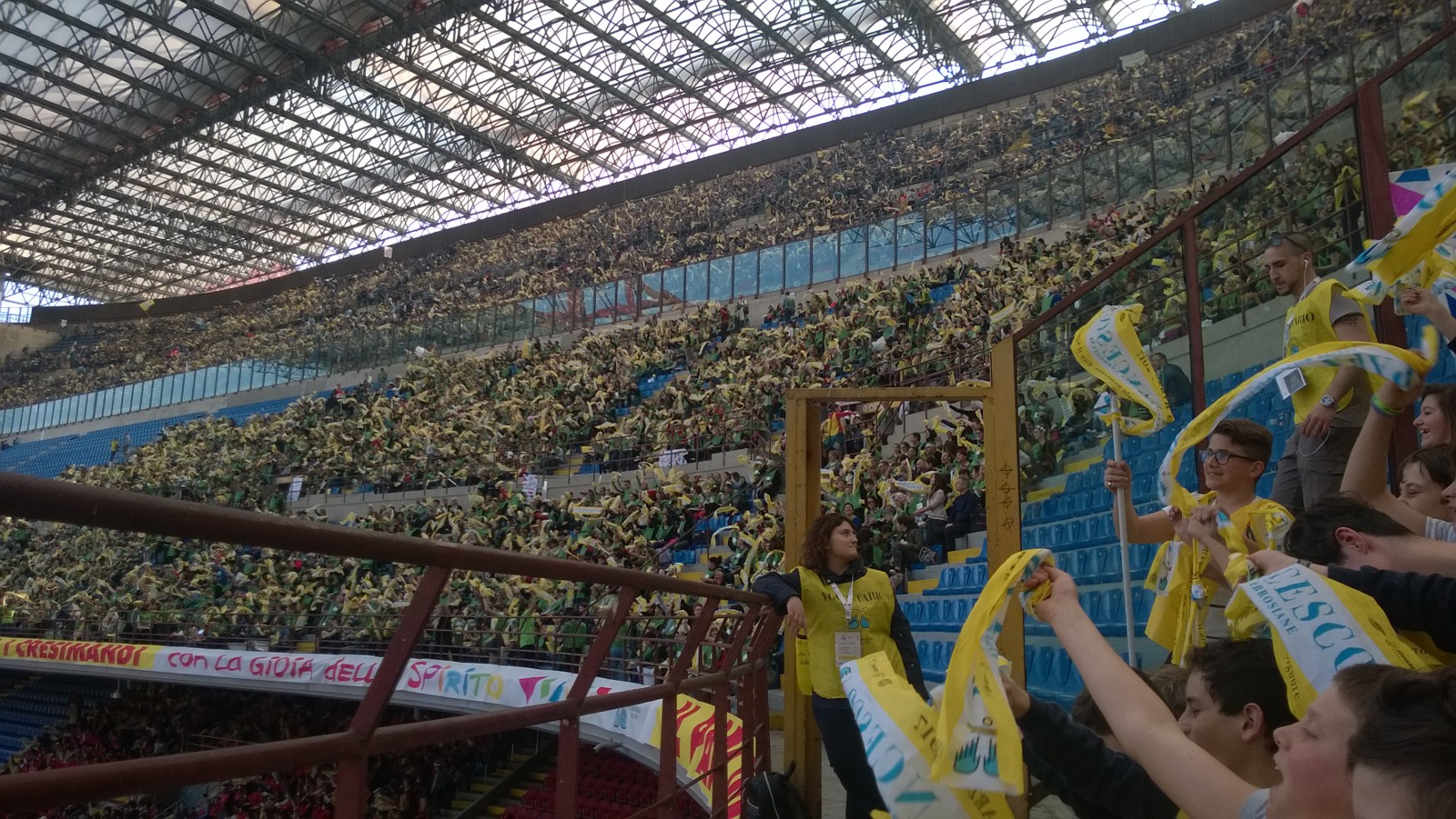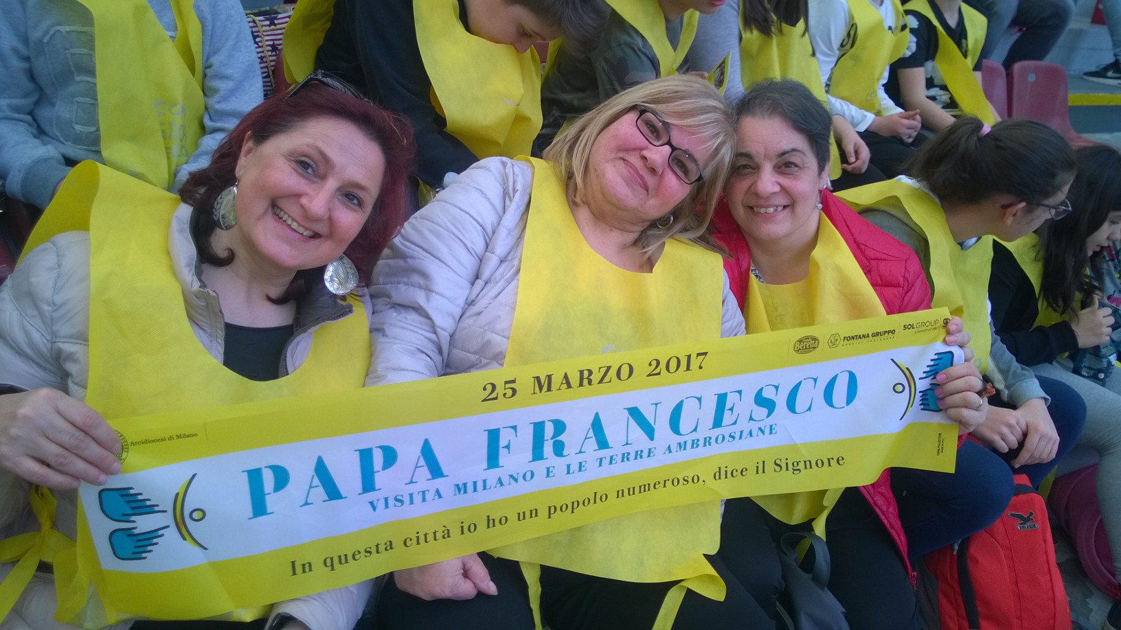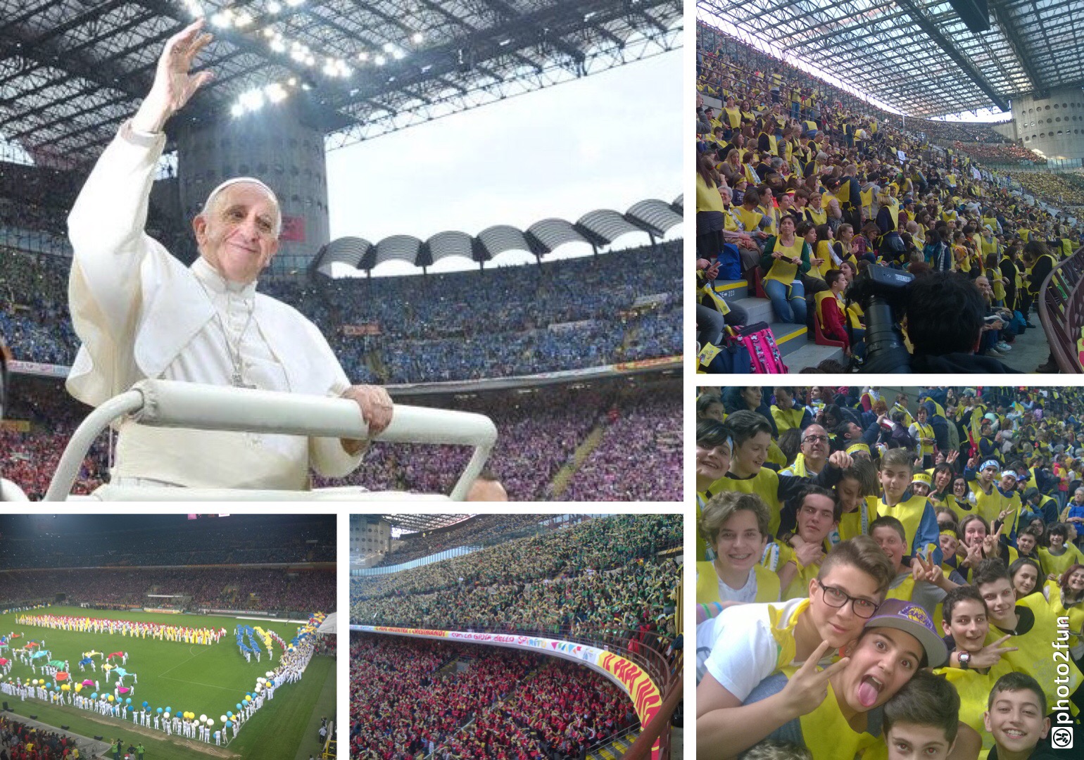 domesi della Statale e del Rosmini più qualche animatore del Liceo Sportivo Marconi-Galletti i presenti allo stadio San Siro di Milano per Papa Francesco: "L'occasione - spiegano i protagonisti- l'incontro con papa Francesco, semplice e toccante il suo discorso, incredibile e scenografica la location per gli 80.000 presenti totali. Baciati da un gran sole, dopo un momento di festa con band giovanili, il cantante Van des Fross e il comico Giacomo del trio Aldo-Giovanni-Giacomo finalmente l'arrivo di Francesco. L'importanza del dialogo con i nonni, il gioco sano, la condivisione e la solidarietà alcune delle tematiche affrontate. "Si arriva alla fede solo partendo dalla realtà, approfondendo seriamente ciò che quotidianamente si vive" ha detto. In serata, il rientro a Domo, nella straordinaria ordinarietà della vita".
