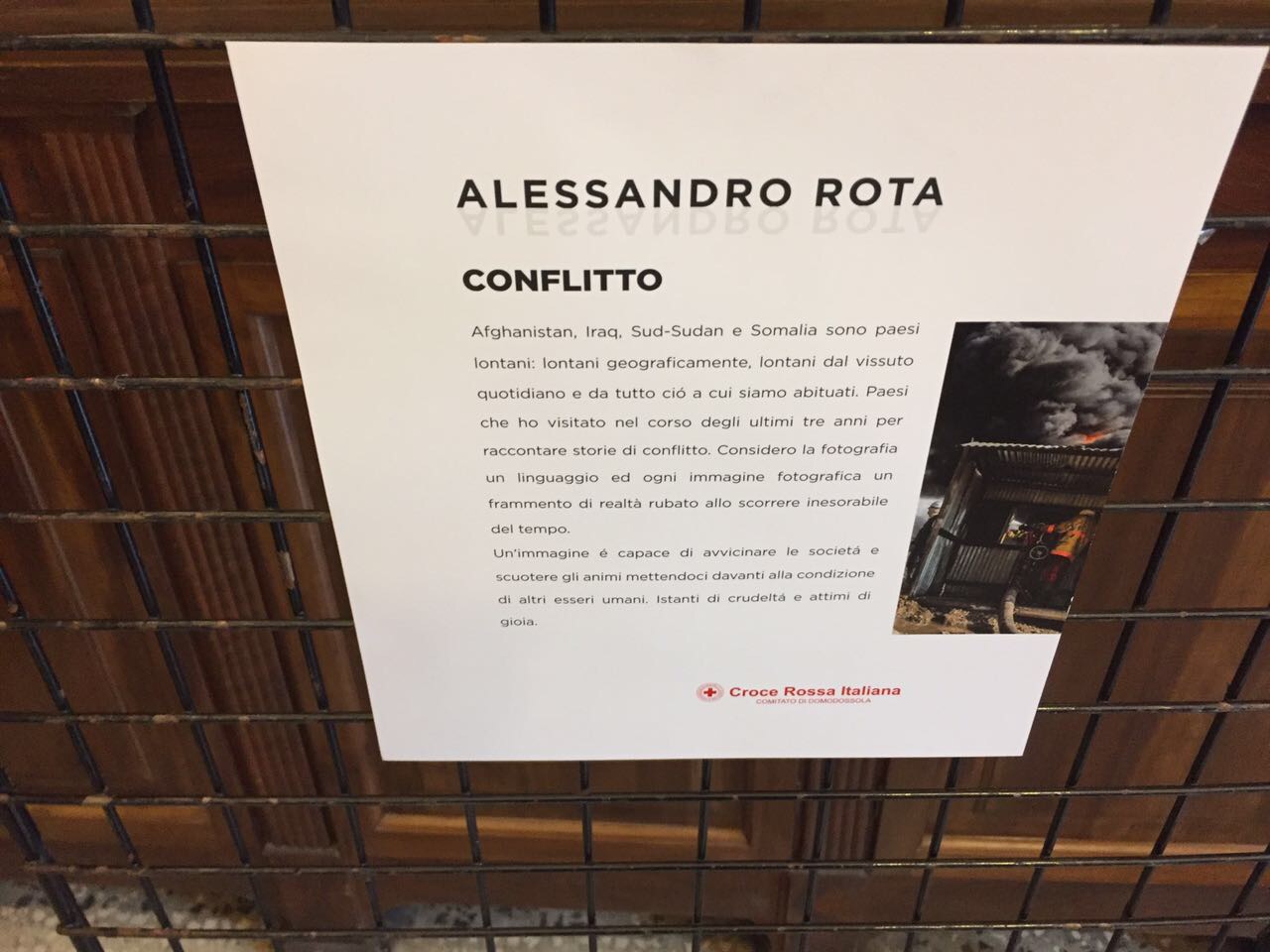 DOMODOSSOLA- 07-05-2017- E' stata inaugurata domenica mattina presso l’antica biblioteca del Collegio Rosmini la mostra fotografica intitolata “Conflict”, a cura del fotoreporter freelance ossolano Alessandro Rota, specializzato in reportage nelle zone di guerra. Nei giorni a seguire (fino a sabato 13/05), osserverà l’orario 16.00-18.30: “Ringrazio per l'organizzazione della mostra-spiega il fotografo ossolano- sono una dozzina di scatti realizzati negli ultimi anni di lavoro in scenari di guerra. Credo sia molto importante continuare a raccontare quello che succede a pochi chilometri da noi perchè le conseguenze le vediamo tutti i giorni anche qui. E' importante comprendere le dinamiche che succedono. Le foto sono state scattate in Sudan, Zambia, Tanzania, Somalia, Kenya, Iraq, Afghanistan, Libano ed Indonesia in quattro o cinque anni”.