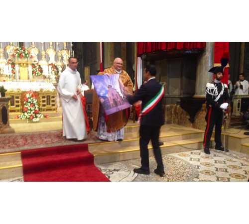 il primo cittadino si trova con due fasce, la seconda gli è stata donata ieri dal parroco di Domodossola don Vincenzo Barone in occasione della festa dei Santi Patroni. Al termine della messa il parroco ha chiamato all'altare Lucio Pizzi a ritirare due doni. Il primo una fascia da sindaco. “Un anno fa lei veniva eletto, una fascia già ce l'ha ma questa è benedetta”. Ha detto il parroco che è poi passato al secondo dono un quadro raffigurante la chiesa Collegiata. “Sono stato diverse volte al palazzo municipale – ha detto il parroco- ho notato diverse foto con gli scorci di Domodossola, ma tra queste manca la chiesa Collegiata”.
