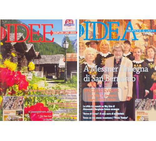 in distribuzione gratuita ed in migliaia di copie da quest'oggi. Nel mese di agosto le due copertine, dal lato in francese tedesco e dal lato in italiano, sono dedicate rispettivamente alla parete est del Monte Rosa ed a Rehinold Messner che ha ricevuto a Macugnaga l'insegna di San Bernardo. Tanti e di vari argomenti, inclusa la cronaca, gli articoli all'interno, ed in tutte e tre le lingue, oltre agli speciali dedicati alla festa di San Vito di Omegna ed alla Sagra della Patata di Montecrestese. IDEA si conferma uno dei migliori veicoli promozionali per il crescente e ricco mercato elevetico e l'unica vetrina (insieme al nostro sito in tedesco e francese www.wallis24.it) del nostro territorio in Vallese. Per il numero in versione pdf clicca qui