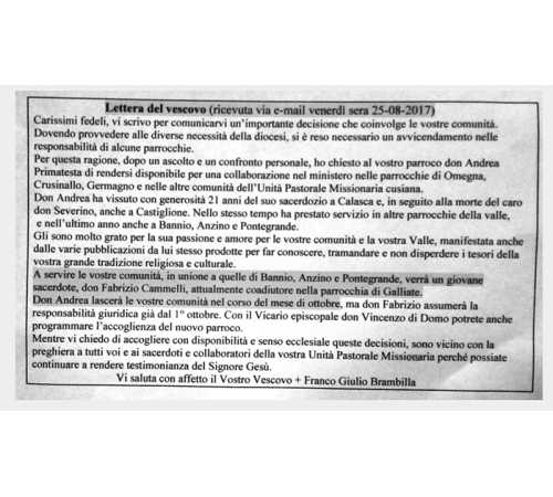 ANZASCA- 27-08-2017- C'è tristezza in valle Anzasca per la decisione vescovile di trasferire Don Andrea Primatesta, prevosto di Calasca e parroco di Castiglione Ossola, Bannio, Anzino e Pontegrande alla parrocchia di Omegna, Crusinallo, Germagno e nelle altre comunità dell’Unità Pastorale Missionaria cusiana.