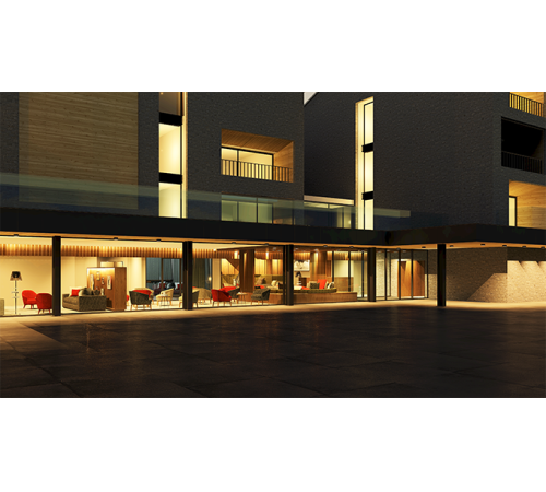 Non avendo San Domenico un centro storico, la nostra idea è stata quella di ricreare una piazza, tanti ambienti che fossero non solo di pertinenza dell'albergo, ma anche disponibili per tutti i fruitori di San Domenico, quindi i proprietari di seconde case, i turisti in generale, anche senza soggiornare in albergo. Quindi ci sarà il piano terra che raccoglie tutta una serie di servizi che vanno dal bar, con una zona fumatori dedicata, due ristoranti, uno più grande ed uno più piccolo molto caratteristico, una zona asilo supervisionata per i bambini, quindi per i genitori che magari vogliono andare a fare una escursione o intrattenersi quando poi ci sarà la Spa. Ci sarà anche una piccola sala proiezioni per dedicarsi magari con amici a vedere un film, o anche per godersi le riprese della giornata in montagna, e poi una serie di sale divise a zone, dominate tutte da camini di diverse dimensioni per creare una sorta di salotto dove trovarsi tra amici, anche se non si è ospiti dell'albergo, dove intrattenersi per condividere magari un cocktail o semplicemente anche un breve incontro di lavoro.
