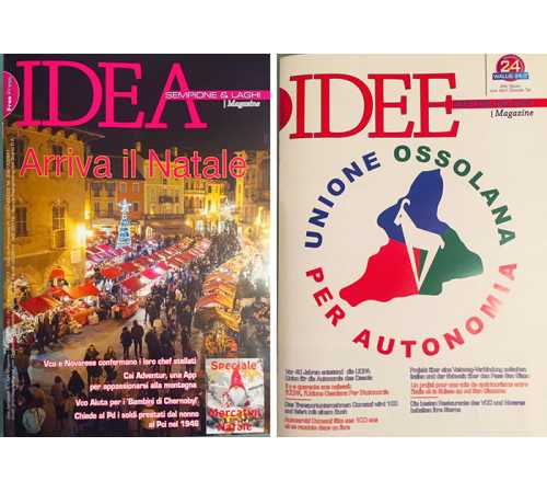 il nostro magazine free press distribuito in migliaia di copie che vanta un allegato con tutte le informazioni per i mercatini di Natale della provincia del Vco ed Arona. Proprio ai mercatini di Natale di Domo è dedicata la copertina dal lato in italiano. Su IDEE, il lato del nostro giornale deicato agli svizzeri, scritto in tedesco e francese, lo stemma dell'Uopa, l'Unione Ossolana per l'Auonomia, di cui in questi giorni si celebra il 40° dalla fondazione. Sono oltre un migliaio le copie del giornale scaricate dal web.