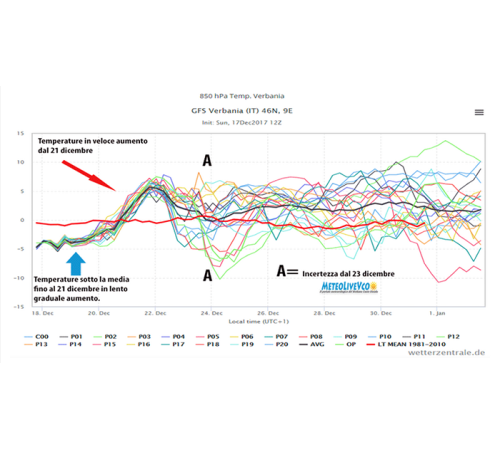 come ci spiega Luca Sergio di meteolivevco.it annunciano tempo stabile e soleggiato per tutta settimana, con un graduale ma lento aumento delle temperature: “Il tempo nella settimana che ci porterà alle feste natalizie sarà stabile e soleggiato. Prima nelle prossime 36 ore saremo interessati da una goccia fredda in quota che valicherà le Alpi. Porterà ancora neve da sconfinamento sulla cresta di confine e nelle testate vallive dell’Ossola, ancora molto vento da nord. A seguire un lento graduale aumento delle temperature fino a una improvvisa impennata tra il 21 e il 23 dicembre quando, sotto l’effetto favonico, le temperature potrebbero schizzare fin verso i 15°C. Sta dunque per finire questa fase fredda e sotto le medie del periodo di dicembre 2017. Il dopo, dunque per i giorni festivi, è caratterizzato da molta incertezza, le lettere A, nell’immagine sopra, stanno a indicare la forbice molto larga delle possibili evoluzioni, anche se la tendenza è per un periodo di temperature sopra la media, rimane dunque alquanto arduo prospettare cosa potrebbe accadere. Voci di corridoio dicono a una possibile svolta per le sorti dell’inverno, si prospetta il superamento della soglia NAM che rafforzerebbe il vortice polare, SC ( stratcooling). Questo risulterebbe forte e compatto per un periodo di circa 60 giorni. Lo spettro di un’altro inverno caratterizzato dall’assenza di precipitazioni, inversioni termiche e temperature sopra la media è alle porte?”.