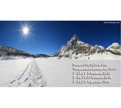all'alpe Devero, come ci spiega Luca Sergio da Meteolivevco.it: “L’ondata di gelo che sta interessando il territorio di sicuro non sarà ricordata come la più lunga, ma al terzo giorno le temperature registrate si avvicinano al famoso 2012. Da podio in seconda posizione i -26.1°C registrati oggi dietro ai -27.6°C del 5 febbraio 2012. La terza piazza è del lontano 1995 quando si registrarono, in gennaio, i -24.8°C.