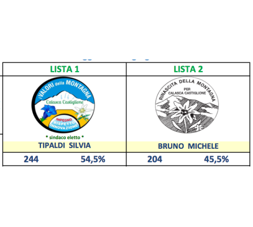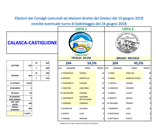 come sindaco di Calasca Castiglione, ha vinto col 54,5% delle preferenza, battendo il suo avversario Michele Bruno, fermatosi sul 45,5%. Ecco, di seguito, i voti presi dai vari consiglieri, in giallo quell iche entreranno in consiglio: