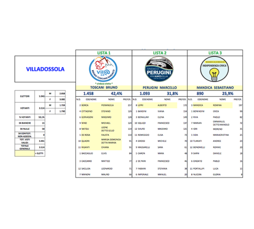 che hanno votato Bruno Toscani come sindaco di Villadossola, a fronte delle 1093 che hanno scelto Marcello Perugini ed gli 890 che hanno votato per Sebastiano Mandica. Di seguito i voti dei singoli candidati nelle liste ed evidenziati in giallo i nuovi consiglieri comunali.